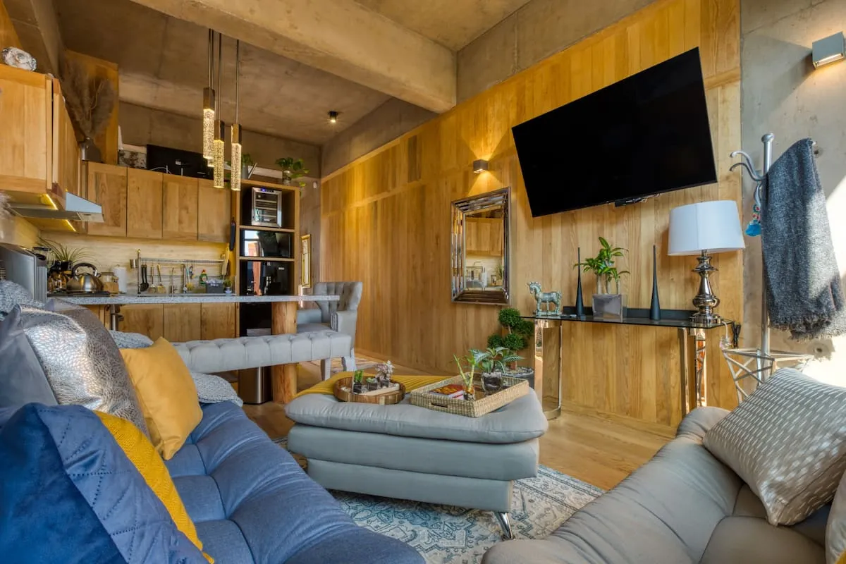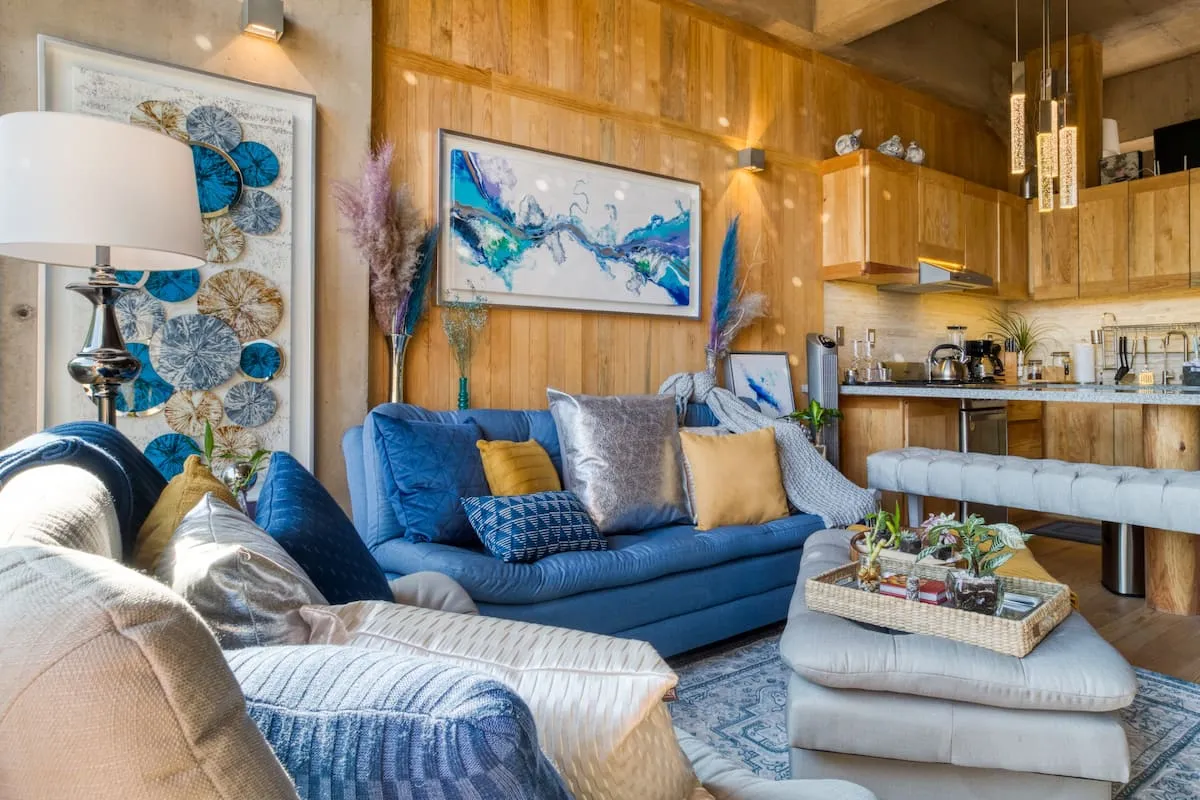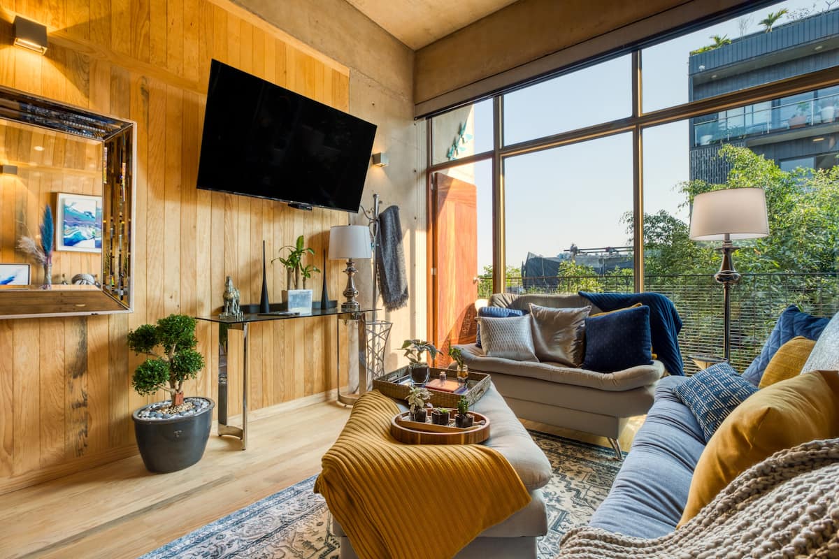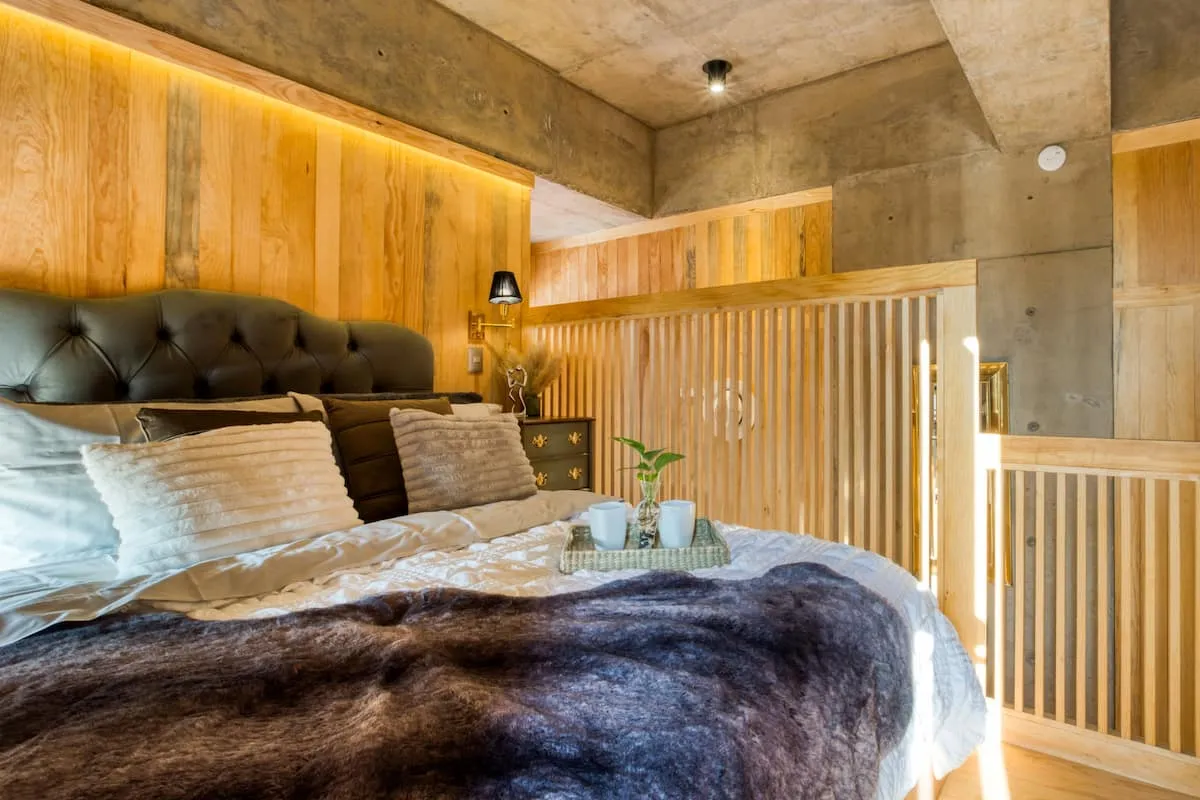 This apartment is a loft featuring a queen bed. The sofa in the living room can also be used as a sleeper sofa.