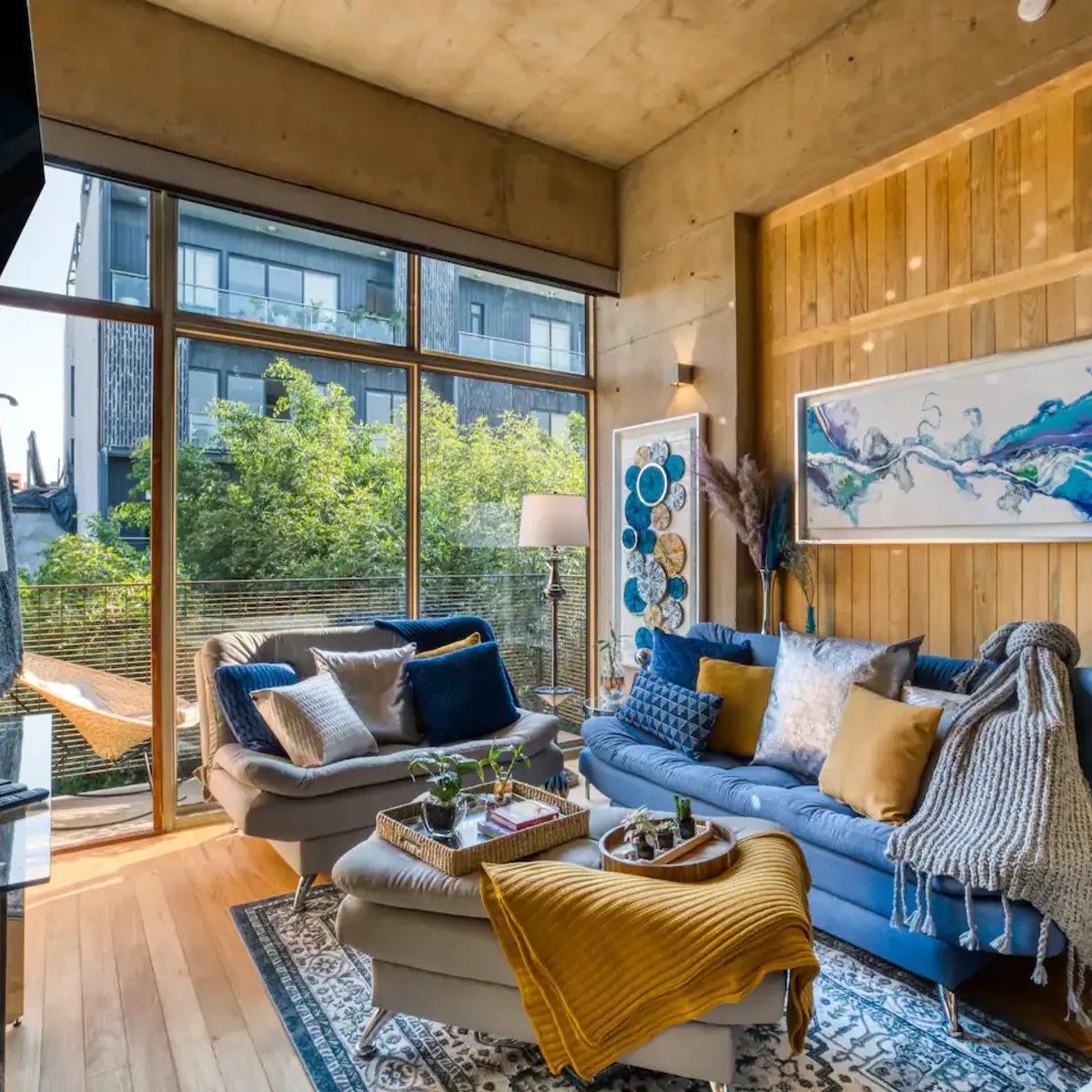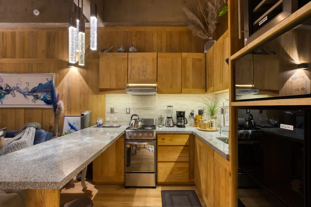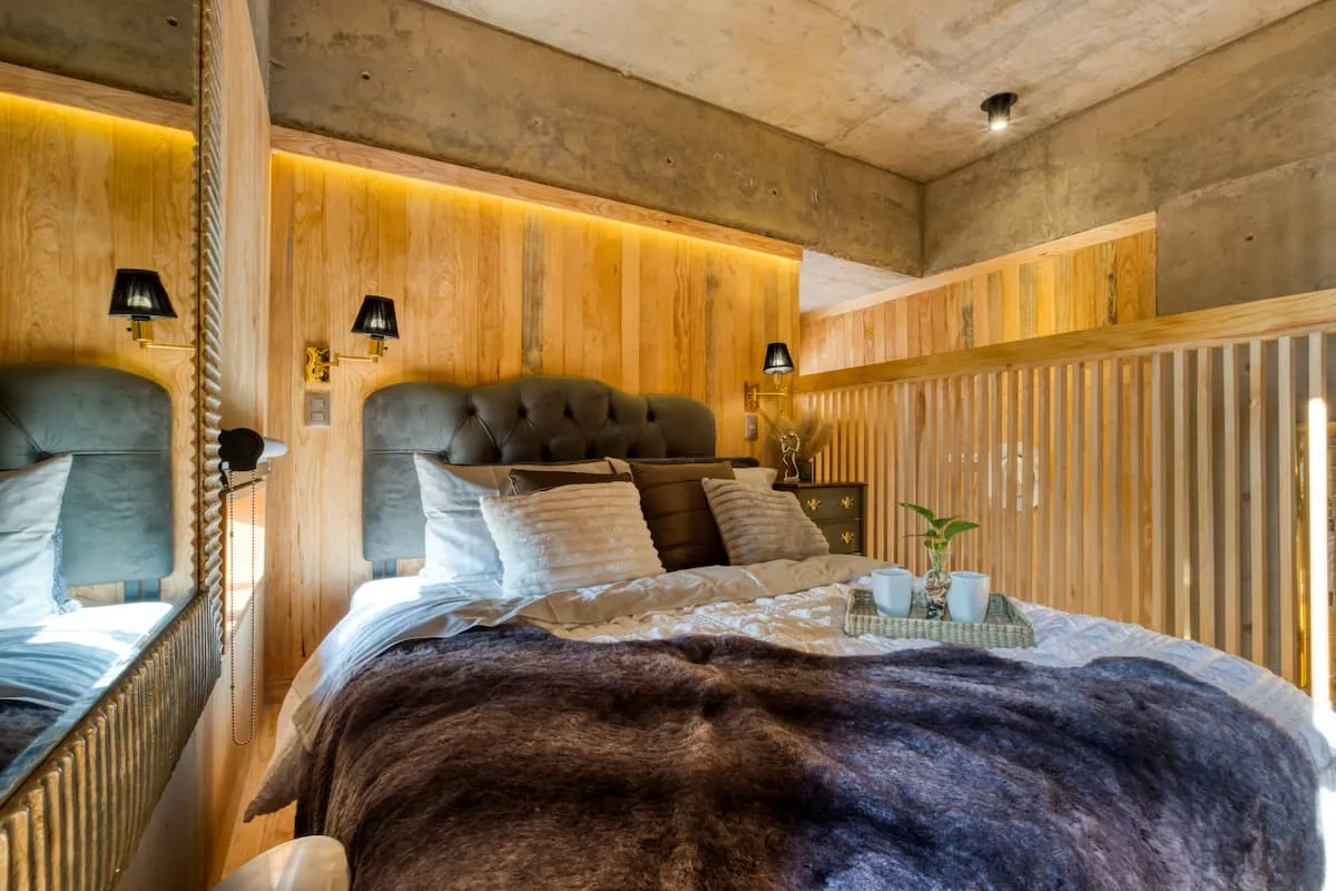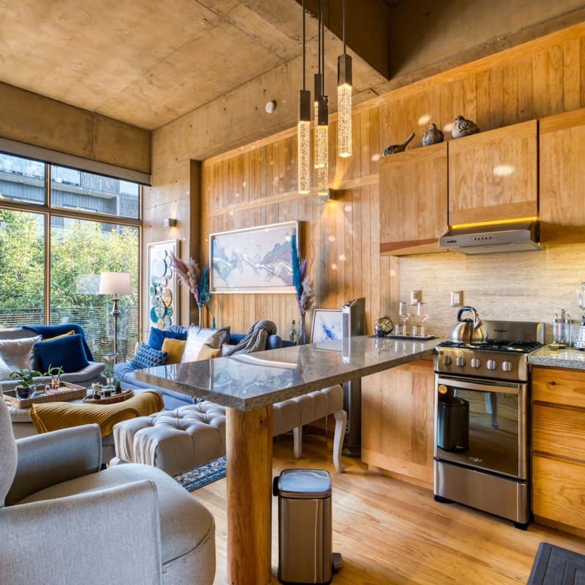 This apartment is a loft featuring a queen bed. The sofa in the living room can also be used as a sleeper sofa.