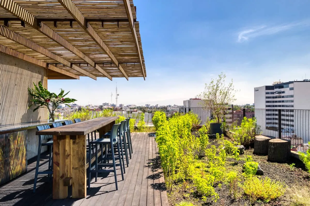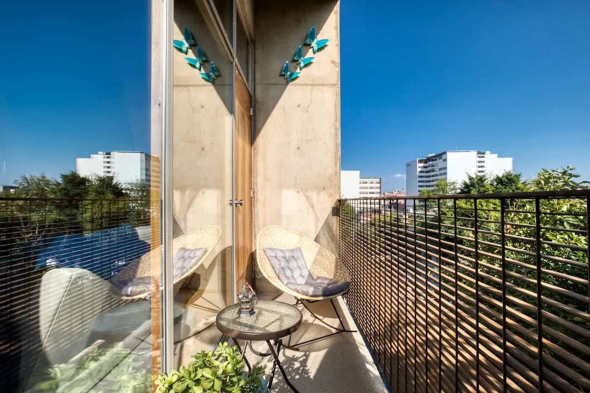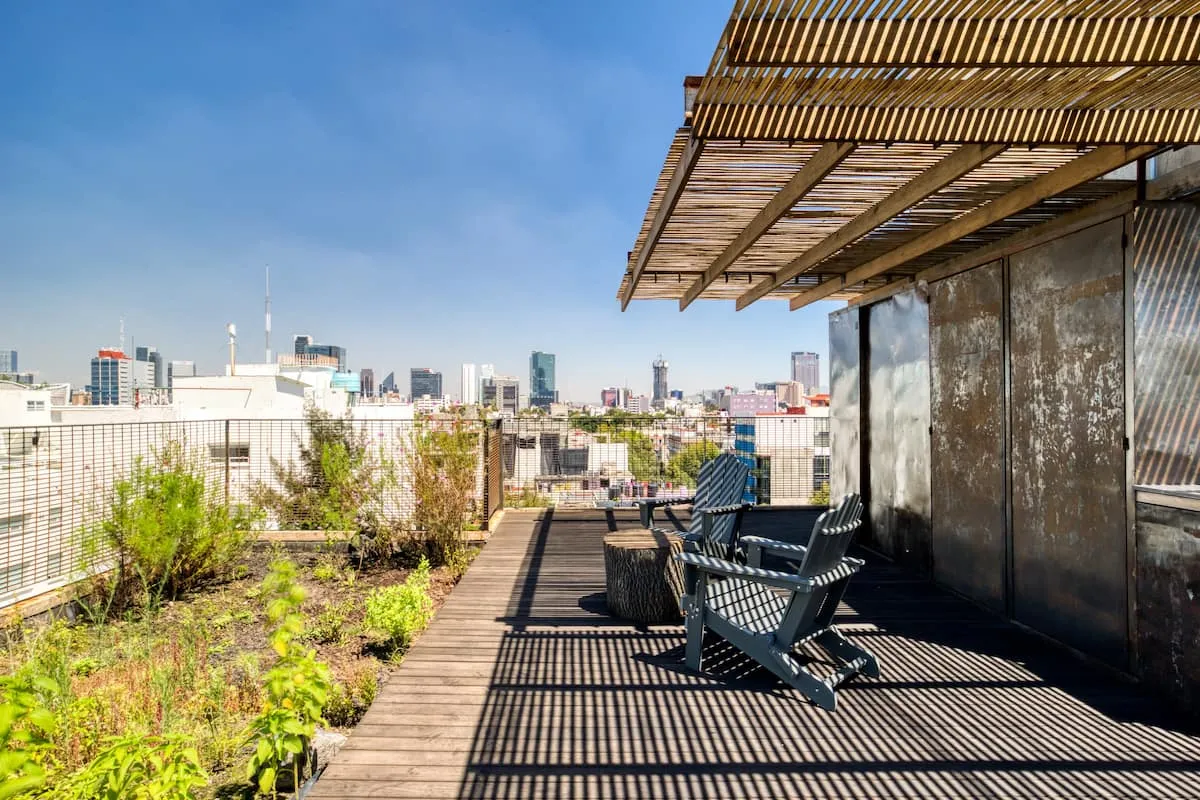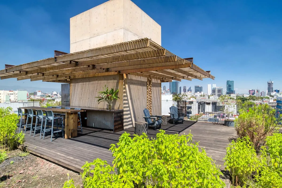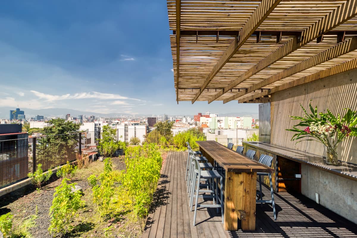 The apartment building has 24/7 security and is located just blocks from a large park. There is a communal rooftop boasting gorgeous views of the Mexico City skyline.