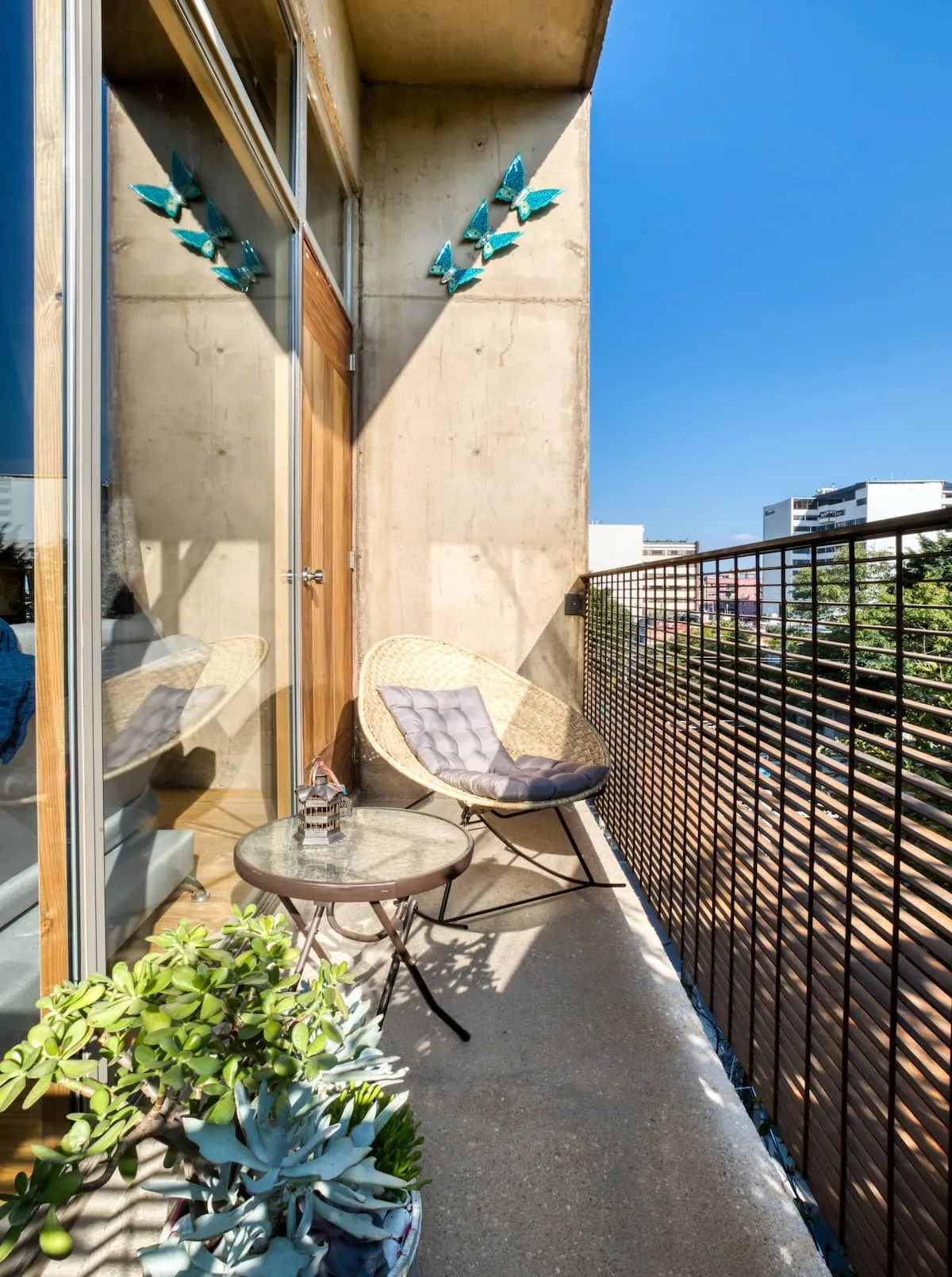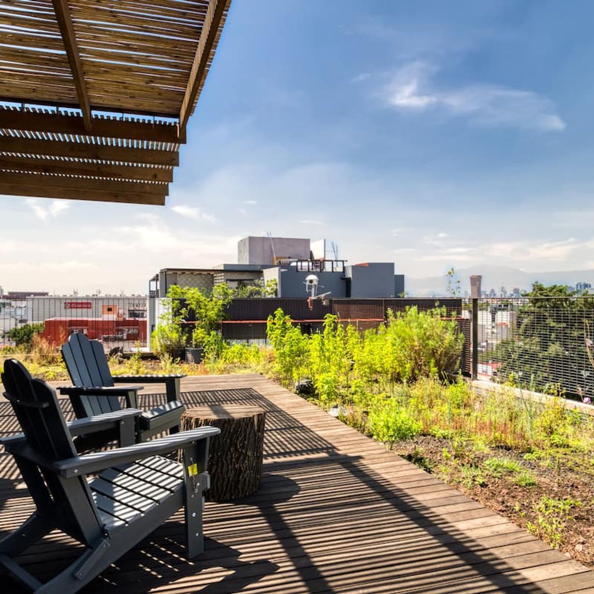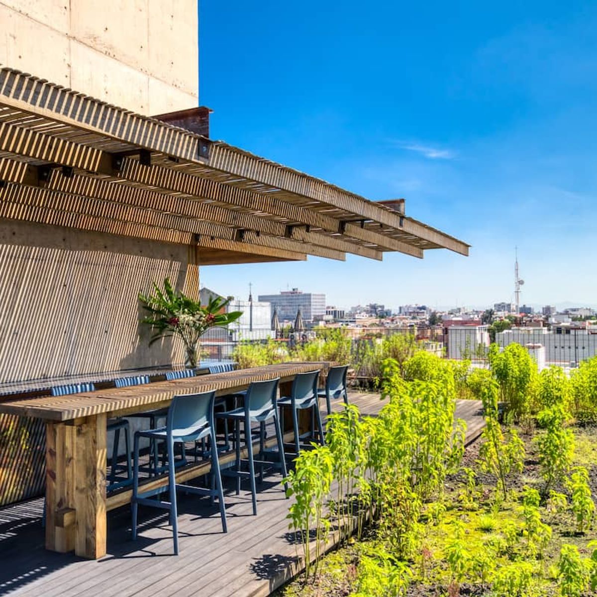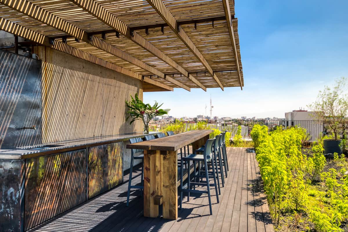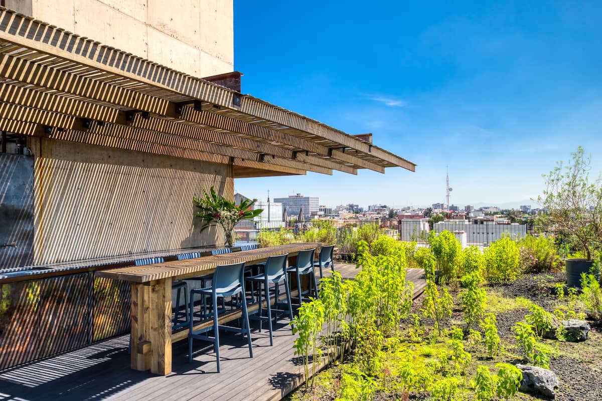 The apartment building has 24/7 security and is located just blocks from a large park. There is a communal rooftop boasting gorgeous views of the Mexico City skyline.