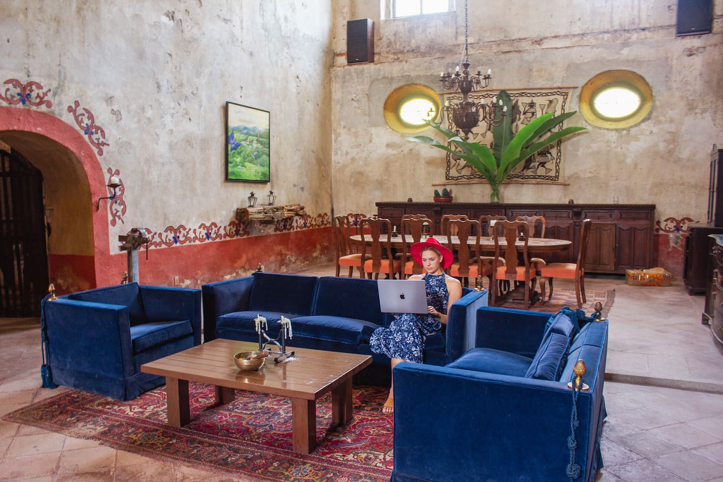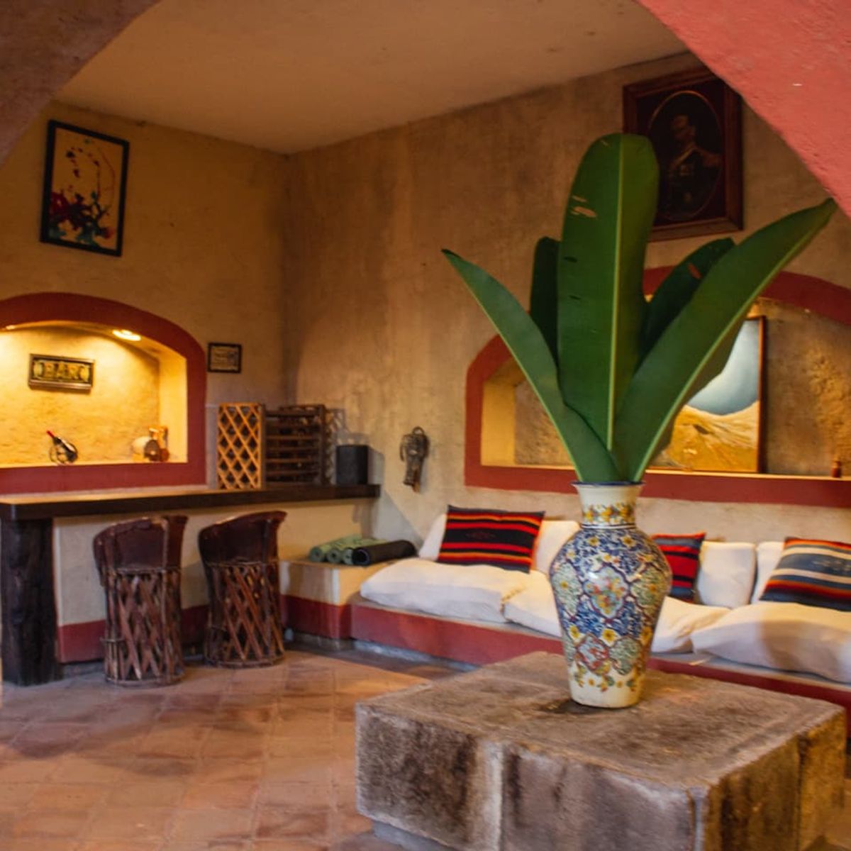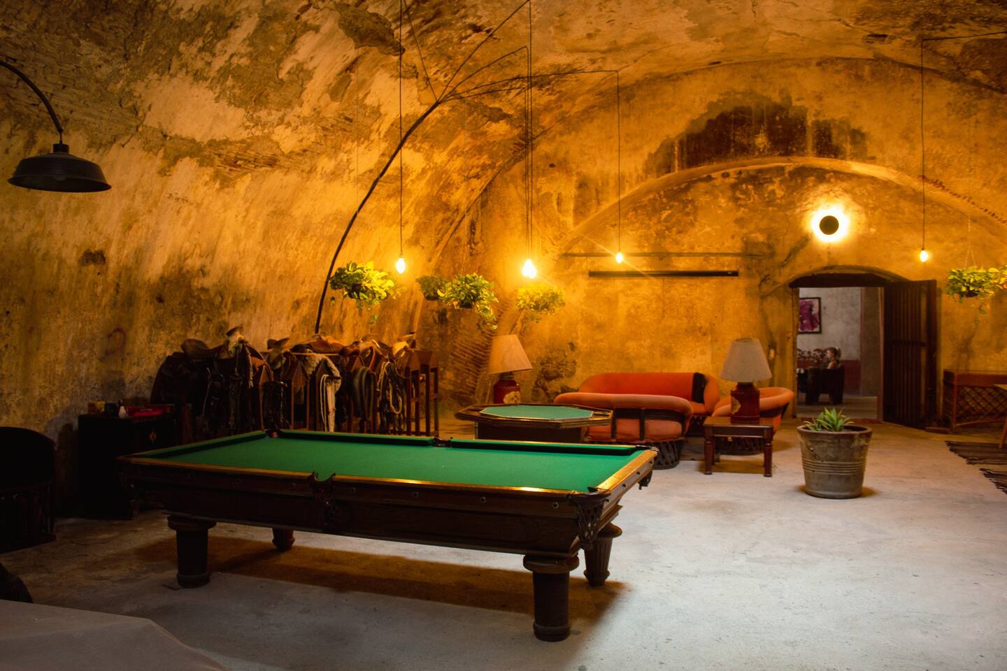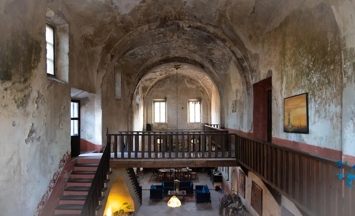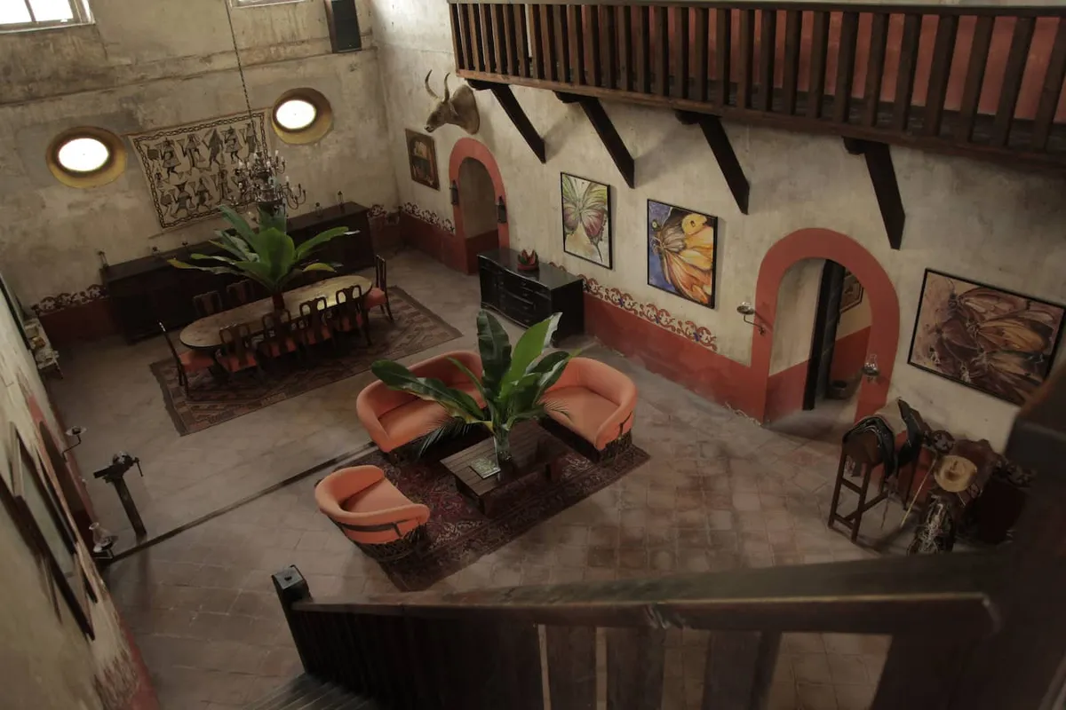 The residence, wonderfully converted from an antique cathedral, boasts three generous common areas, replete with cozy rooms and armchairs. Begin your day on the portico terrace, savoring breakfast as you drink in the view of the hacienda's striking helmet. The house features an event bar, a dining space accommodating 12 guests, a game room equipped with a carambola and pool table, and a TV room—your personal theatre for binge-watching favorite series.