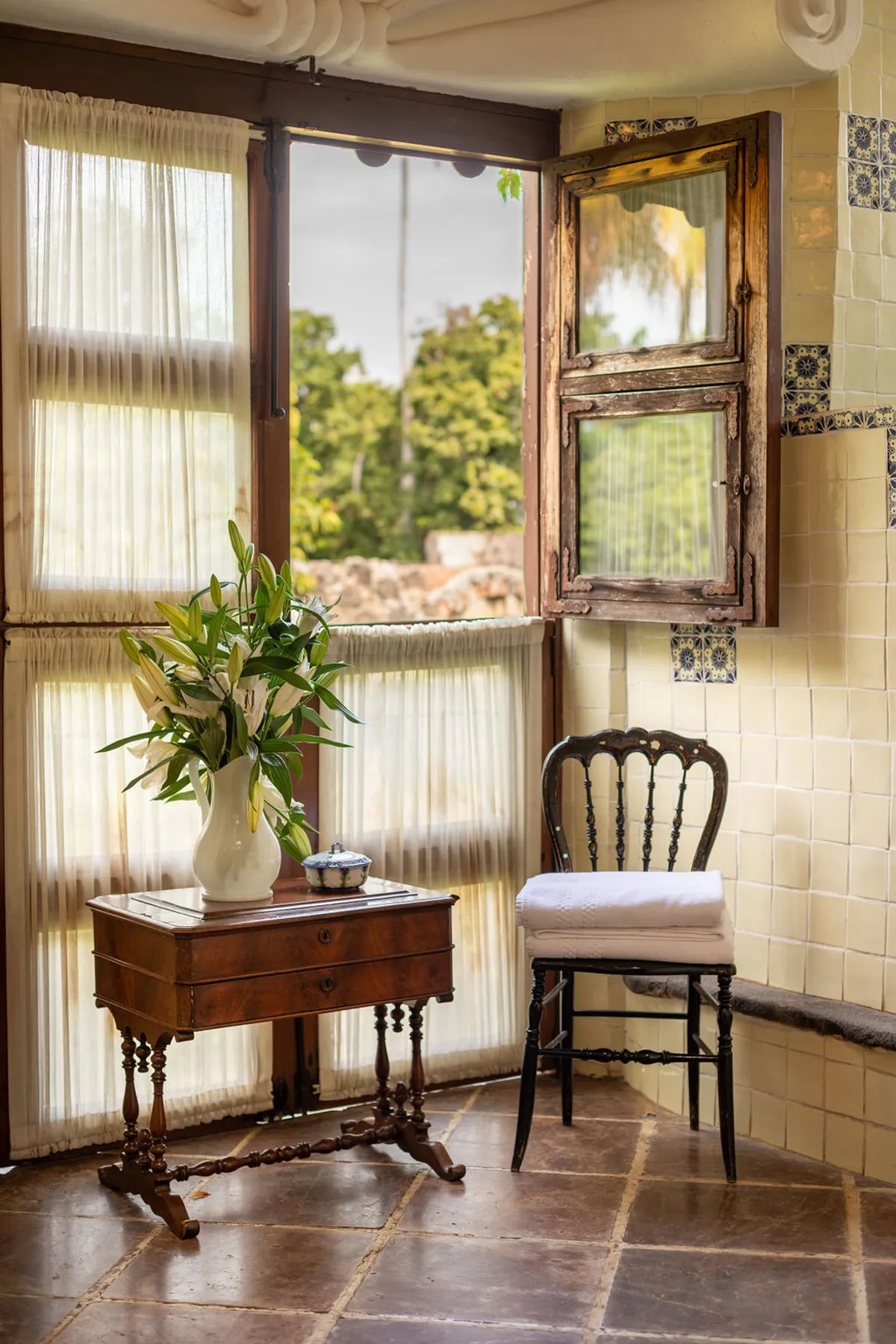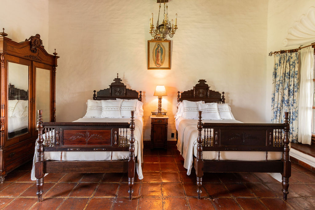 Today, this hacienda is a private paradise hidden among lush gardens and fruit trees. Spanning over 6 hectares, the property features 10 beautifully appointed rooms with handcrafted finishes, Talavera-tiled bathrooms, air conditioning, and premium bedding.