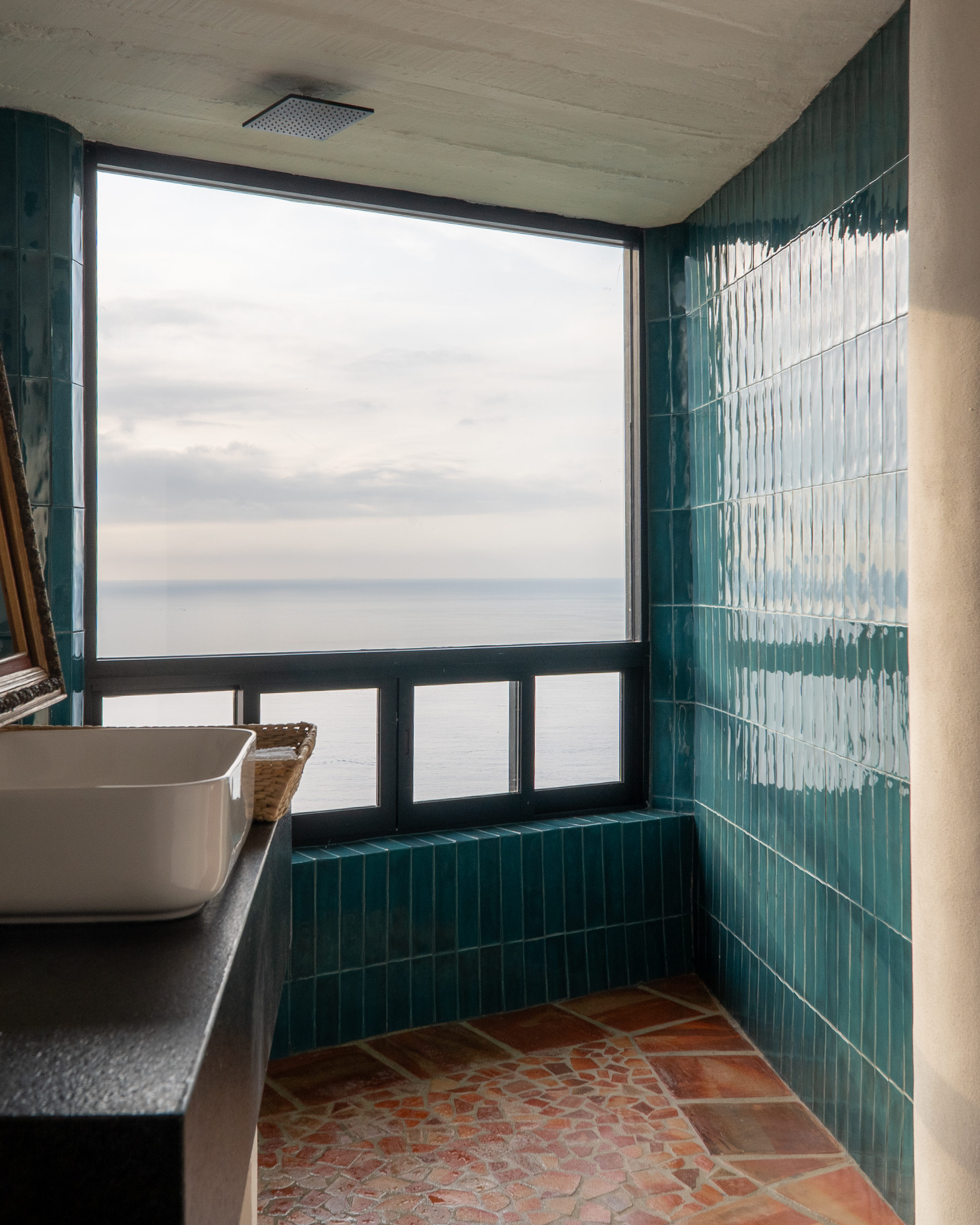 The main pool anchors the central terrace and serves as a natural gathering point throughout the day. Framed by palms and whitewashed walls, it opens toward the bay, creating the feeling of floating above the ocean. A tiled sun platform, shaded lounge areas, and a cascading water feature give the space a calm, rhythmic atmosphere from morning through evening.