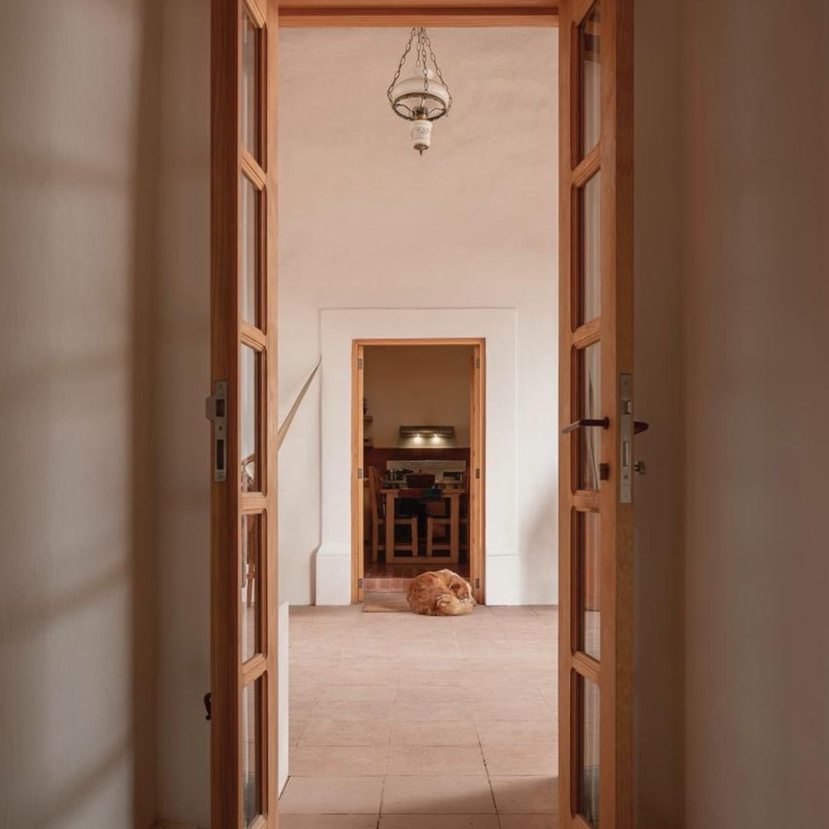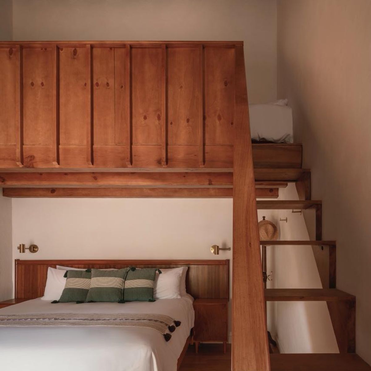 Inside, designer Patricia Hirschfeld softens the architecture with calm, earthy textures. Reclaimed wood, handcrafted details, and gentle lighting create a feeling of warmth, while the gold-leaf dining room adds a radiant, unexpected moment that glows against the historic stone.