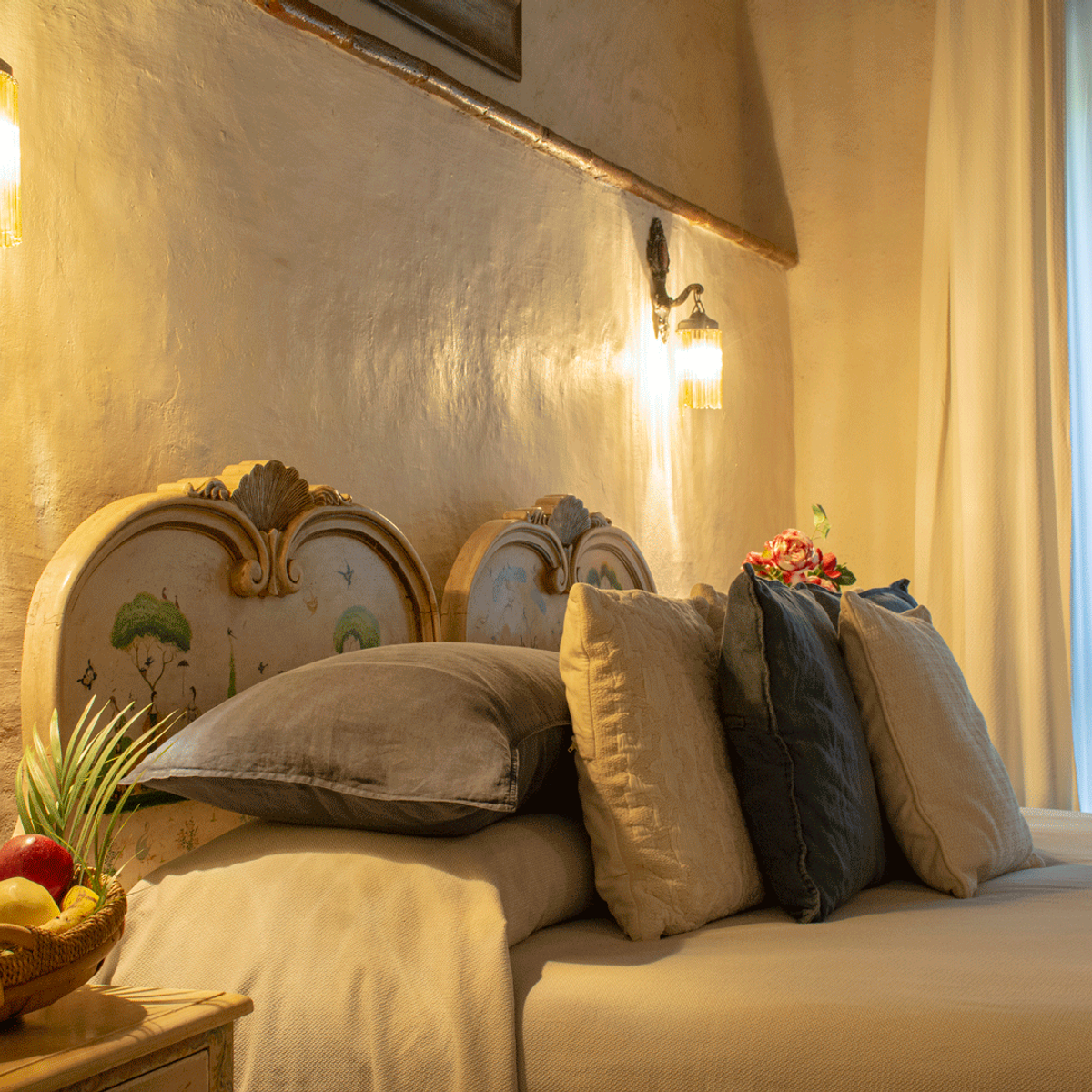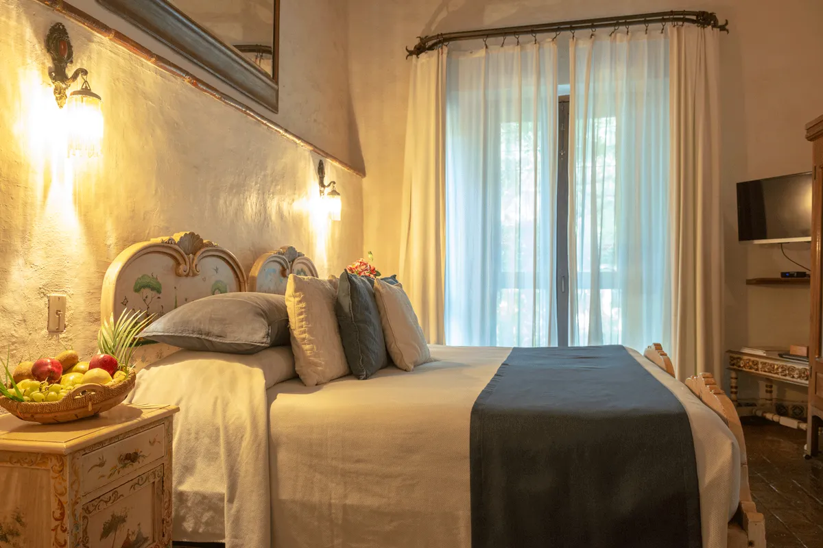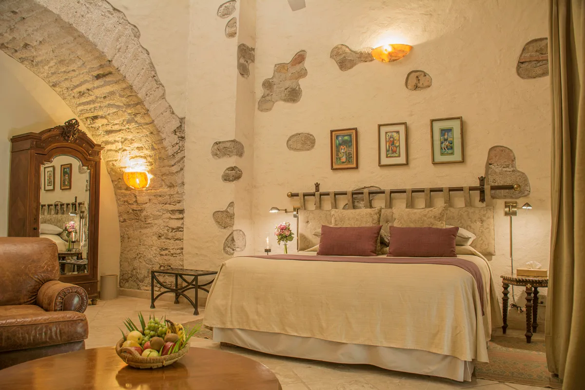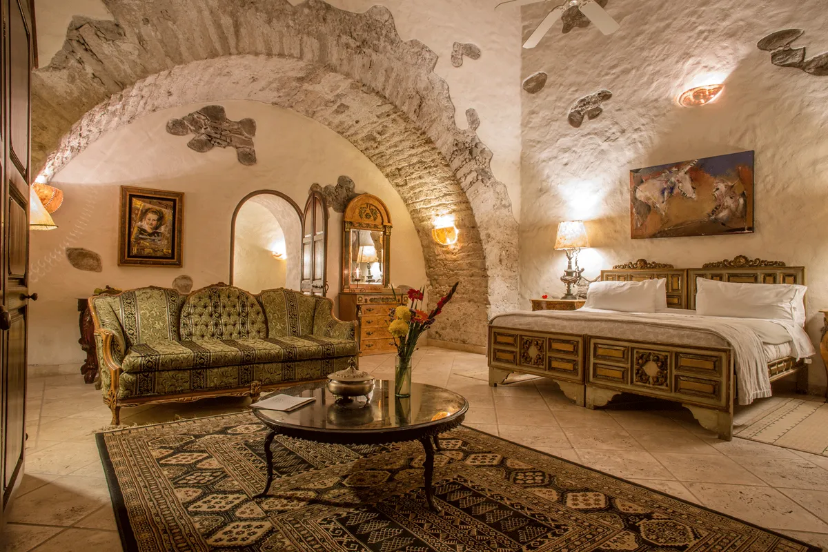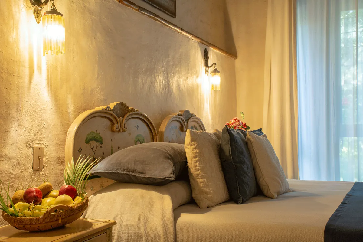 The property has 20 individually styled suites spread across historic buildings—some carved into original aqueducts, others with private jacuzzis, plunge pools, or garden terraces. Vaulted ceilings, antique stonework, and hand-crafted furnishings echo its heritage while offering modern comfort.