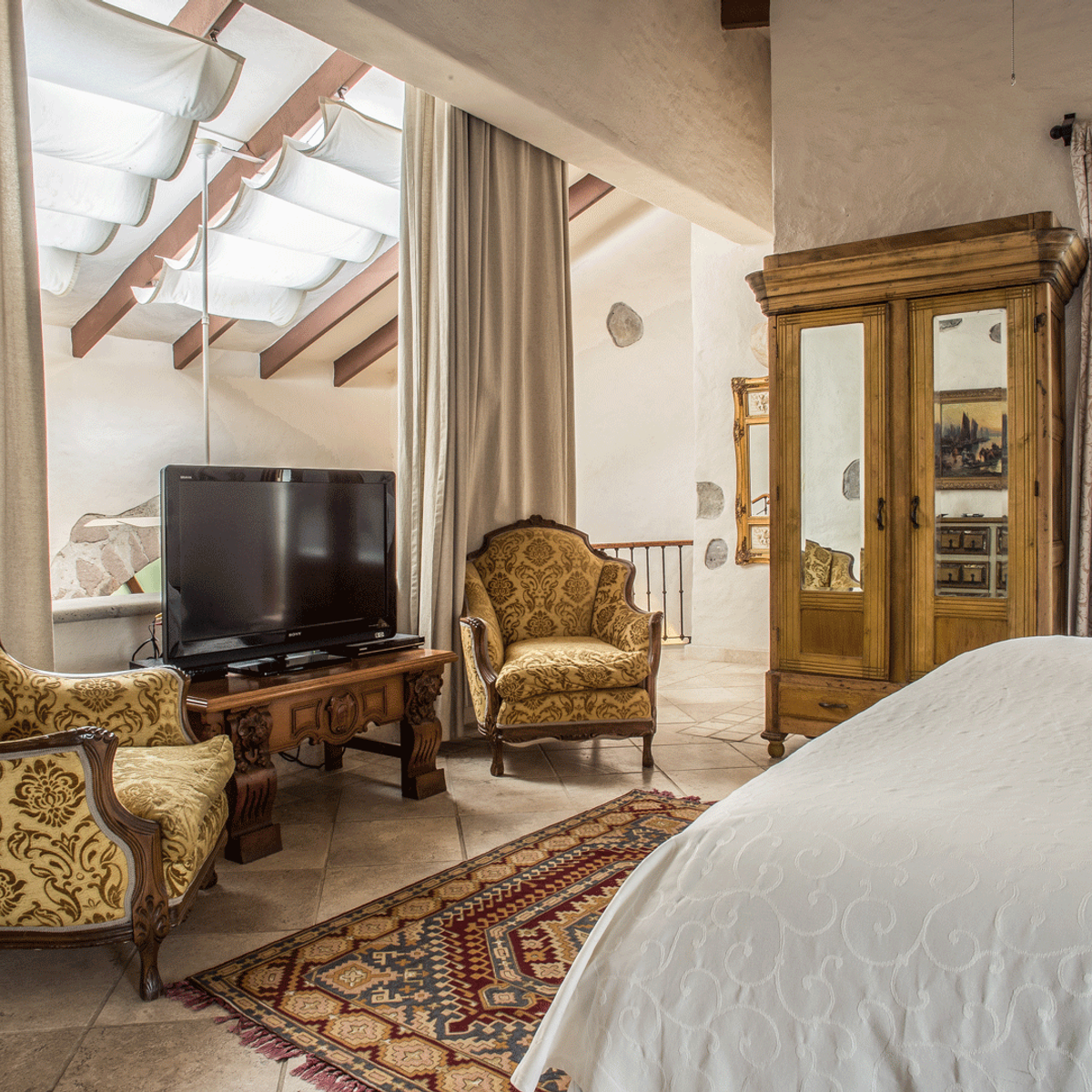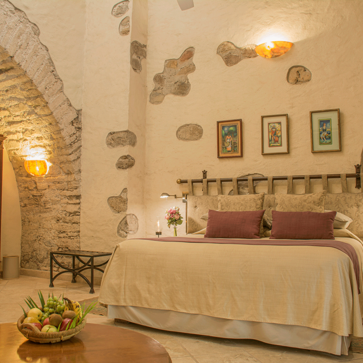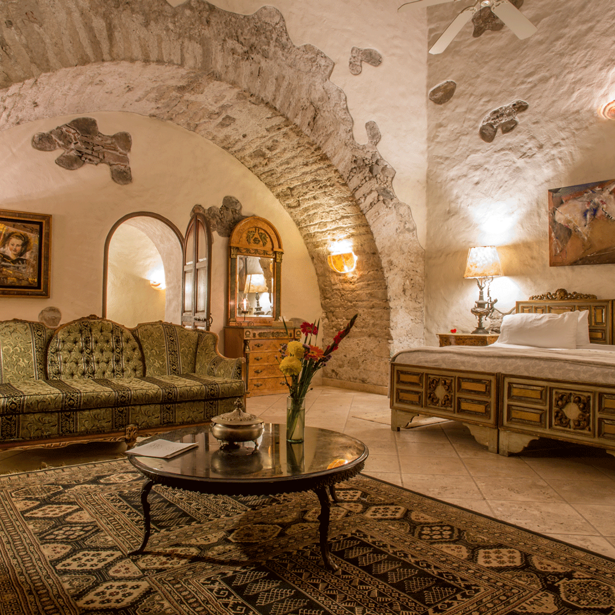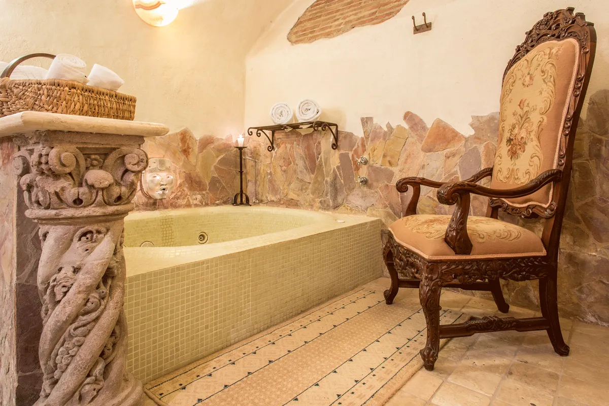 The property has 20 individually styled suites spread across historic buildings—some carved into original aqueducts, others with private jacuzzis, plunge pools, or garden terraces. Vaulted ceilings, antique stonework, and hand-crafted furnishings echo its heritage while offering modern comfort.