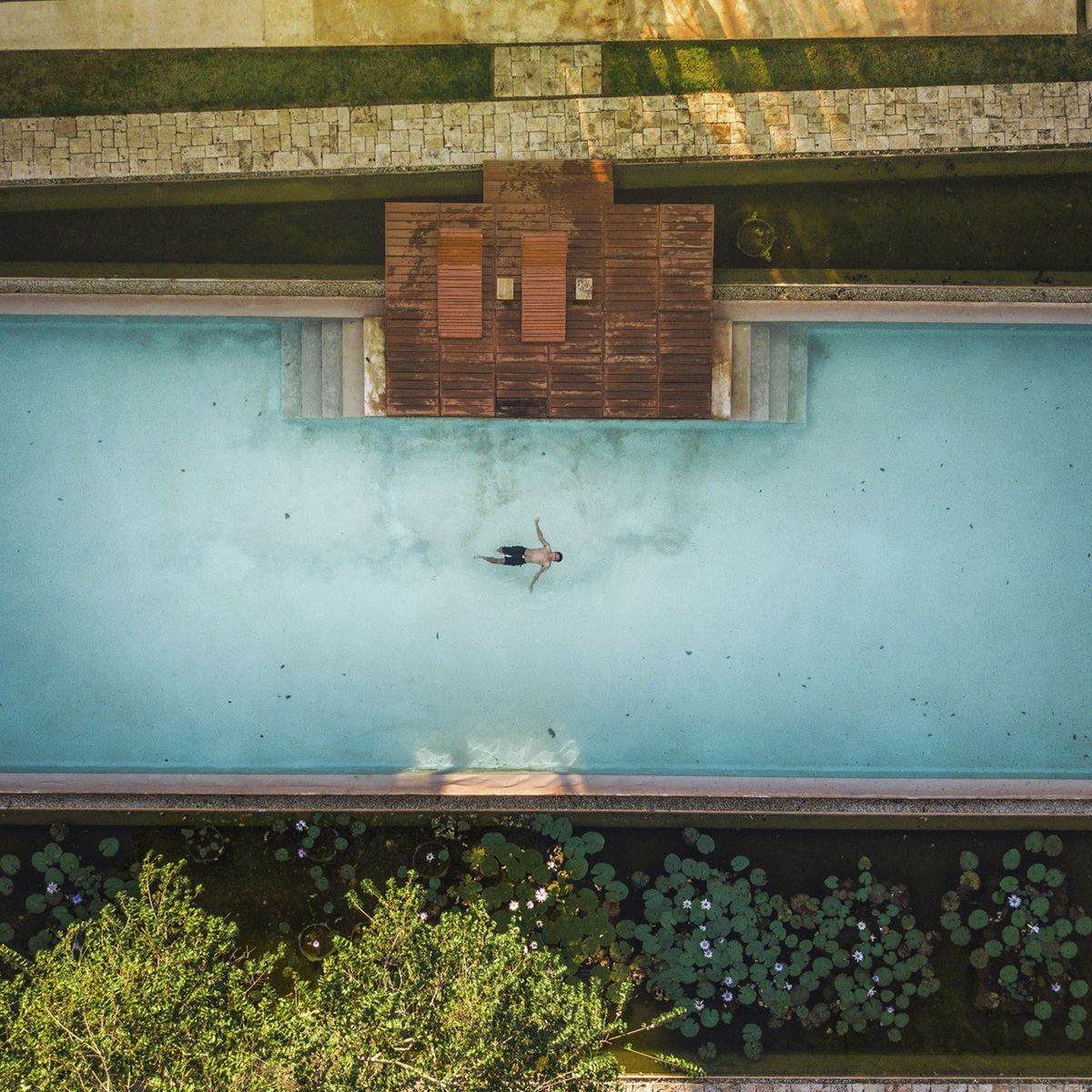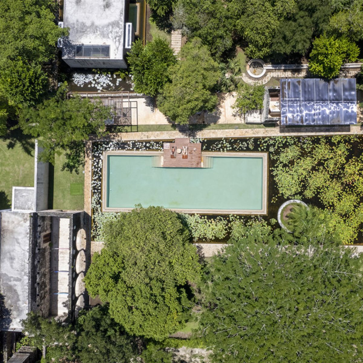 The centerpiece of the estate's renovation is the breathtaking pool, housed within a floating container in a shimmering lily pond. Located in the hacienda’s former drying patio, this grand water feature imaginatively integrates nature and architecture with rarely-seen elegance.