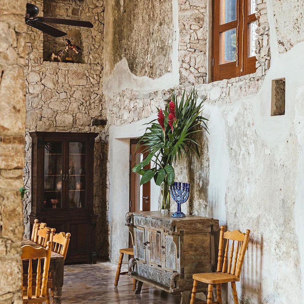 The hacienda has a carefully curated mix of contemporary furnishings and antiques. In the dining room, mid-century Danish-style seats are paired with an elegantly distressed antique dining table, complemented by remarkable 18th-century cabinets. In the bedrooms, Japanese-style tatami beds create a chic contrast with the original stone walling.
