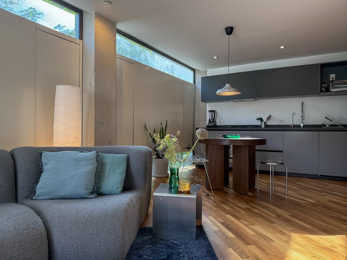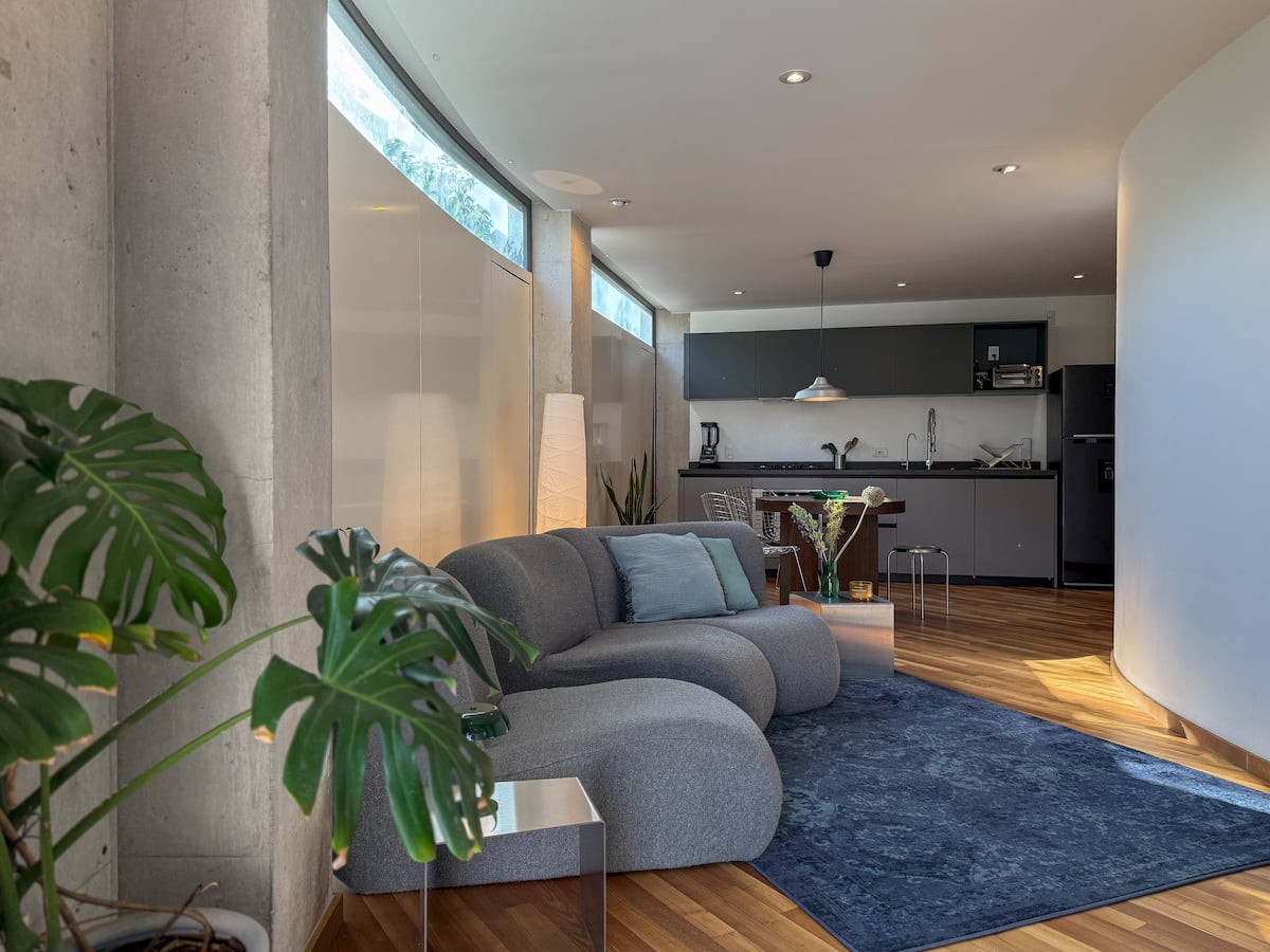 After crossing the main door, you are received by a central atrium. The stairs in helicoidal shape guide you to this thoughtfully designed duplex. On the first floor, you'll find the living space, a dining table for three, a completely equipped kitchen, and a private terrace. On the second floor,r find the bedroom with a full private bathroom, a half bathroom for visits, and a laundry room with a washer/dryer.
