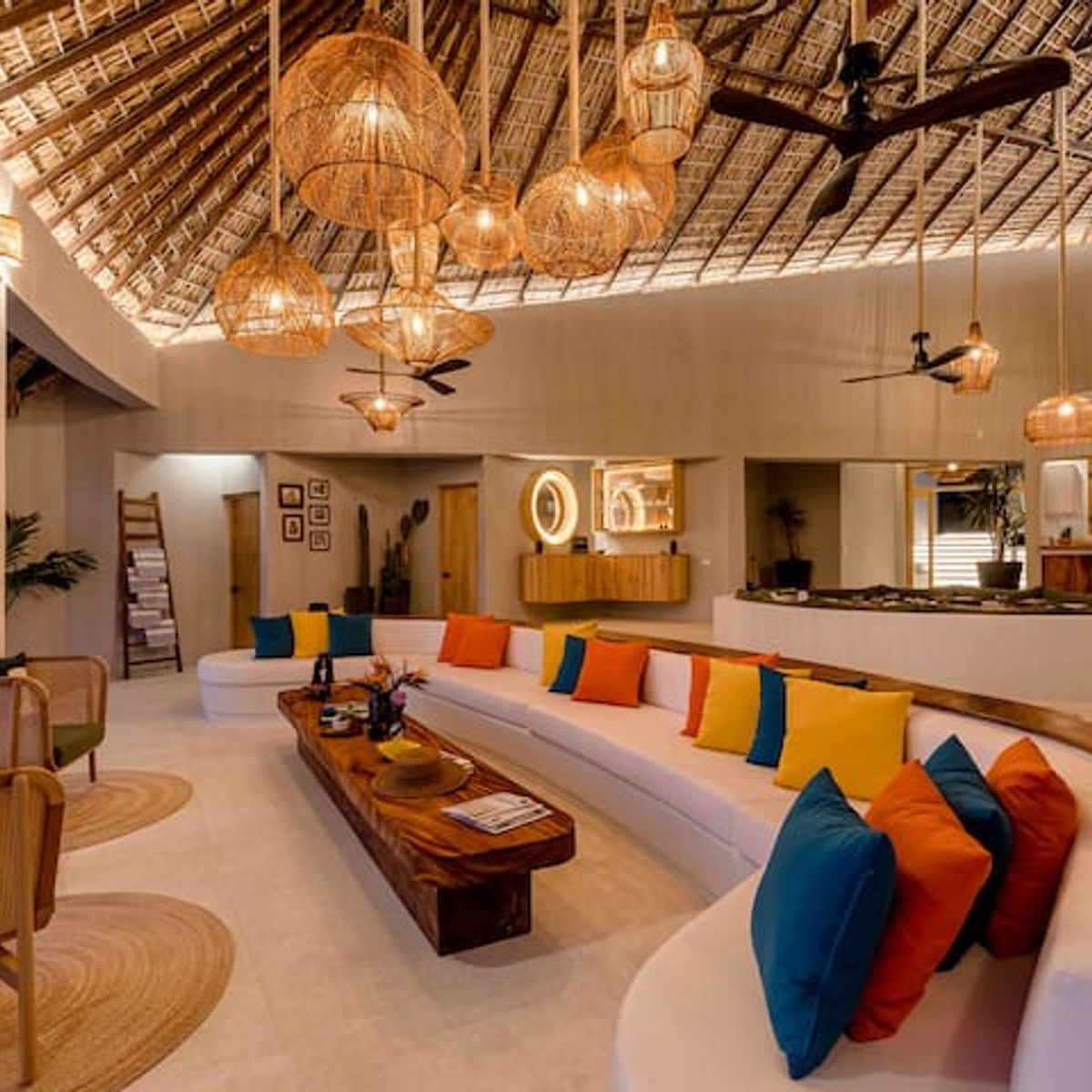 The view from the grand palapa is also nothing short of cinematic. Framed by the living area's sculptural light installation, the vista out onto the infinity pool towards the ocean is an influencer-worthy backdrop.