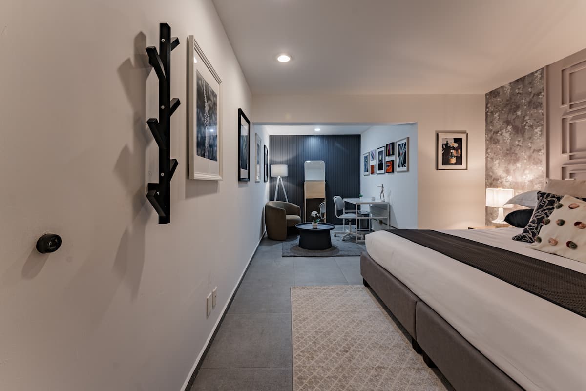 – Bedroom 1: King-size bed, small sitting area, desk, full bathroom