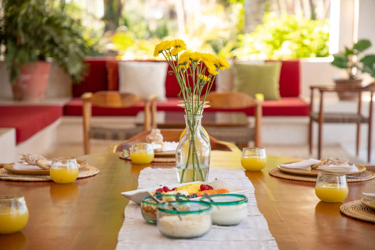 Your stay includes daily cooking, cleaning, and bar service. We coordinate your menu in advance, handle all grocery shopping before arrival, and prepare fresh local cuisine. Each morning, coffee, tea, yogurt, granola, and fresh fruit are ready, with breakfast served once all guests are awake. Light snacks are offered in the afternoon, and dinner is served by the grill at sunset. A curated selection of liquor, wine, and beer is available for purchase, and our staff can prepare handcrafted cocktails.