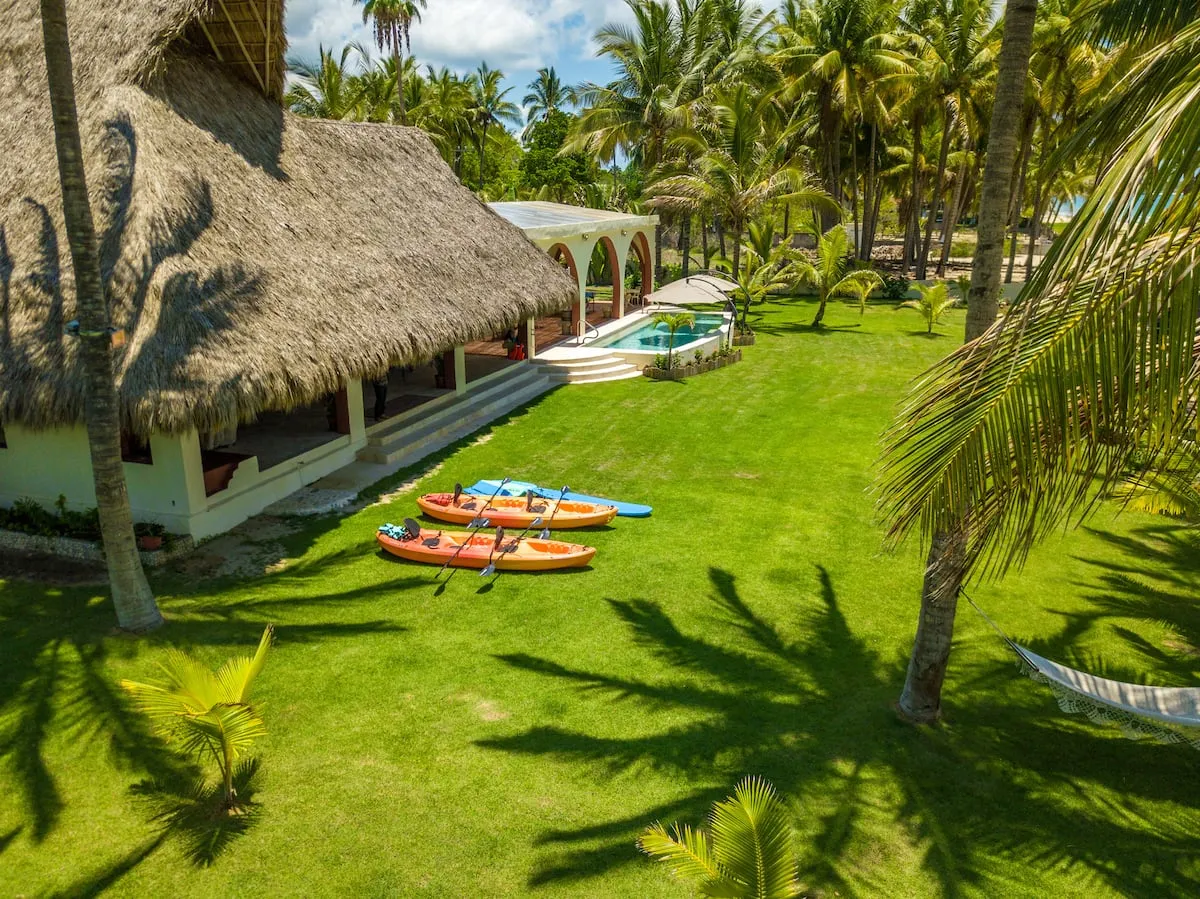 The property offers 4 air-conditioned bedrooms, 6 full bathrooms with towels and amenities, a bar, a ping-pong table, a beach shack, a volleyball court, a beach bonfire area, and 2 kayaks.
