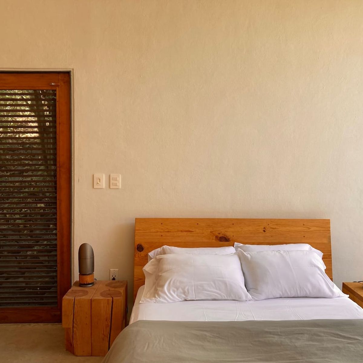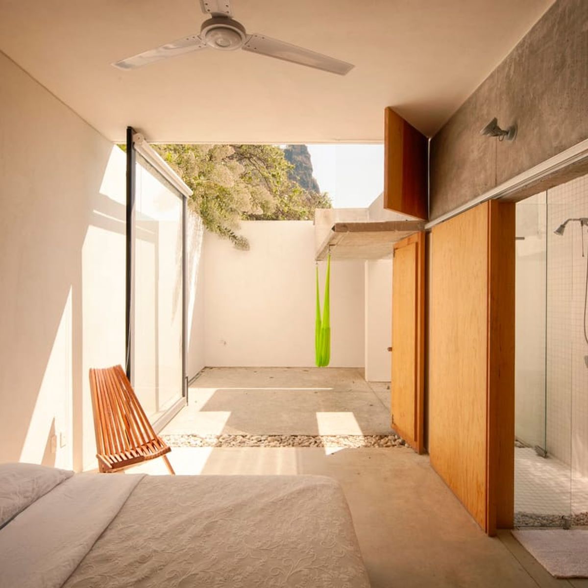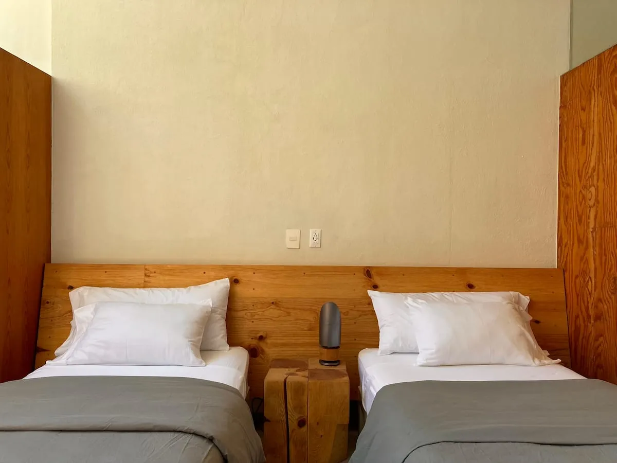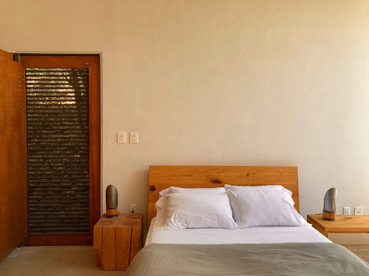 The house comfortably sleeps up to 8 guests across four double bedrooms: Two master bedrooms feature a King- and Queen-size bed, large full-body mirrors, and wooden sliding doors that separate the sleeping area from the private bathrooms; each room opens to a private furnished patio that blends with the room by simply opening the door-window. Two spacious twin rooms offer two single beds each, abundant natural light, and access to a shared central patio with hammocks, perfect for lounging or an afternoon nap.