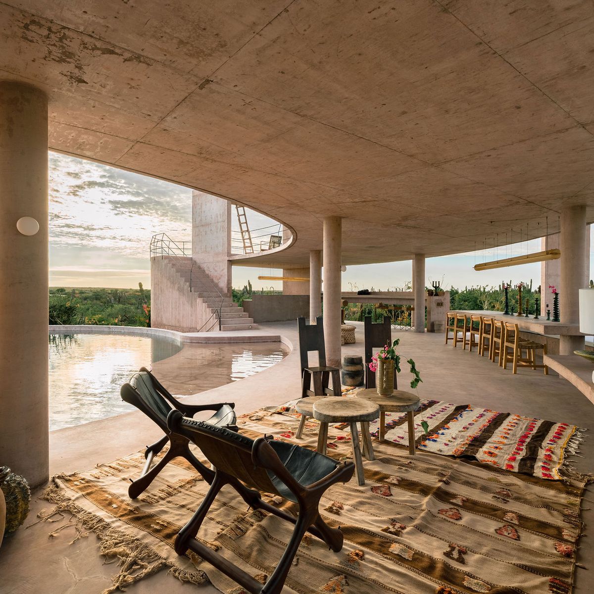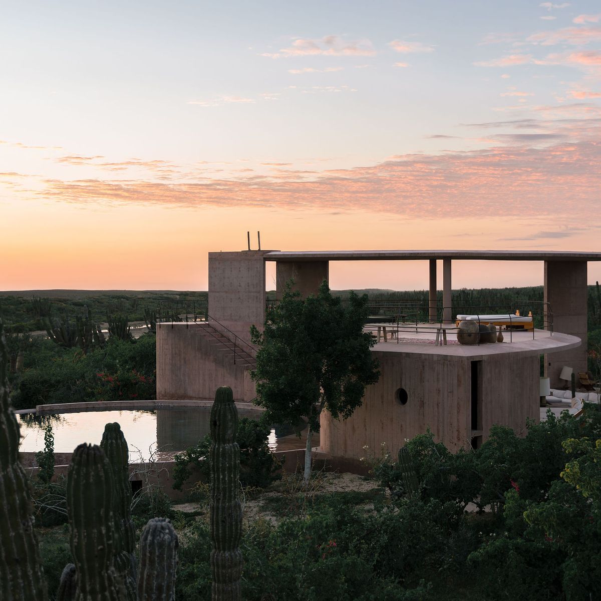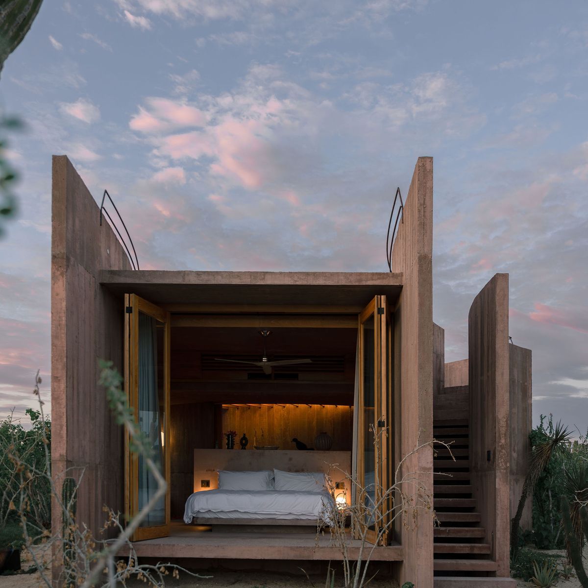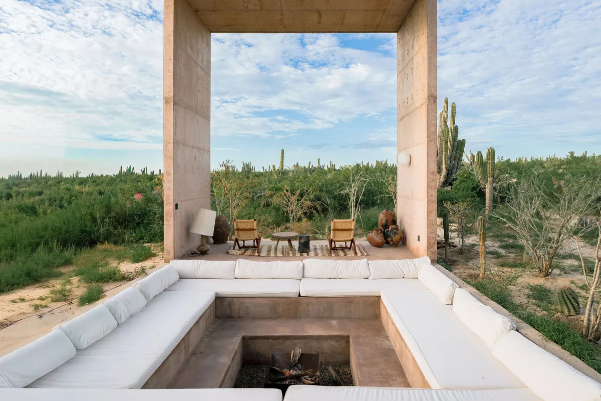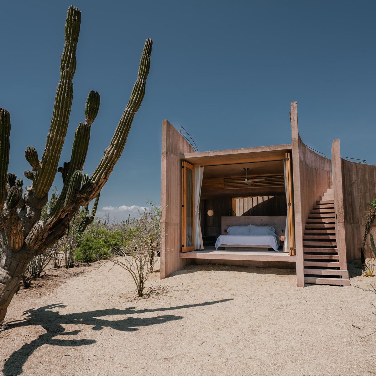 Rising from the desert landscape just north of Todos Santos, Nereidas is a brutalist statement piece softened by Baja’s wild beauty. Concrete walls, clean lines, and expansive windows frame endless views of the ocean and desert, creating a space that feels both sculptural and deeply livable.
