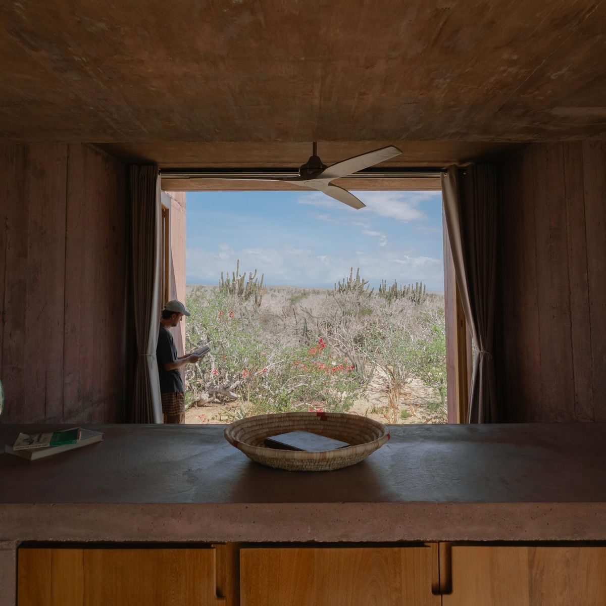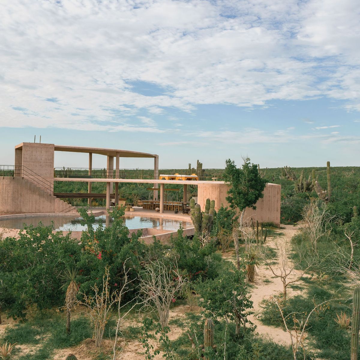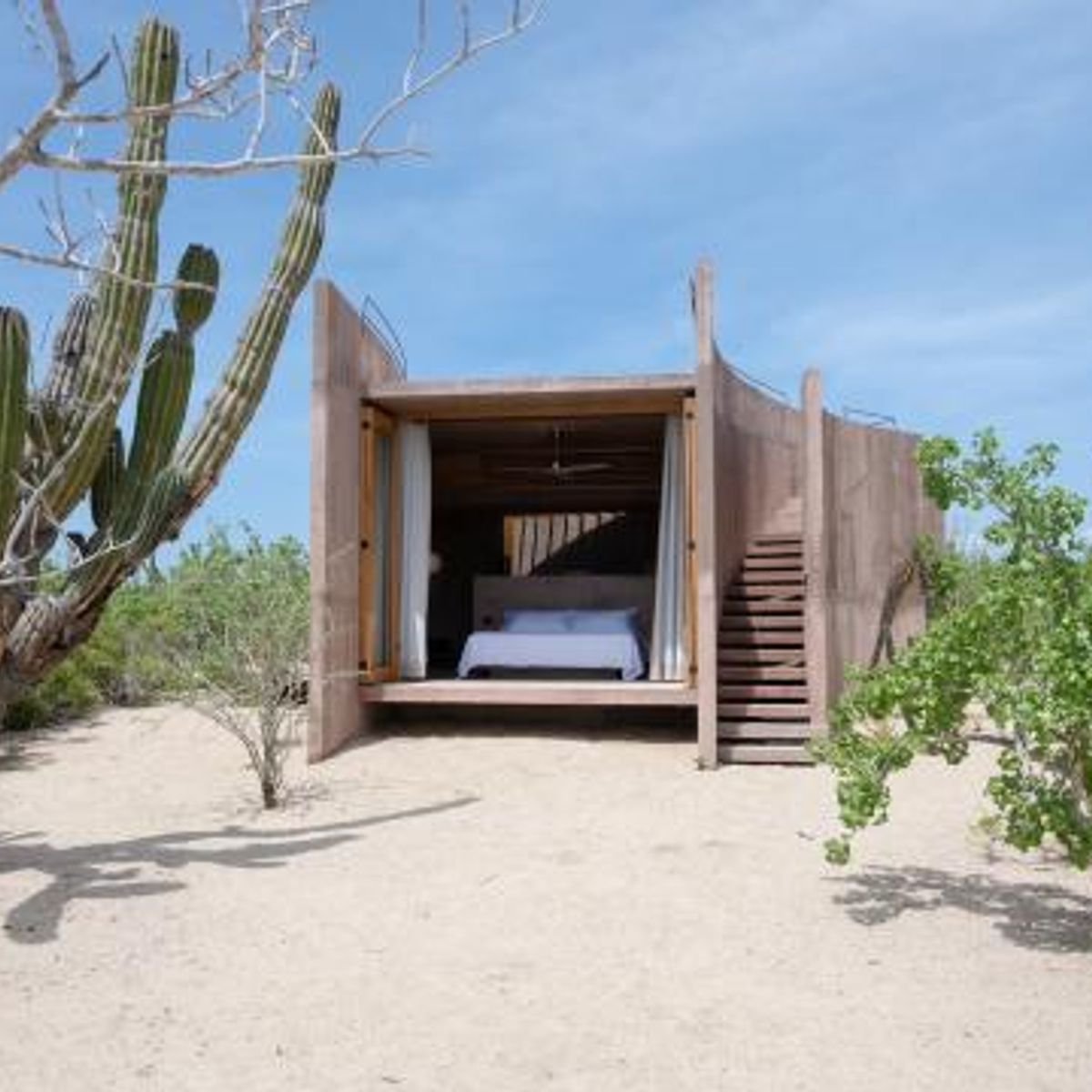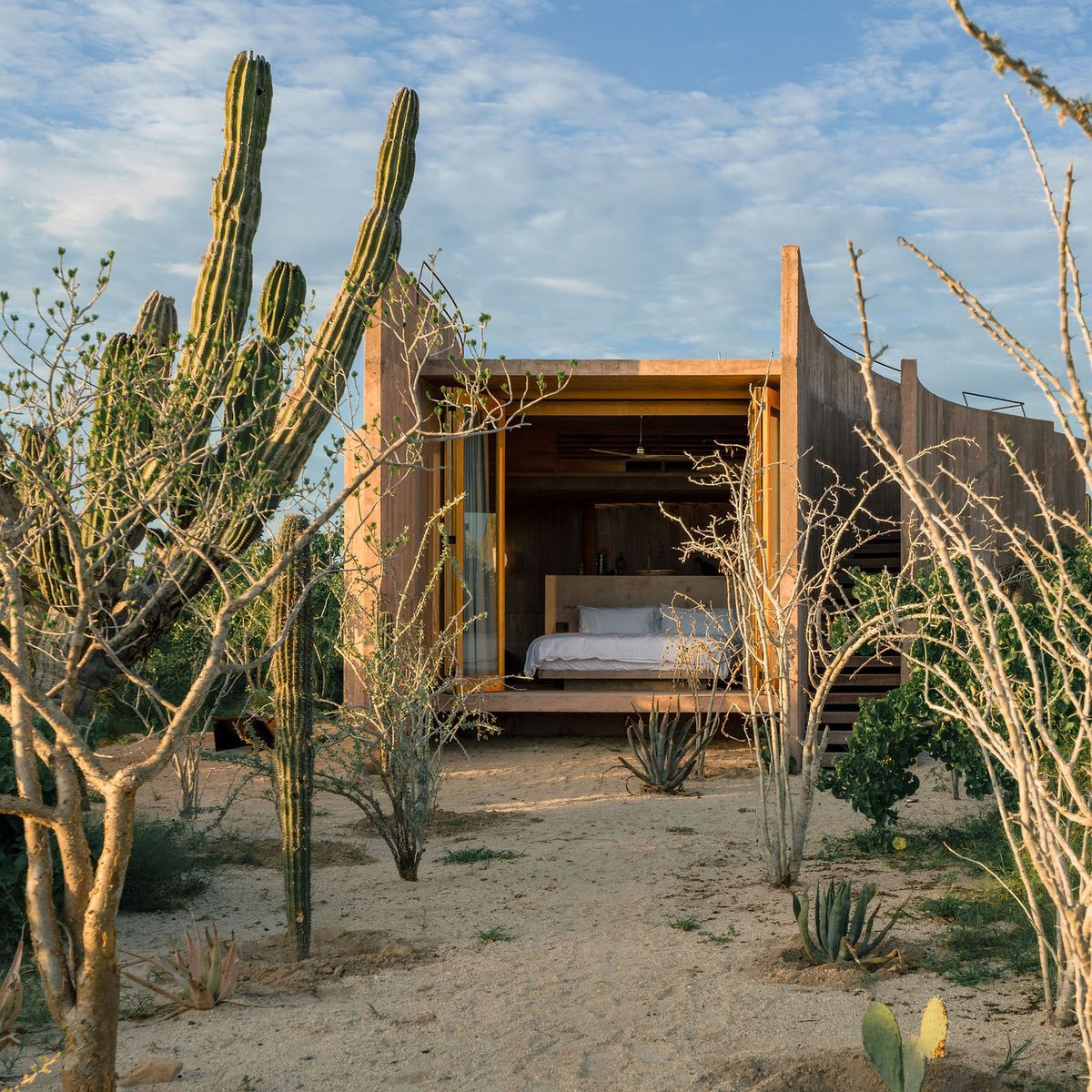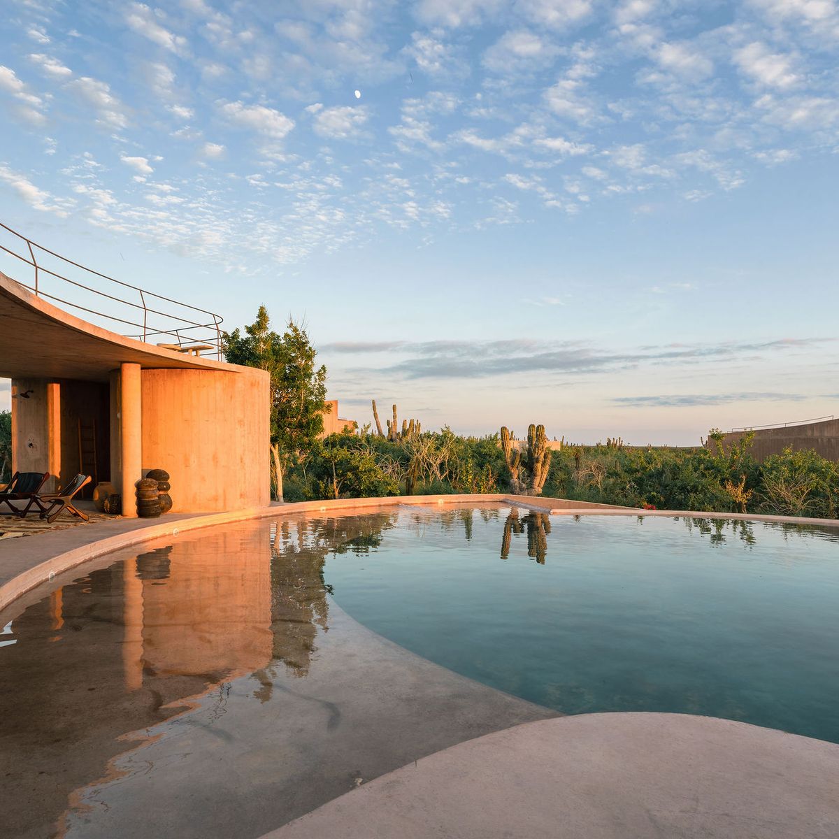 Rising from the desert landscape just north of Todos Santos, Nereidas is a brutalist statement piece softened by Baja’s wild beauty. Concrete walls, clean lines, and expansive windows frame endless views of the ocean and desert, creating a space that feels both sculptural and deeply livable.