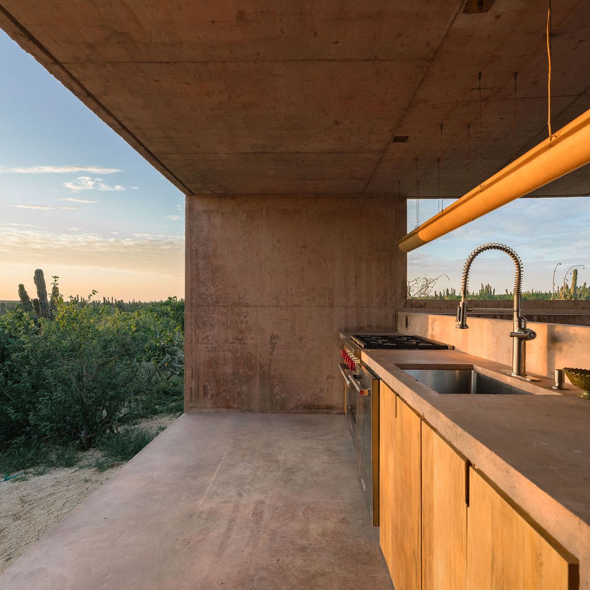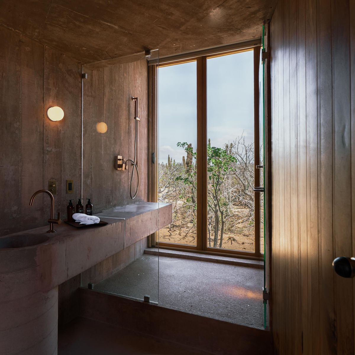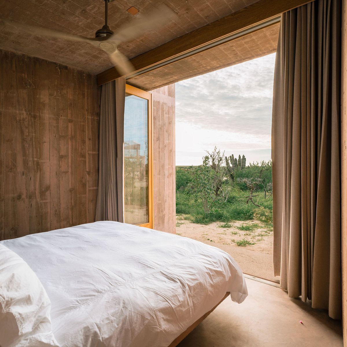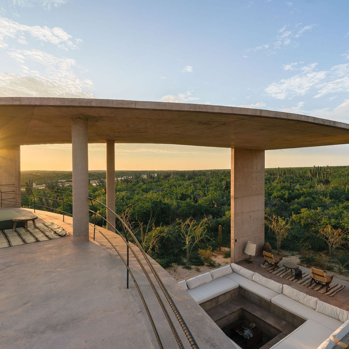 Rising from the desert landscape just north of Todos Santos, Nereidas is a brutalist statement piece softened by Baja’s wild beauty. Concrete walls, clean lines, and expansive windows frame endless views of the ocean and desert, creating a space that feels both sculptural and deeply livable.