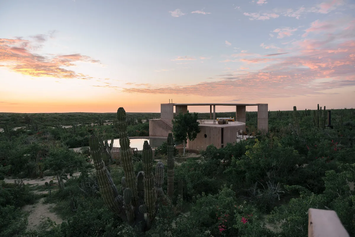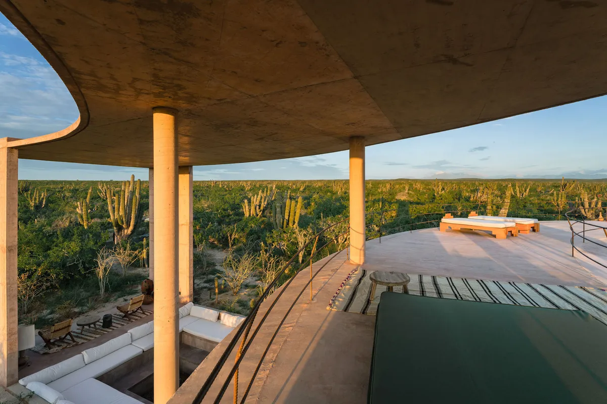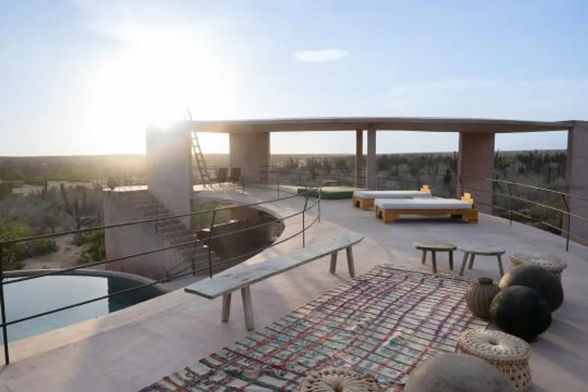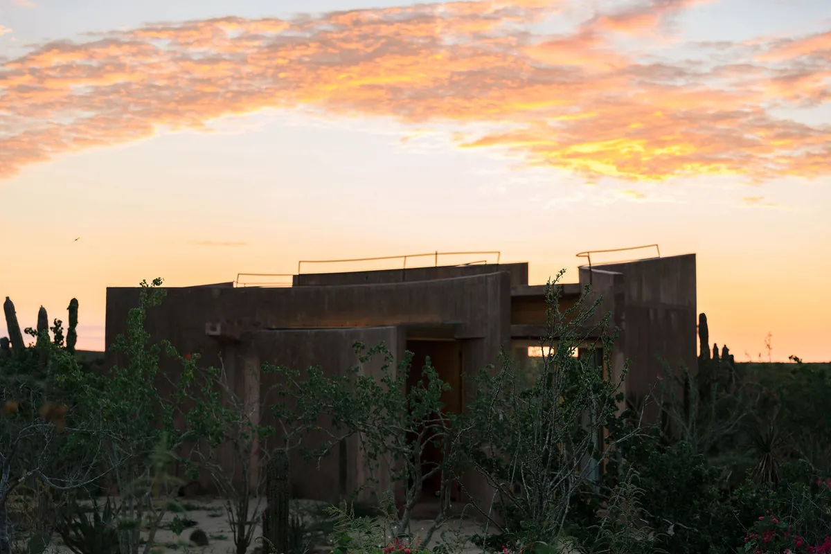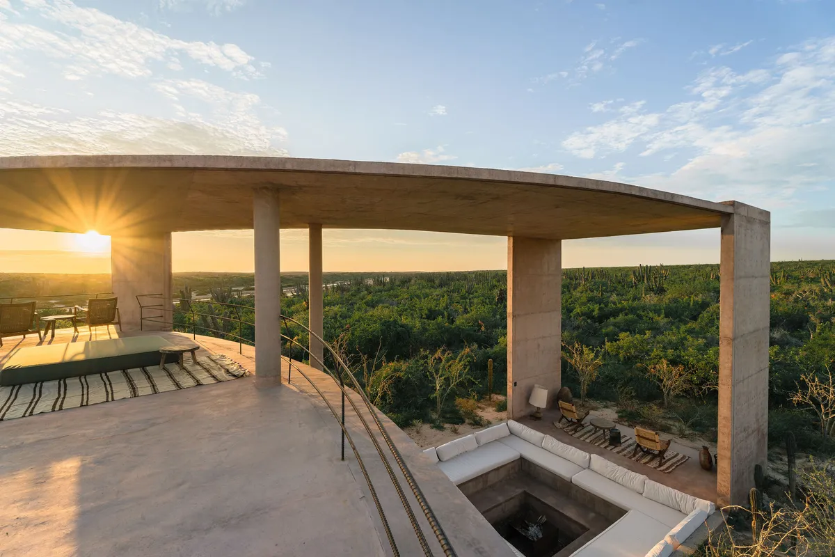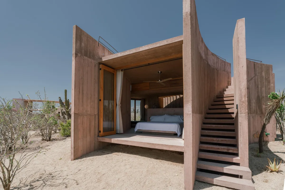 Rising from the desert landscape just north of Todos Santos, Nereidas is a brutalist statement piece softened by Baja’s wild beauty. Concrete walls, clean lines, and expansive windows frame endless views of the ocean and desert, creating a space that feels both sculptural and deeply livable.