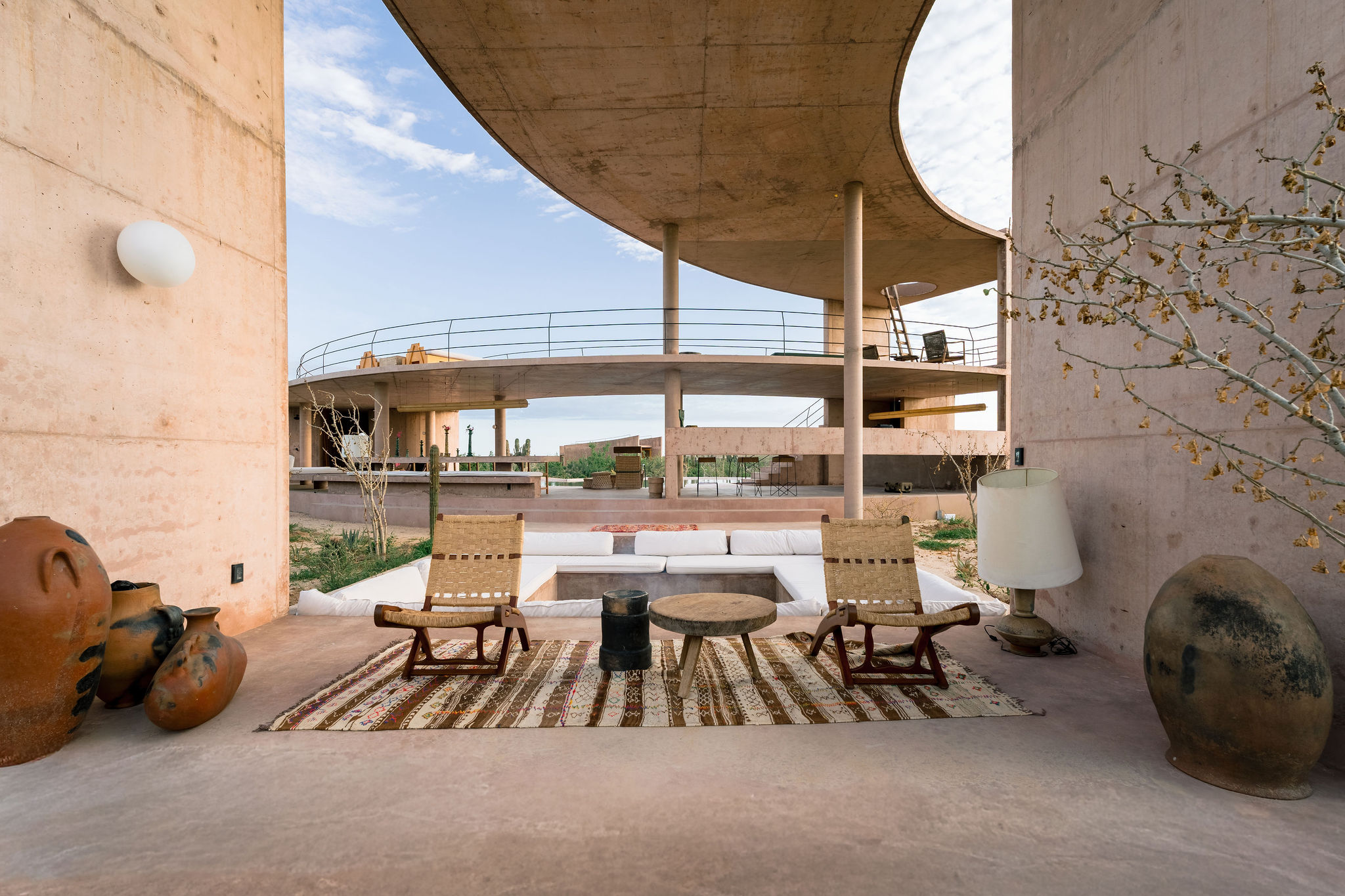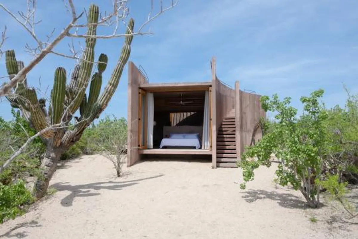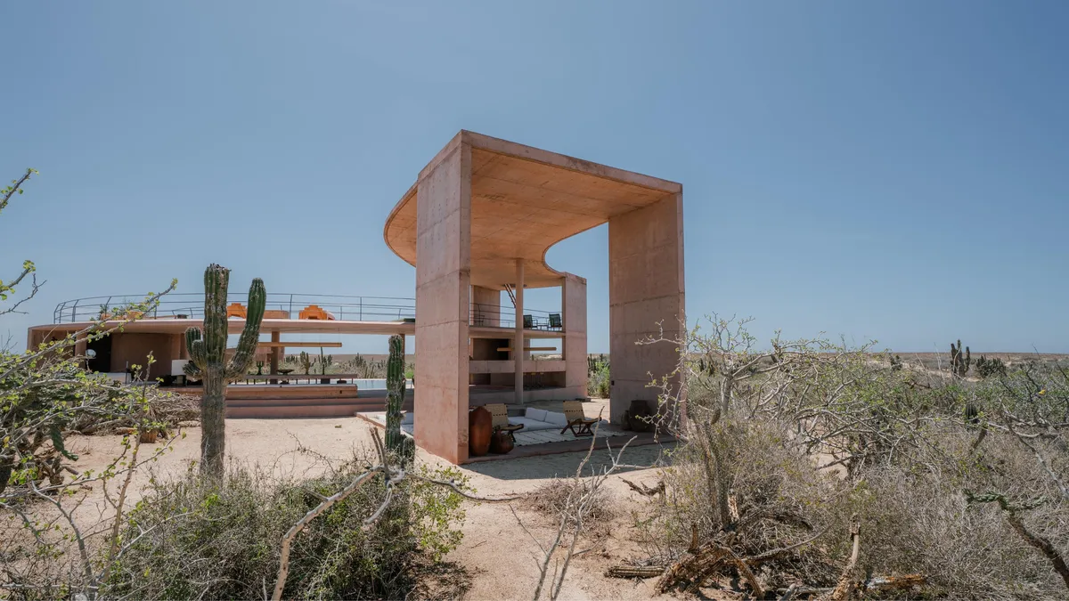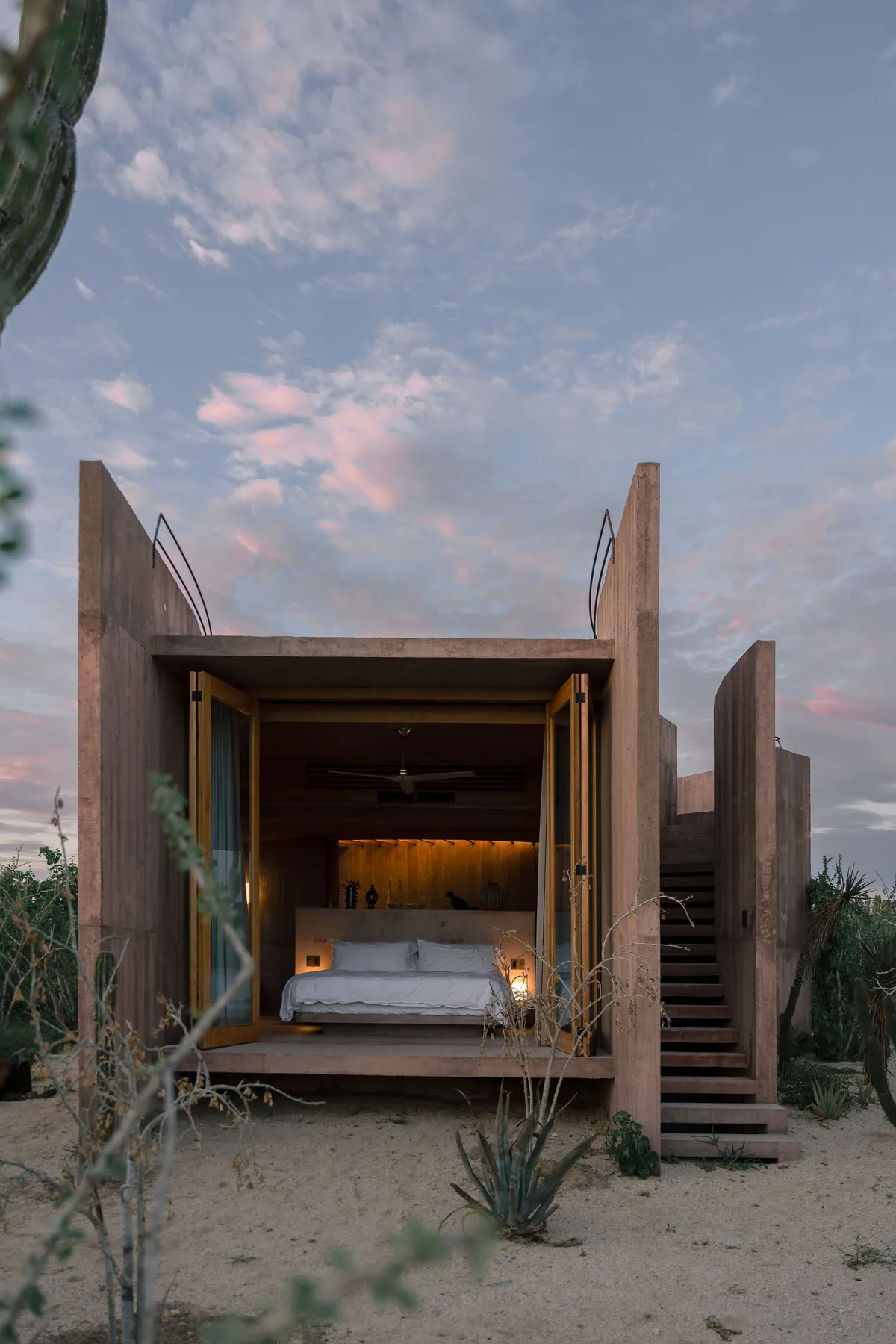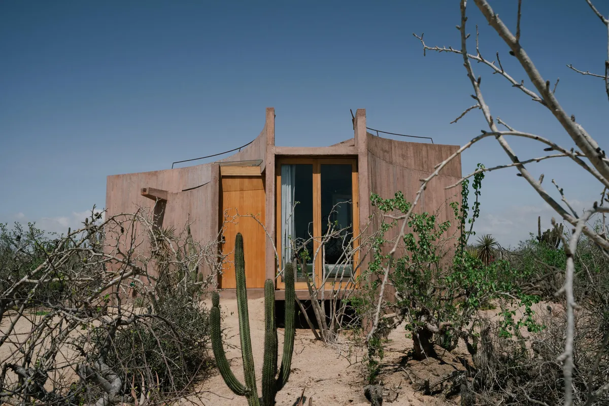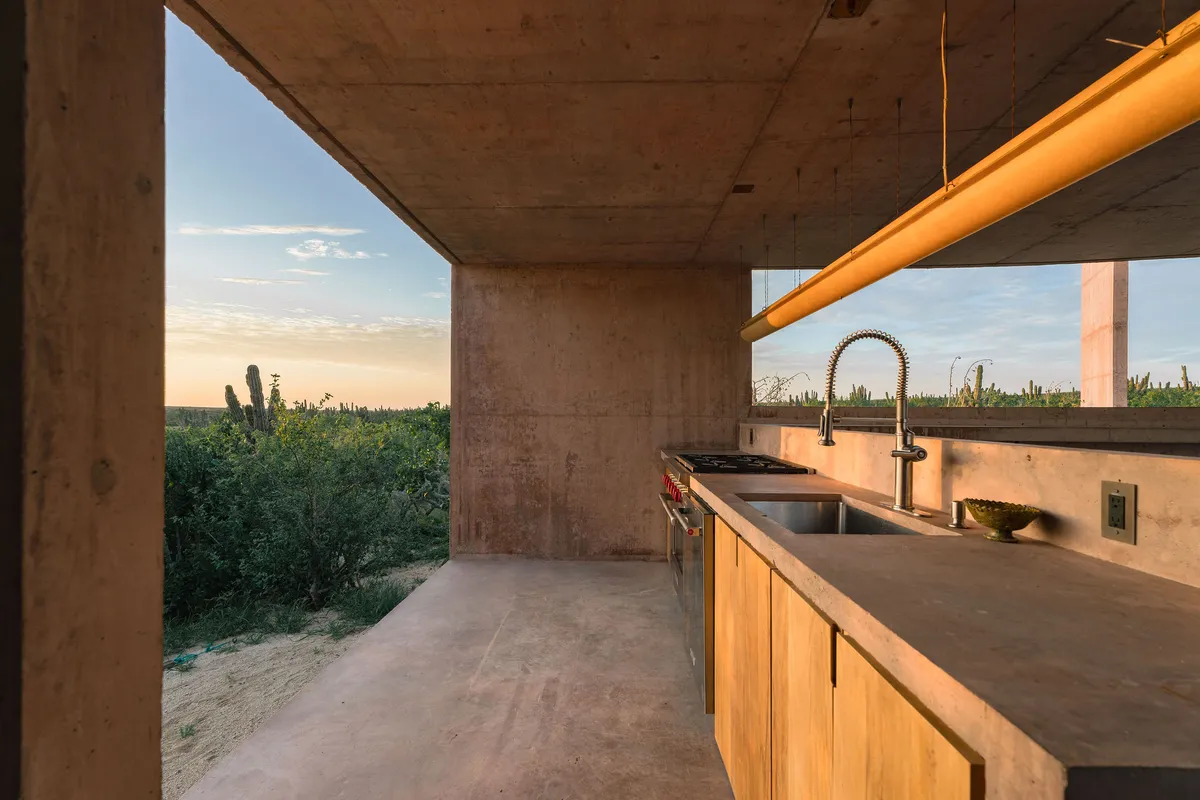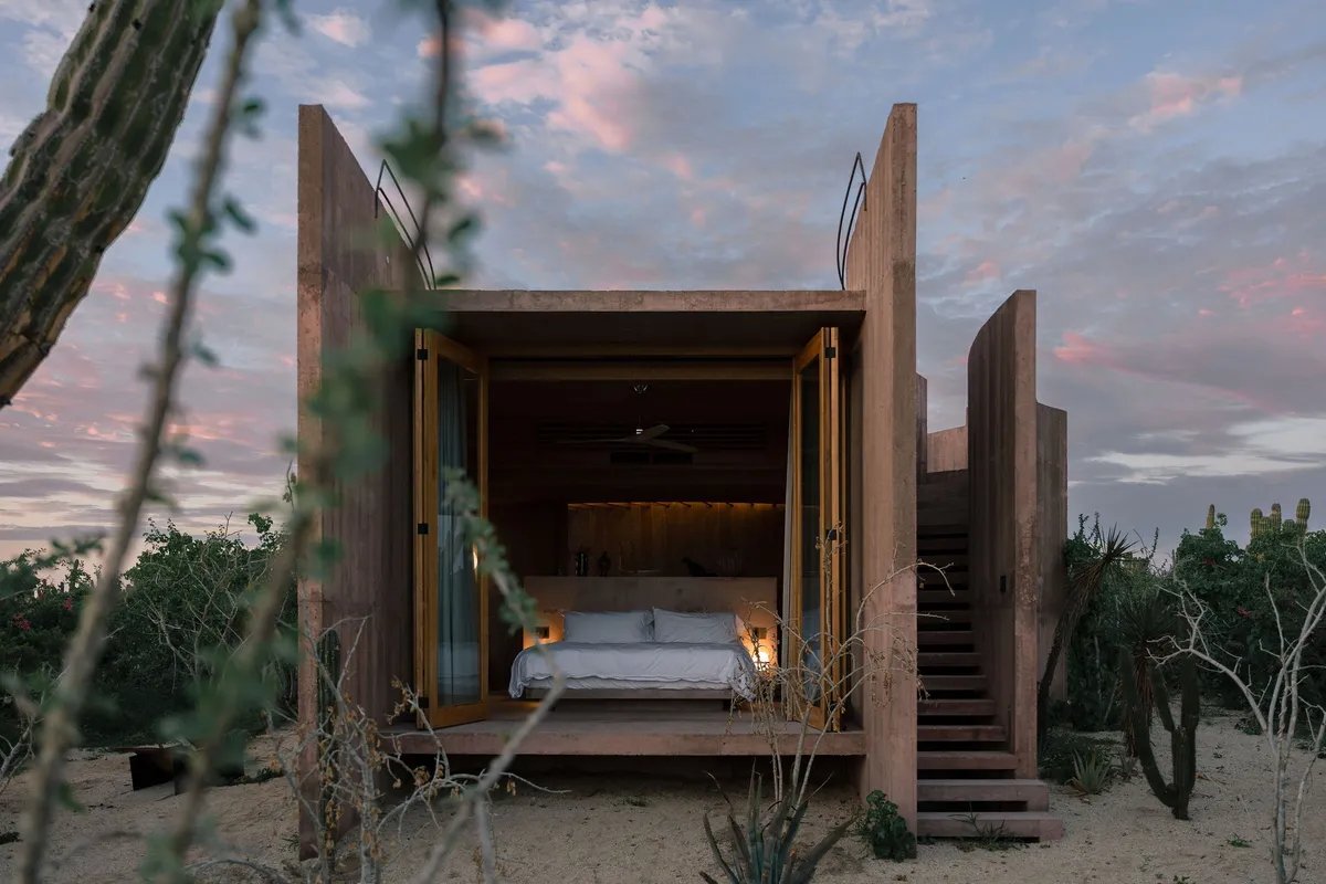 Rising from the desert landscape just north of Todos Santos, Nereidas is a brutalist statement piece softened by Baja’s wild beauty. Concrete walls, clean lines, and expansive windows frame endless views of the ocean and desert, creating a space that feels both sculptural and deeply livable.