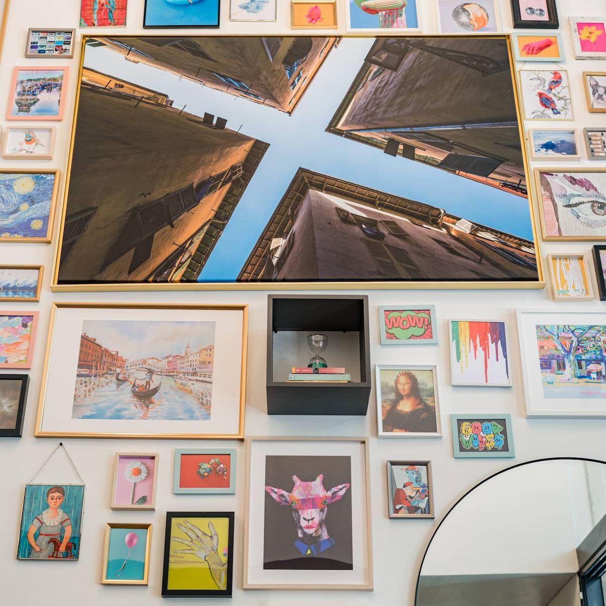 – Two swings anchored to a tree trunk embedded in the concrete wall