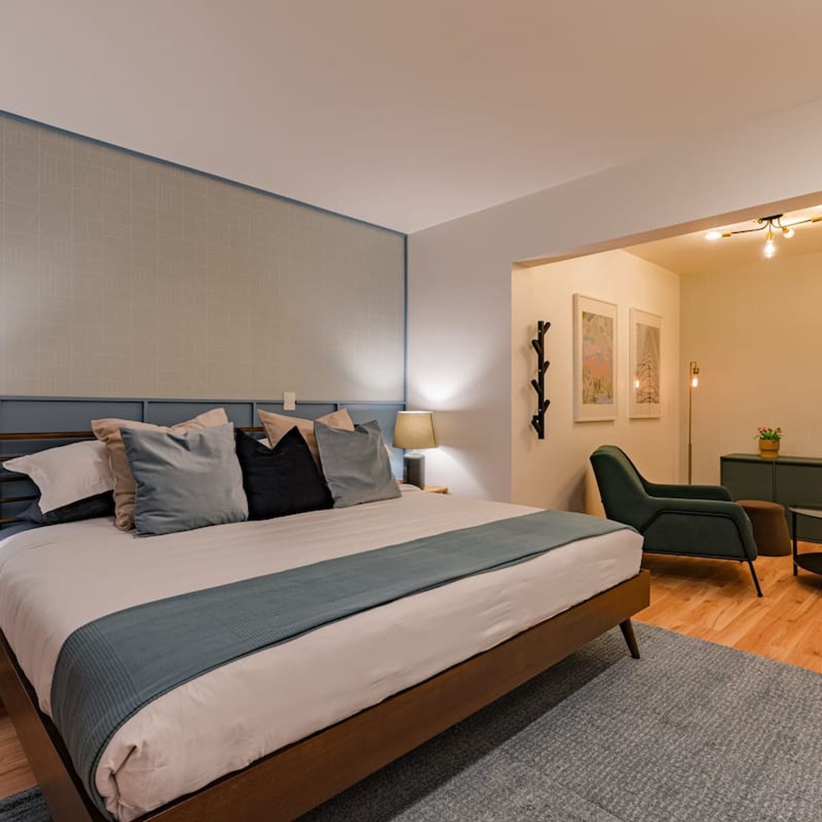 – Bedroom 1: King-size bed, small sitting area, full bathroom, closet