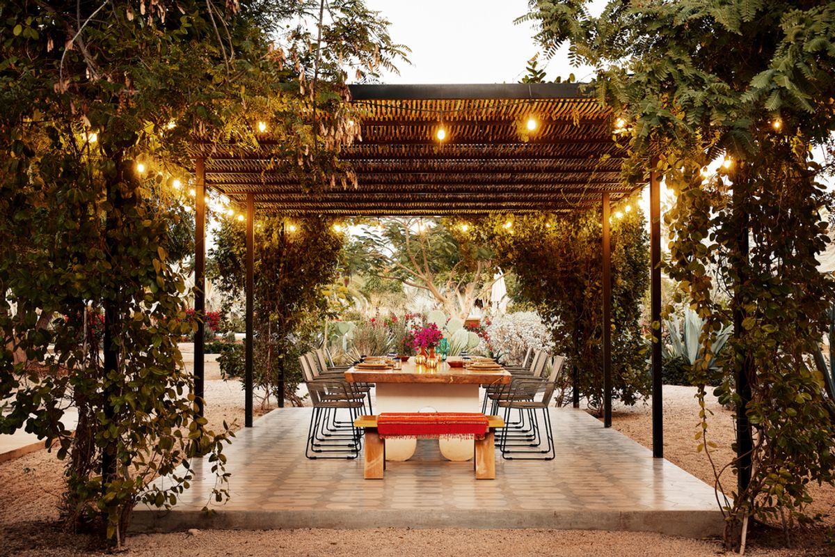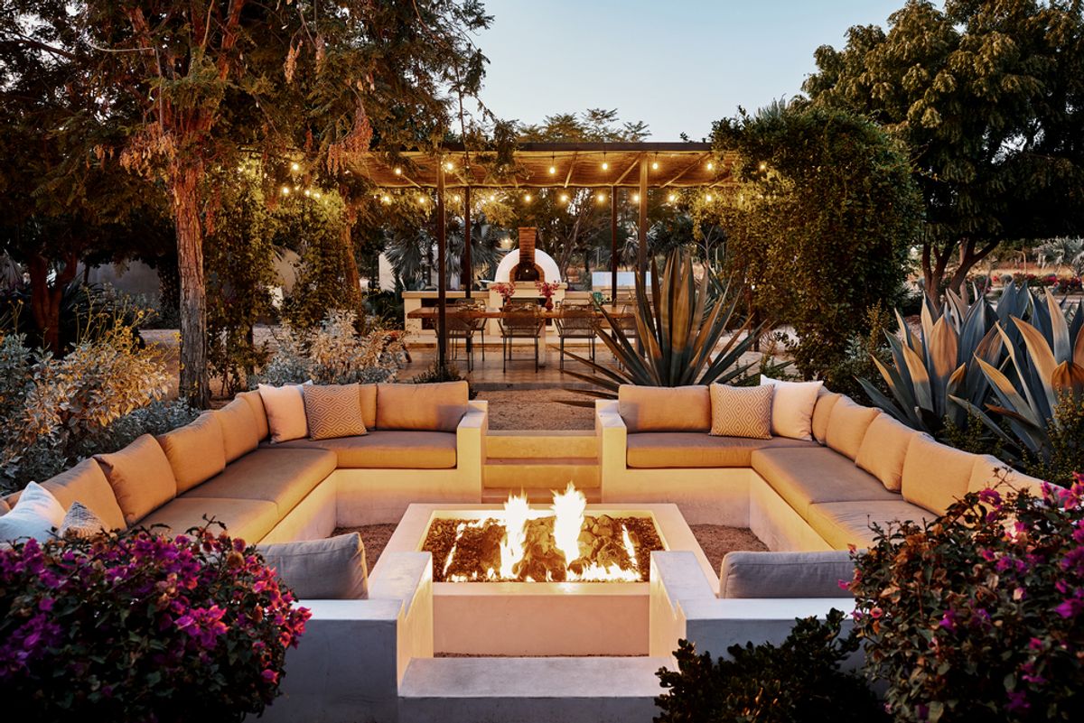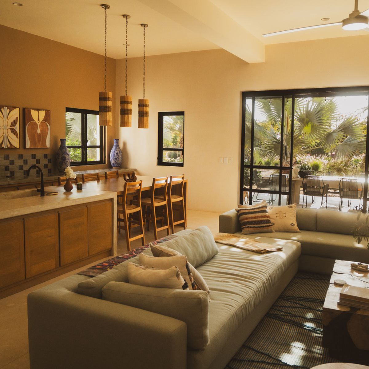 At the center of the estate is the communal house, the hub for gathering and dining. Here, guests have access to a full kitchen, indoor living room, laundry area, an outdoor dining terrace, and a wood-fired pizza oven. Just steps away, a 75-foot pool stretches alongside a jacuzzi and palapa, creating a relaxed environment for long days in the sun.