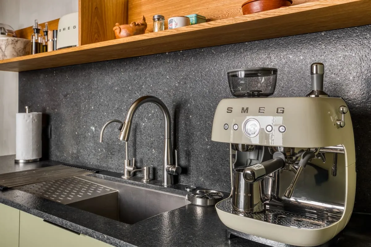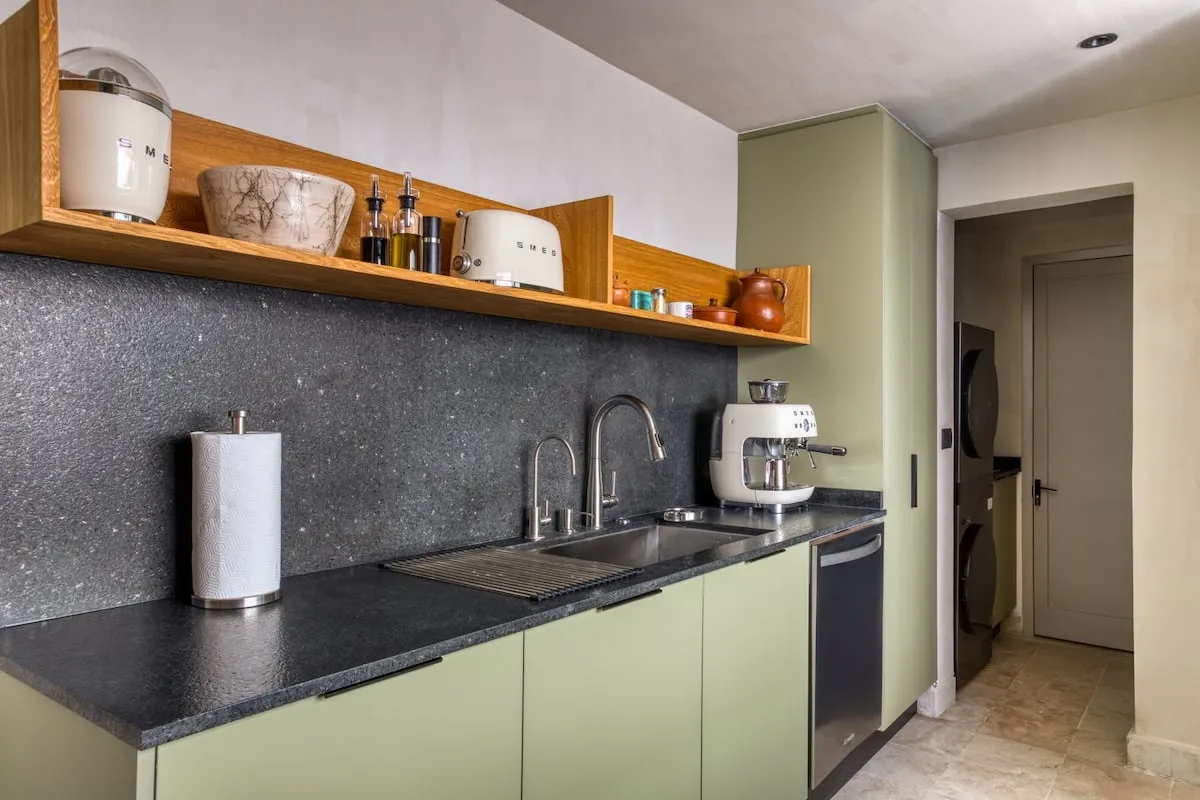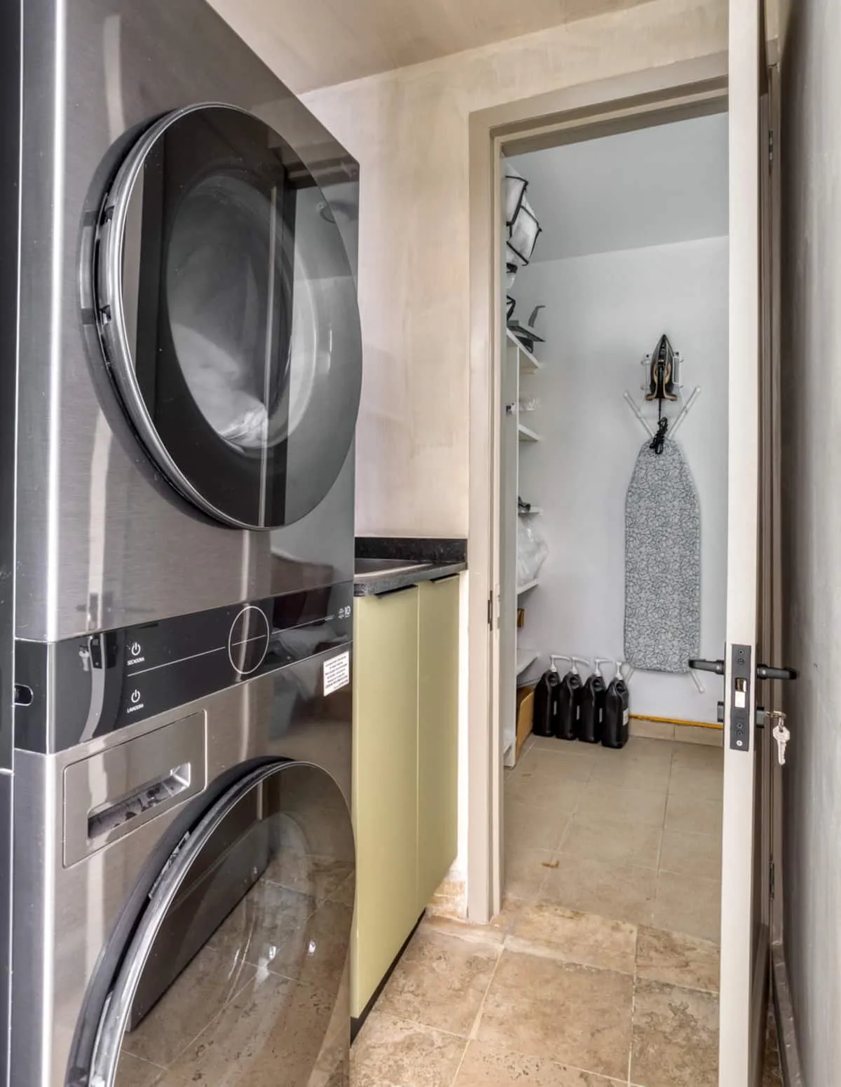 The fully equipped kitchen boasts premium SMEG appliances, ideal for preparing anything from a casual breakfast to a full dinner. A dedicated laundry area with washer and dryer adds convenience for longer stays.