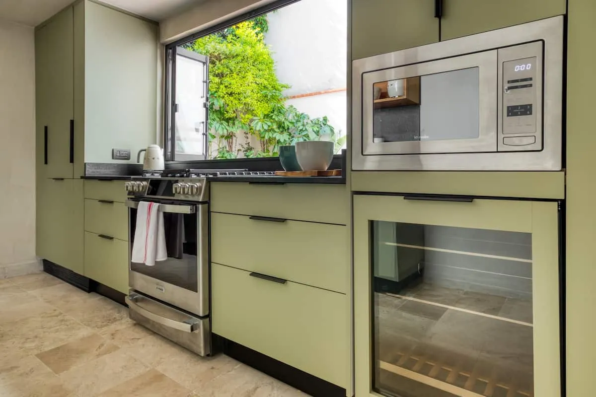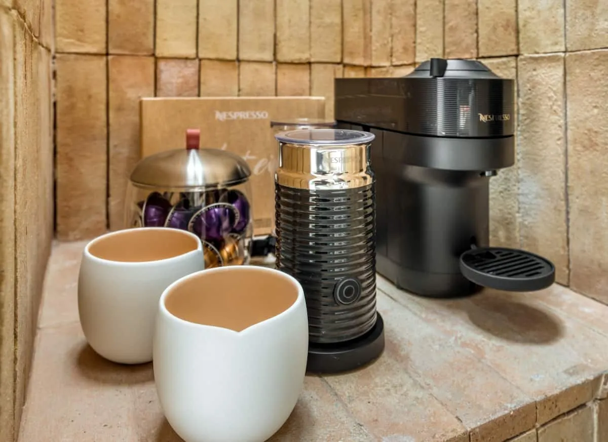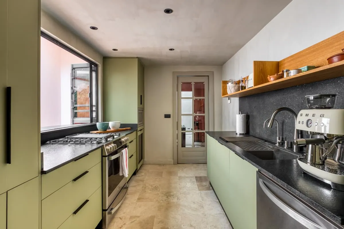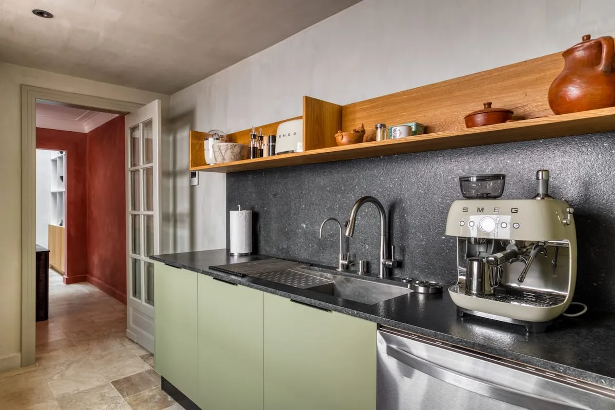 The fully equipped kitchen boasts premium SMEG appliances, ideal for preparing anything from a casual breakfast to a full dinner. A dedicated laundry area with washer and dryer adds convenience for longer stays.