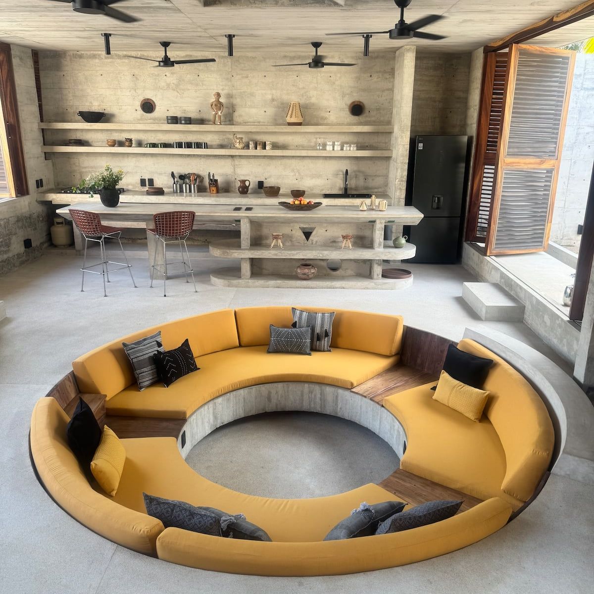 The dining area, living room, and kitchen are communal spaces — open, airy, and meant to be shared. Here, brutalist architecture meets warmth, as a local cook prepares fresh, soulful Oaxacan meals that bring people together around the table for a small extra cost.