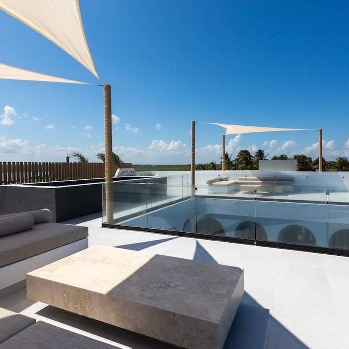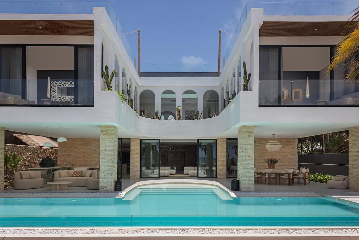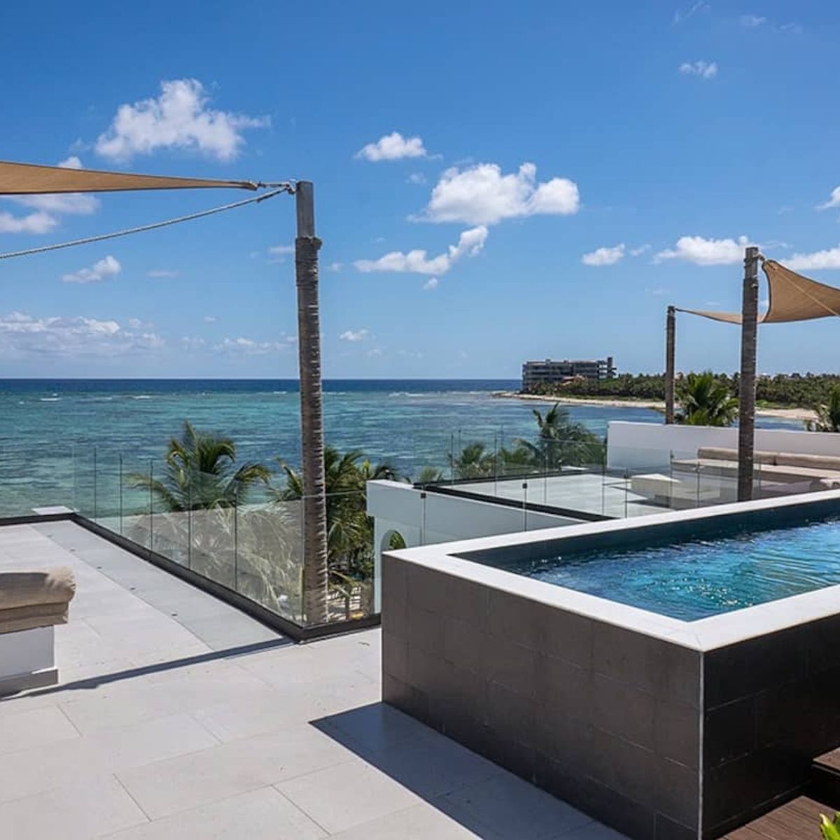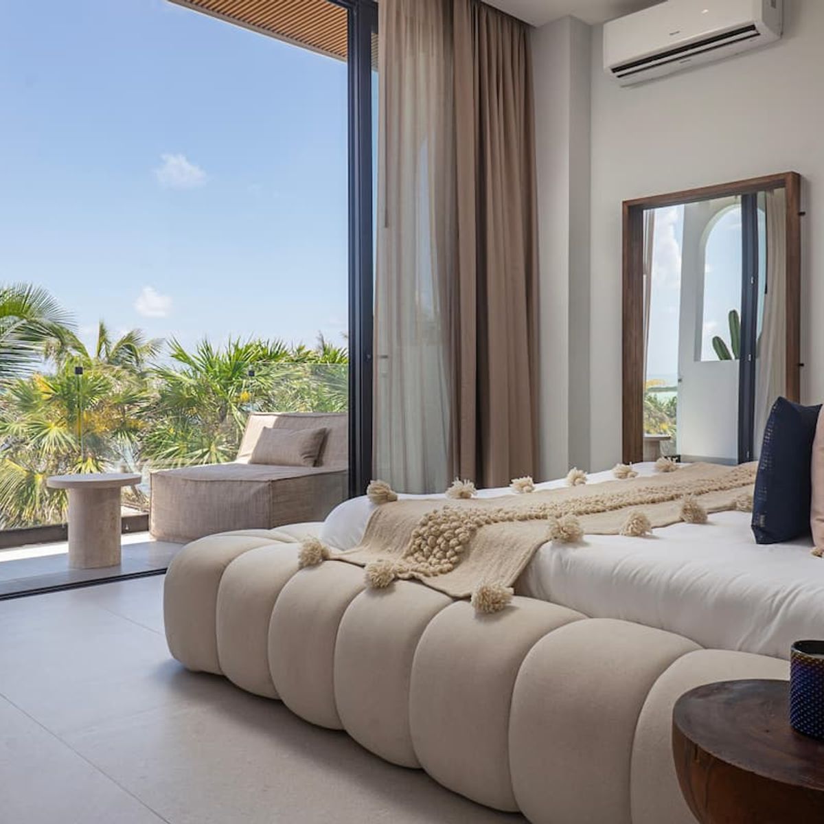 The home offers expansive indoor–outdoor living, two pools — including a rooftop pool that transforms into a jacuzzi — and direct access to a pristine stretch of beach. Six generously proportioned suites, each with a king-size bed, en-suite bathroom, and air conditioning, are oriented to capture either sweeping sea views or lush jungle vistas. Two master suites feature private terraces and spa-style bathrooms with rain showers and freestanding bathtubs.