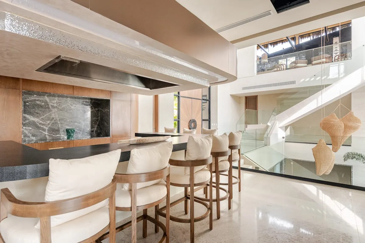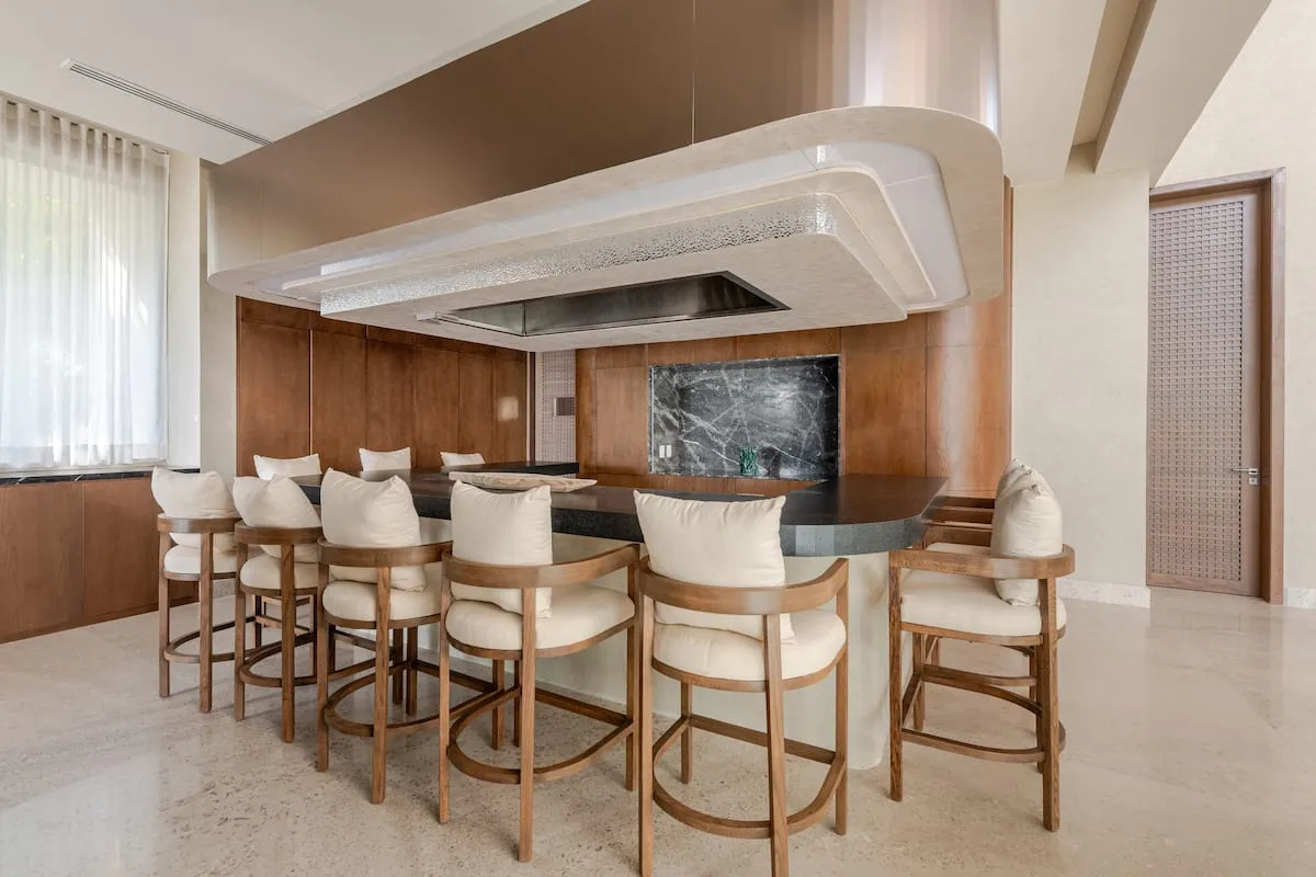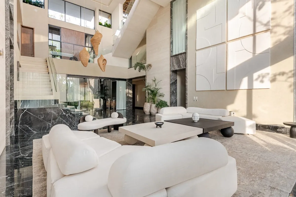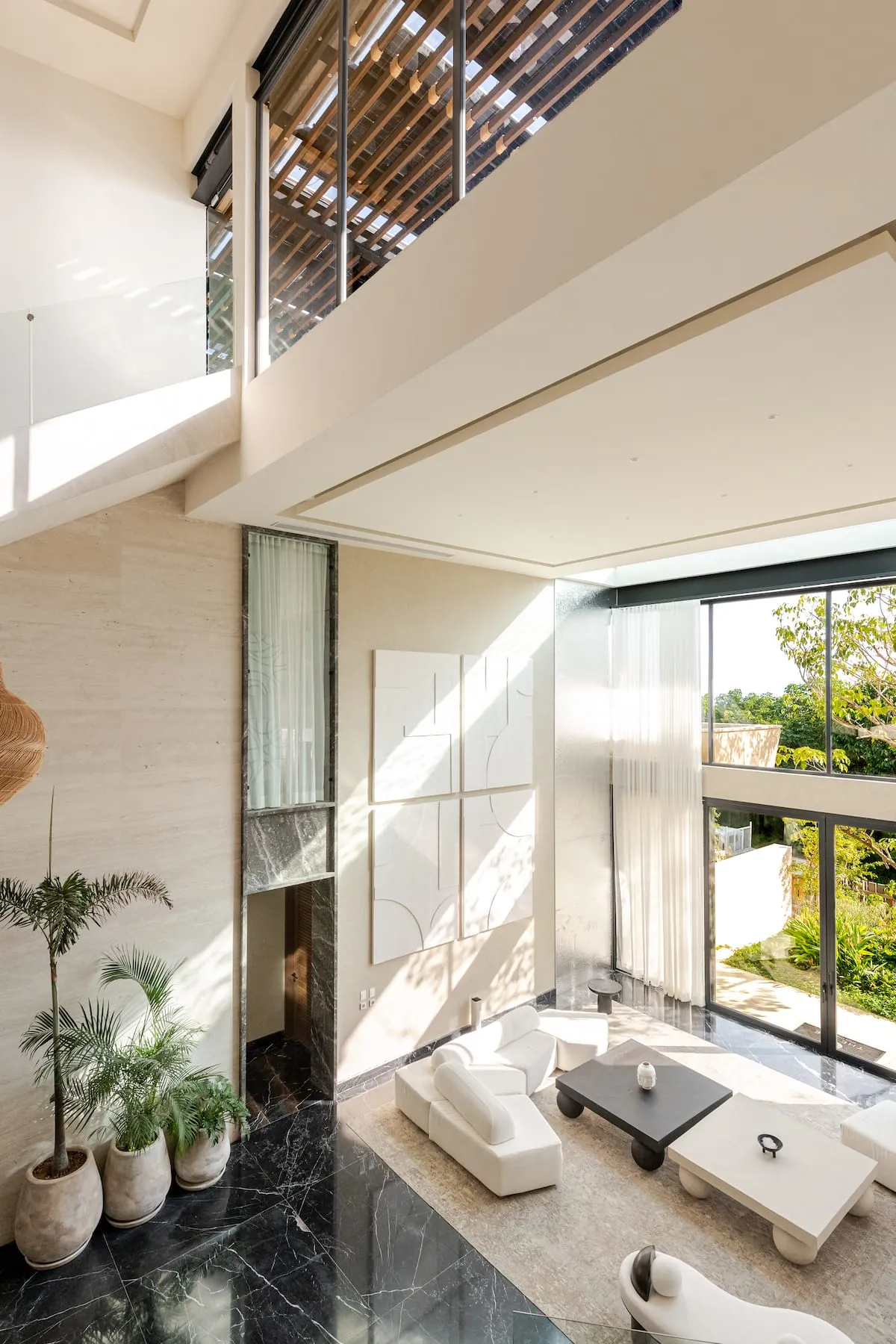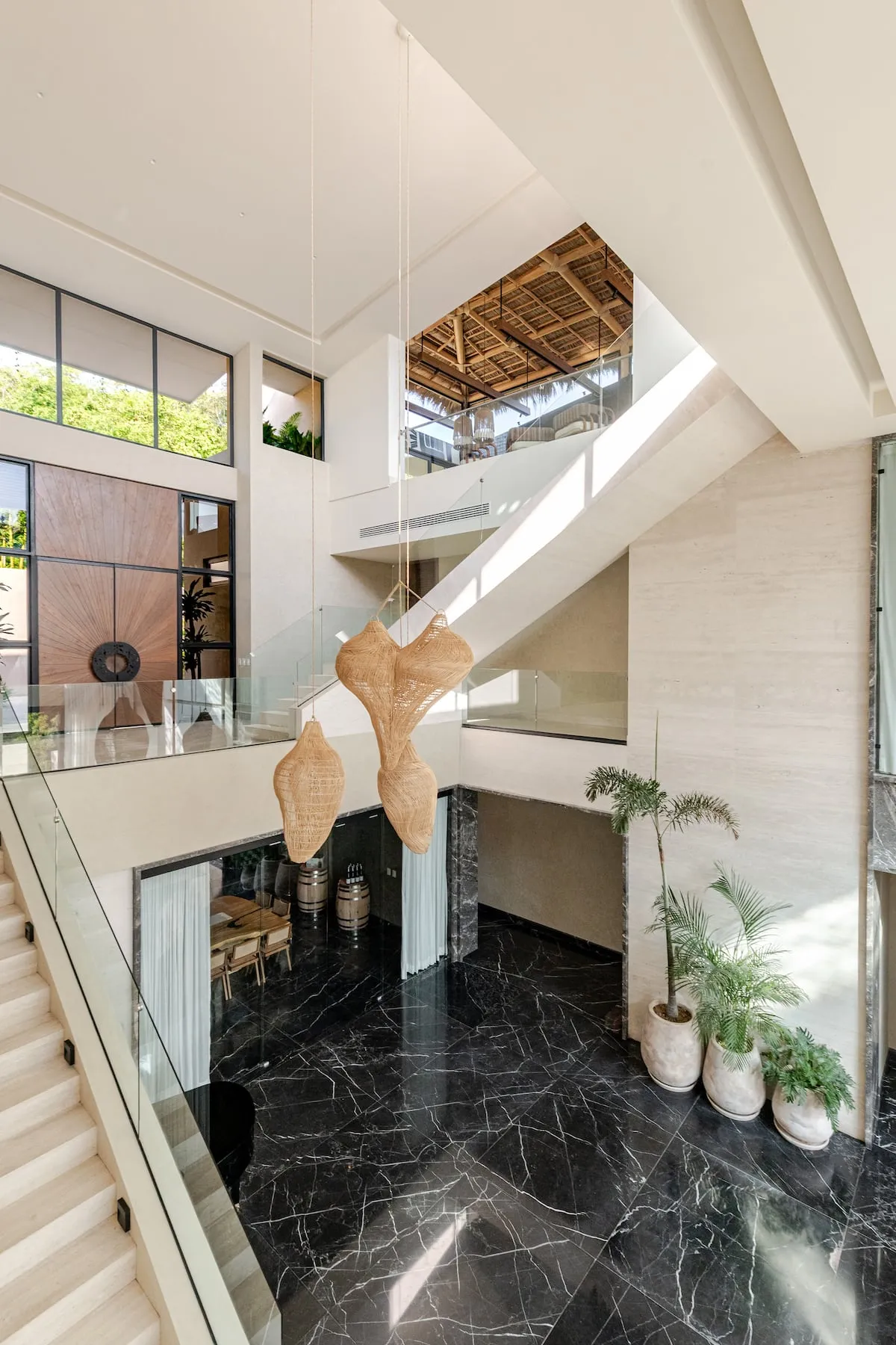 The architecture is bold yet fluid. A grand living space with a 50-foot ceiling opens entirely to the ocean breeze, dissolving the boundary between indoors and out. Natural light, scale, and materials work together to create a constant sense of openness and awe.