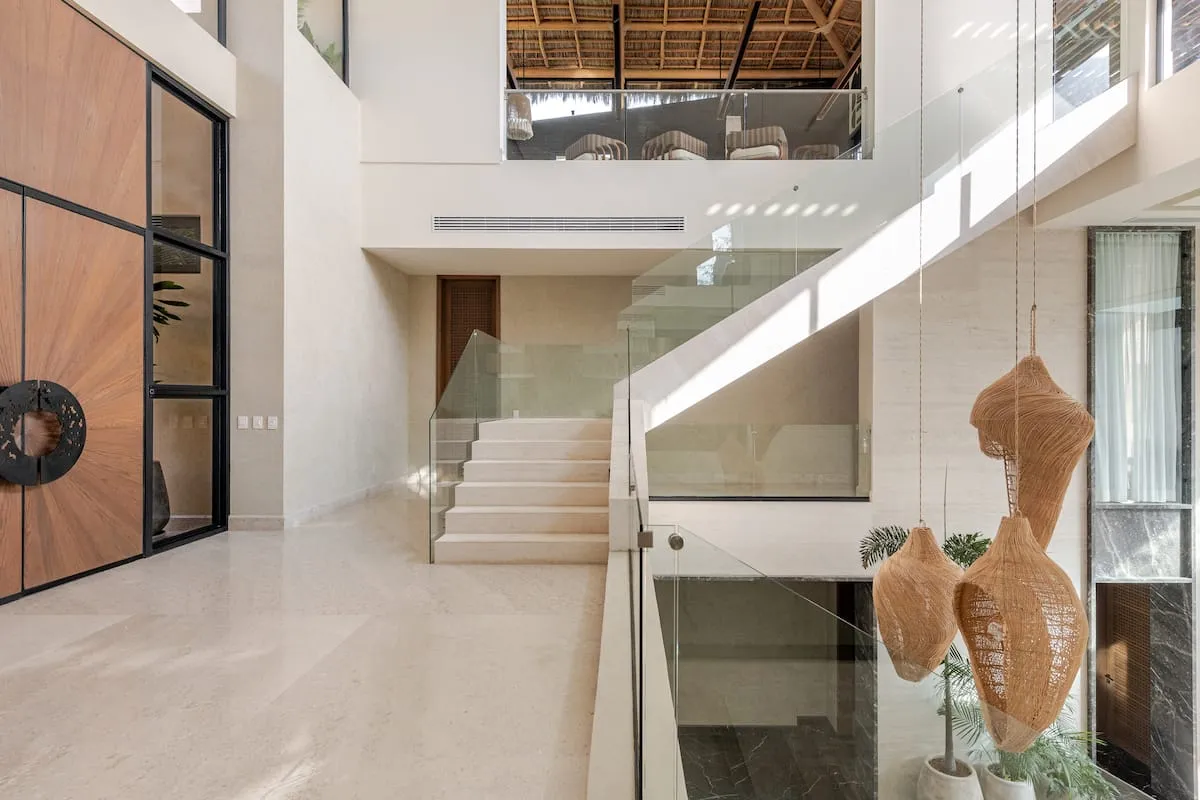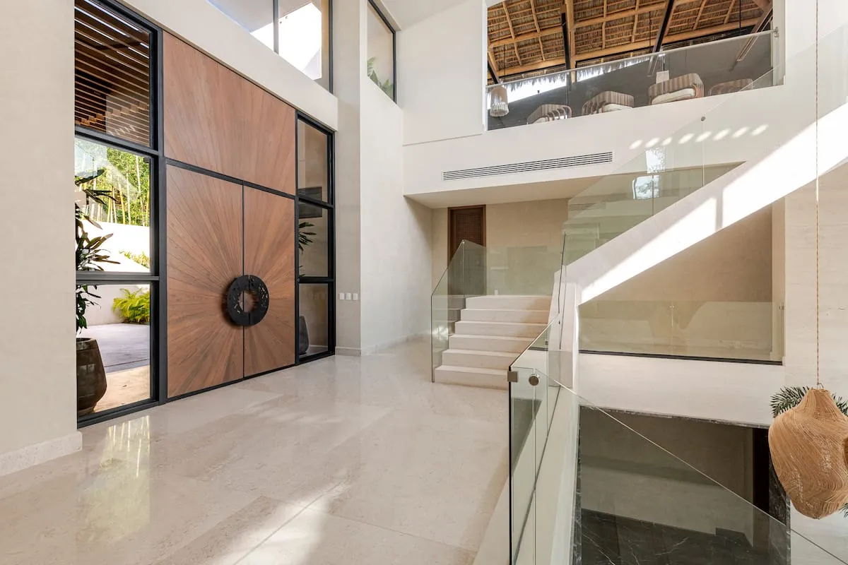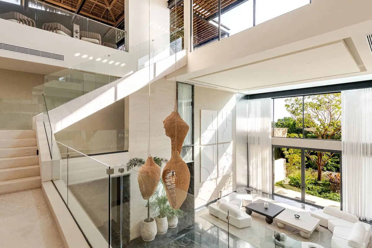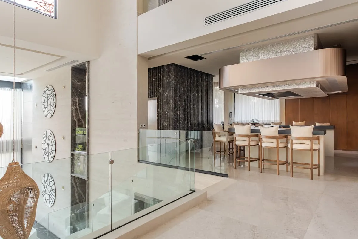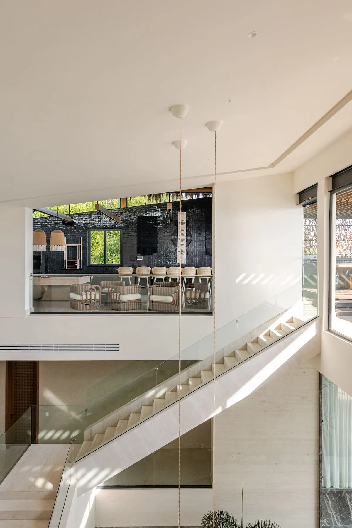The architecture is bold yet fluid. A grand living space with a 50-foot ceiling opens entirely to the ocean breeze, dissolving the boundary between indoors and out. Natural light, scale, and materials work together to create a constant sense of openness and awe.