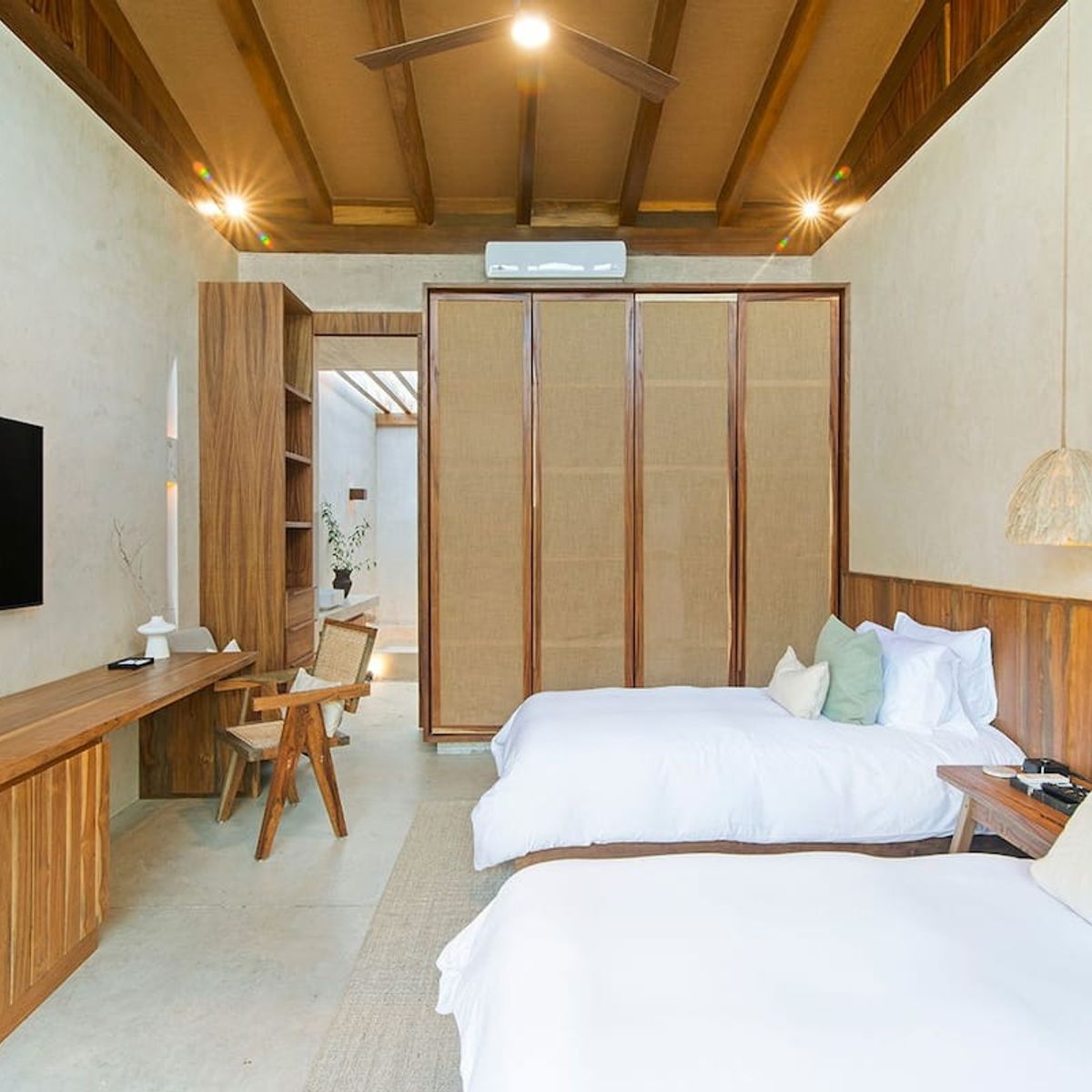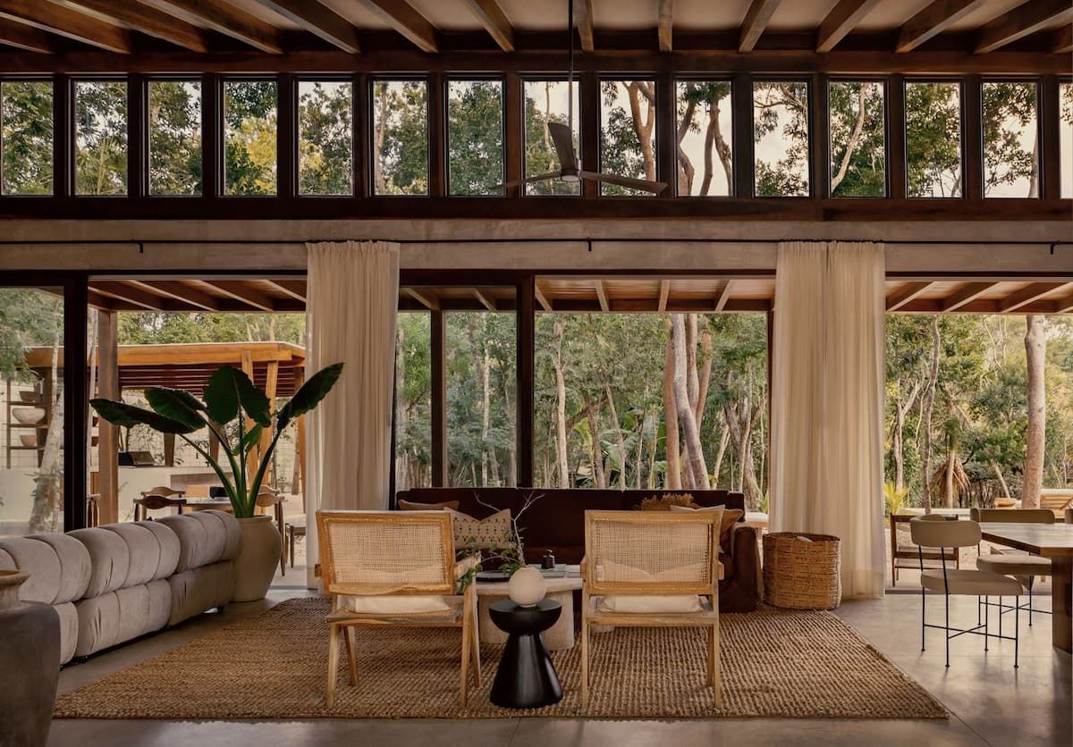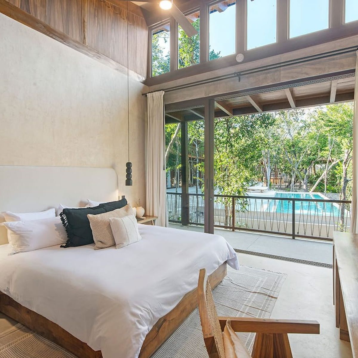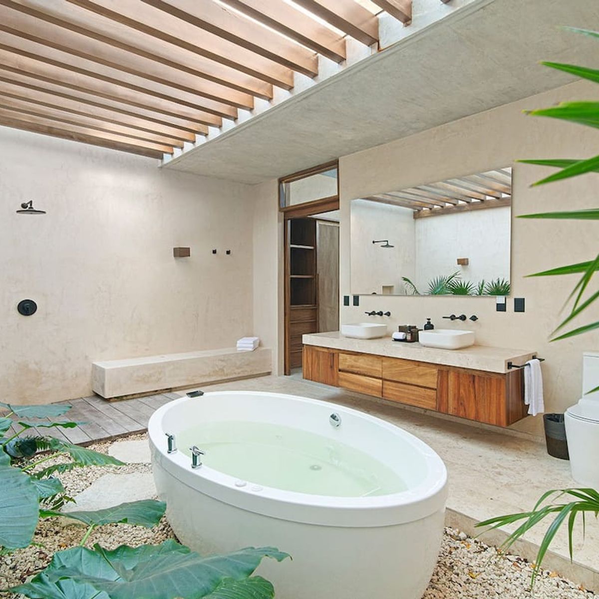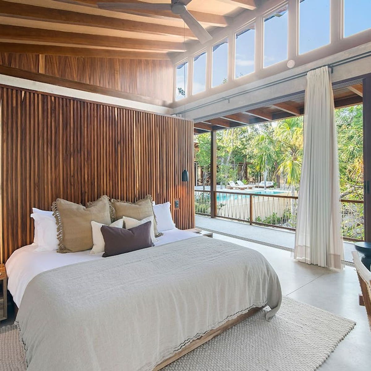The serene bedrooms each feature indoor-outdoor bathrooms. An infinity pool overlooks the jungle, and a hidden cenote adds natural charm. Off-grid and eco-friendly, Casa Tropical offers sustainable luxury in the heart of Tulum.