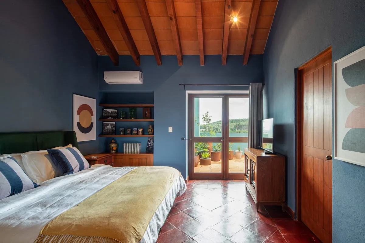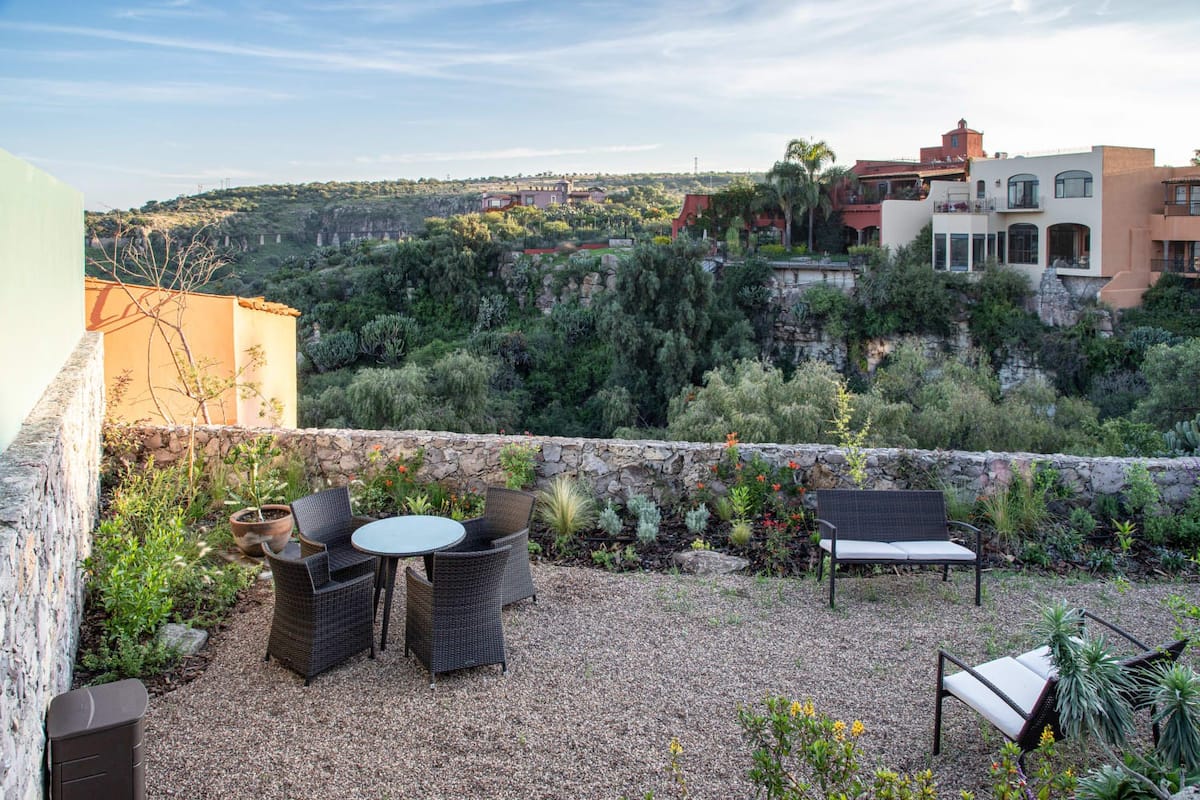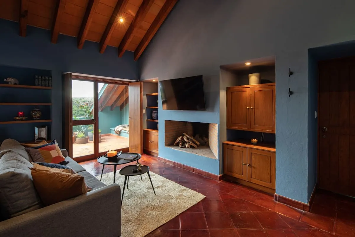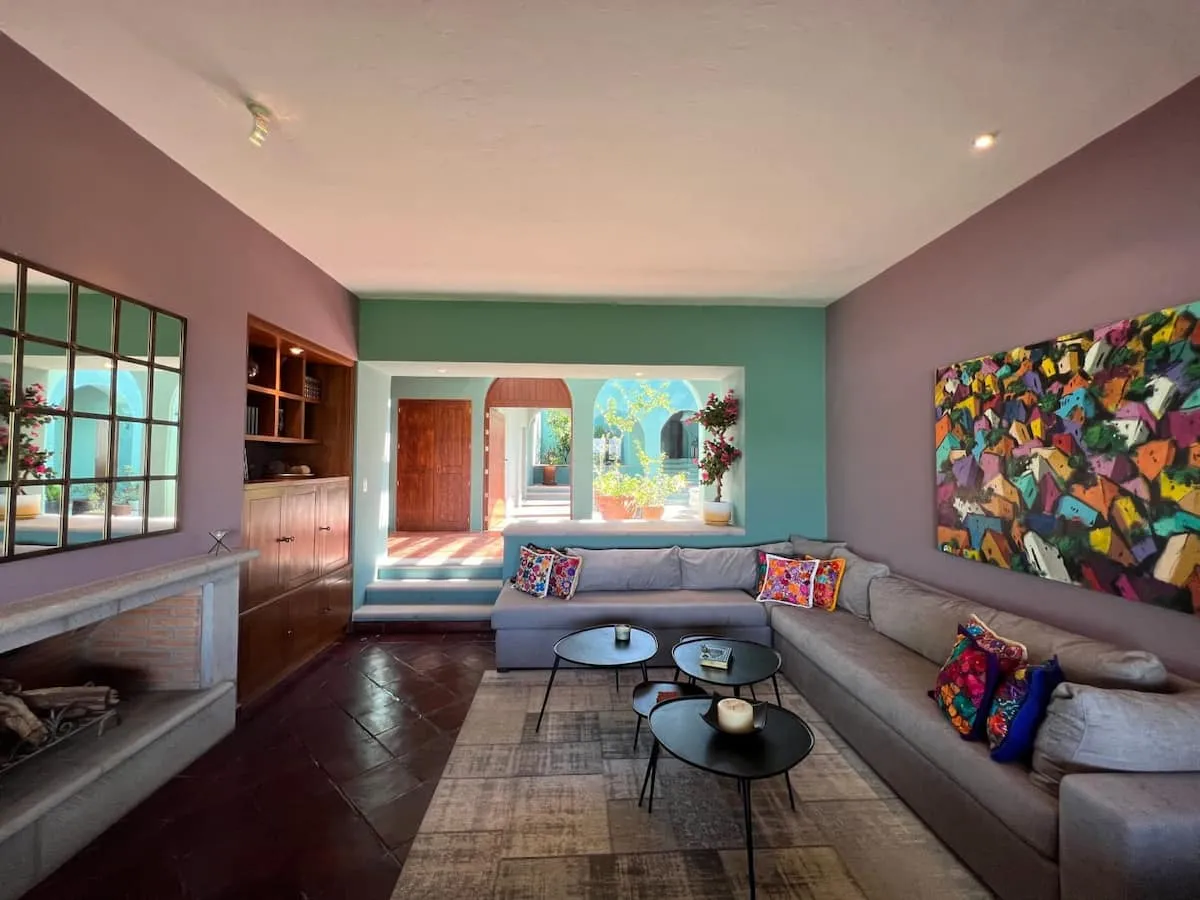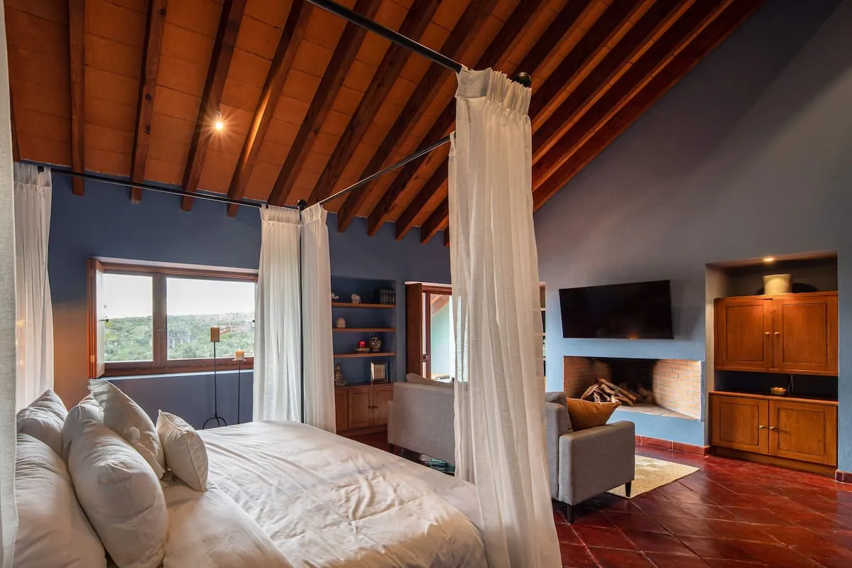 This elegant villa in Los Balcones in San Miguel de Allende offers a perfect blend of luxury and comfort, accommodating up to 17 guests. It features five stylish bedrooms, four with ensuite bathrooms, private balconies, and smart TVs. The open living spaces include a full kitchen, wood fireplace, and dedicated workspaces, while the landscaped multi-level backyard boasts a central stone courtyard, outdoor dining, a fire pit, and breathtaking mountain views.