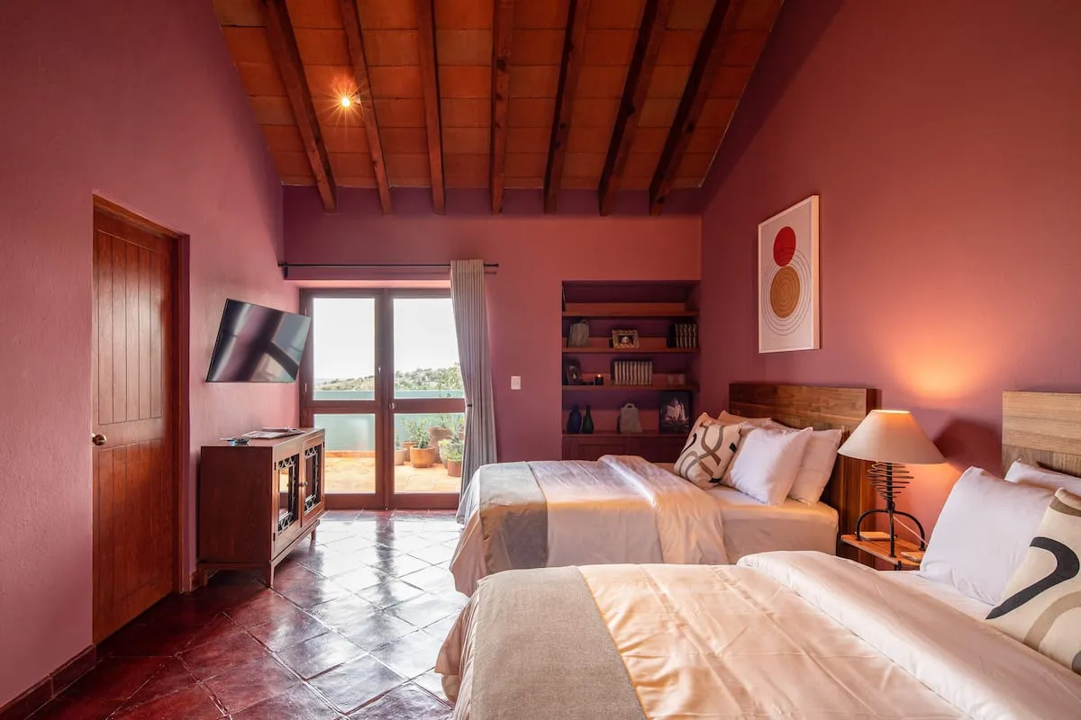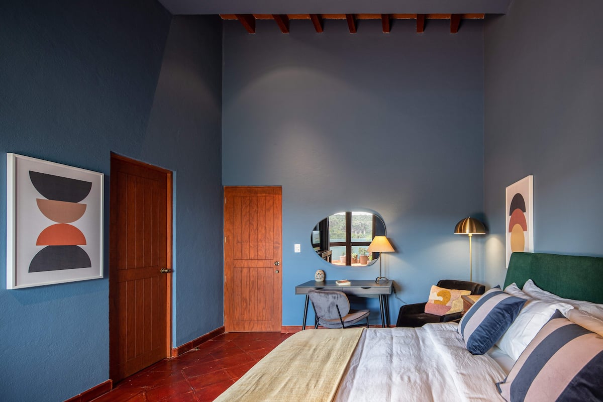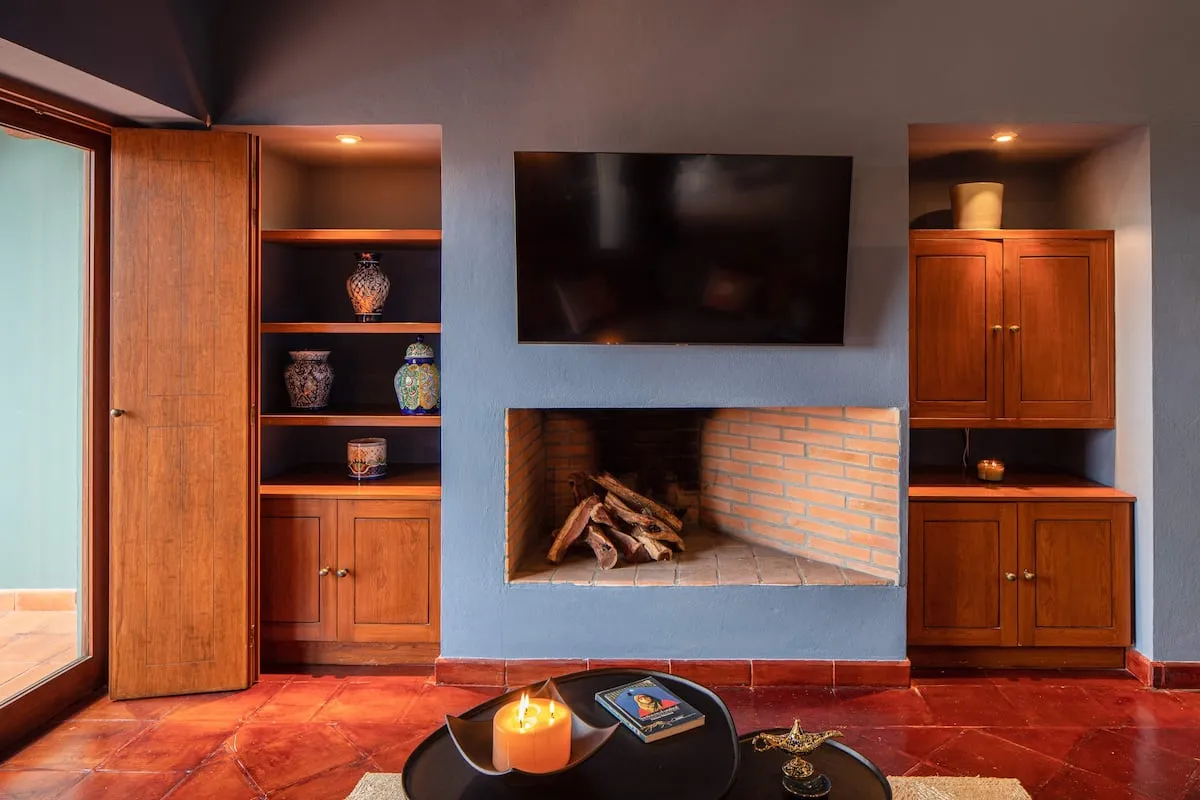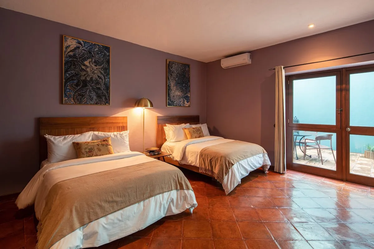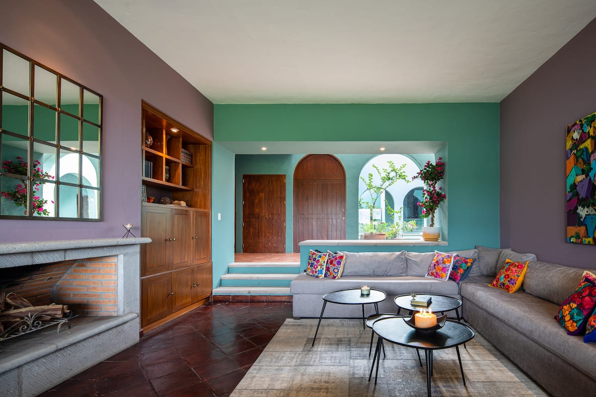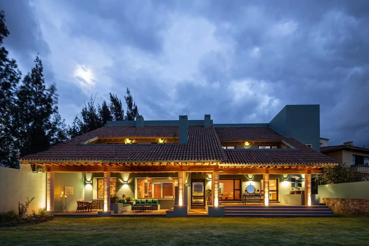 This elegant villa in Los Balcones in San Miguel de Allende offers a perfect blend of luxury and comfort, accommodating up to 17 guests. It features five stylish bedrooms, four with ensuite bathrooms, private balconies, and smart TVs. The open living spaces include a full kitchen, wood fireplace, and dedicated workspaces, while the landscaped multi-level backyard boasts a central stone courtyard, outdoor dining, a fire pit, and breathtaking mountain views.