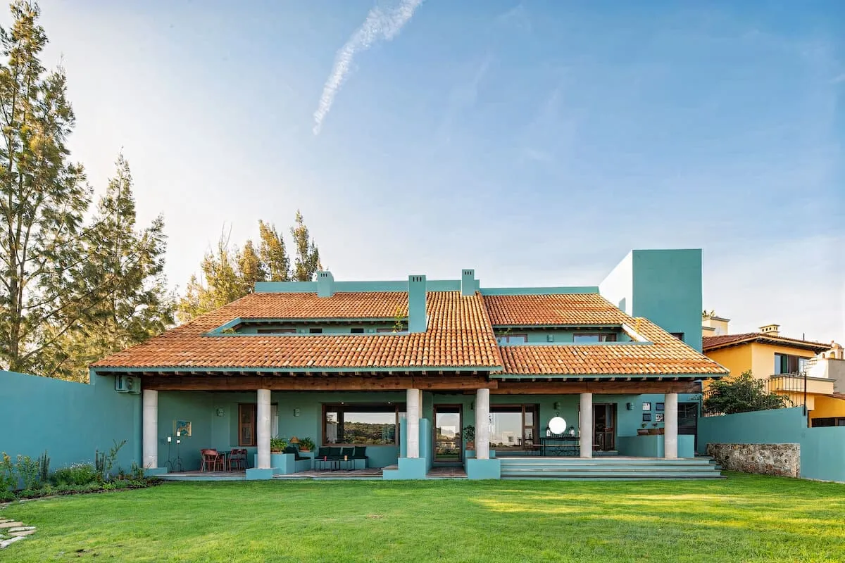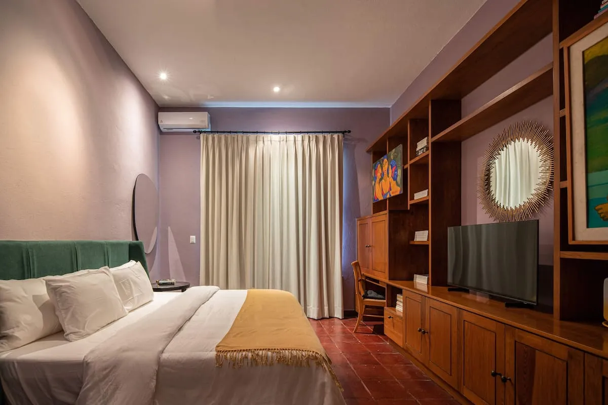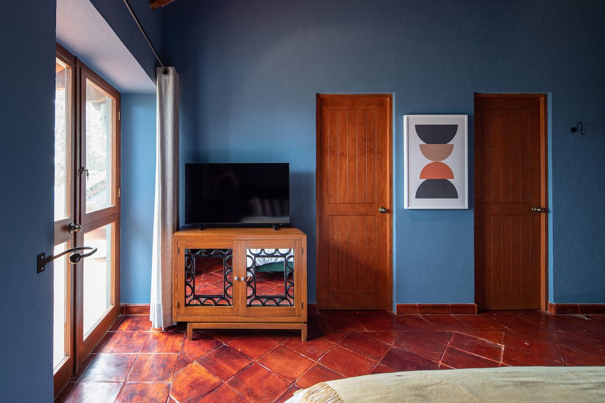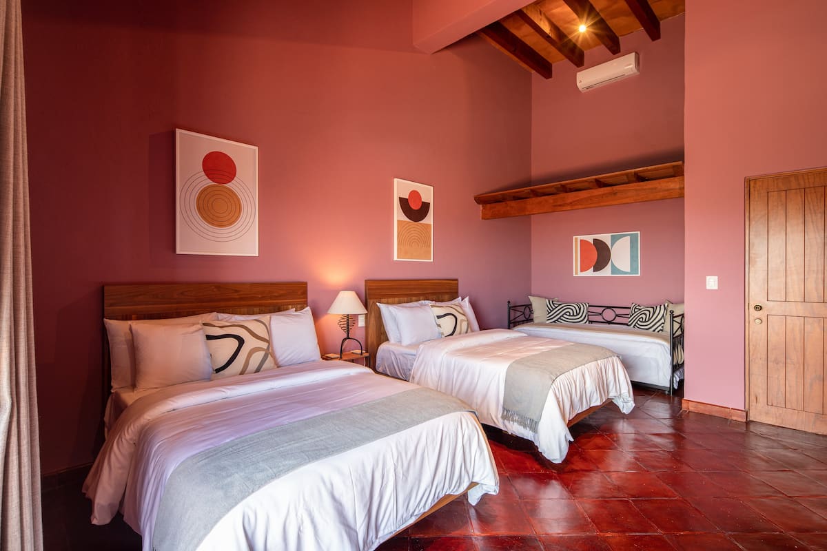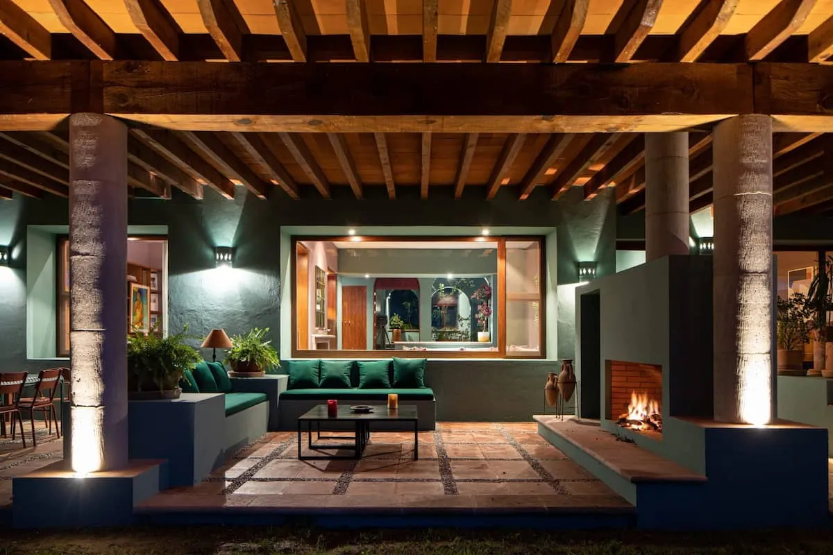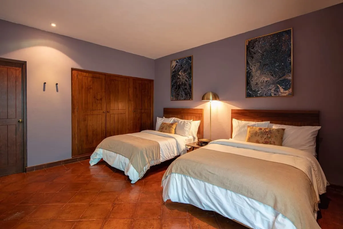 This elegant villa in Los Balcones in San Miguel de Allende offers a perfect blend of luxury and comfort, accommodating up to 17 guests. It features five stylish bedrooms, four with ensuite bathrooms, private balconies, and smart TVs. The open living spaces include a full kitchen, wood fireplace, and dedicated workspaces, while the landscaped multi-level backyard boasts a central stone courtyard, outdoor dining, a fire pit, and breathtaking mountain views.