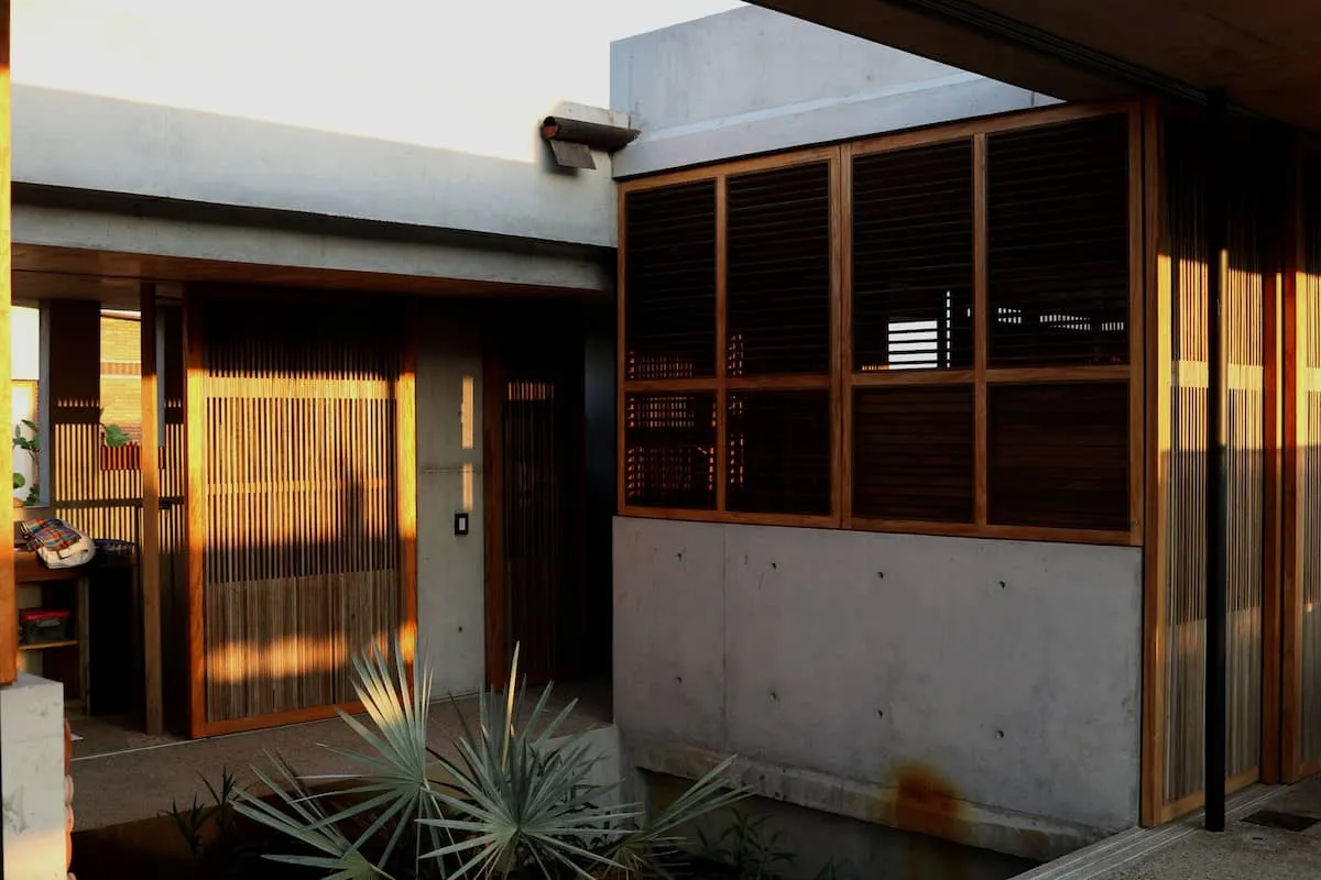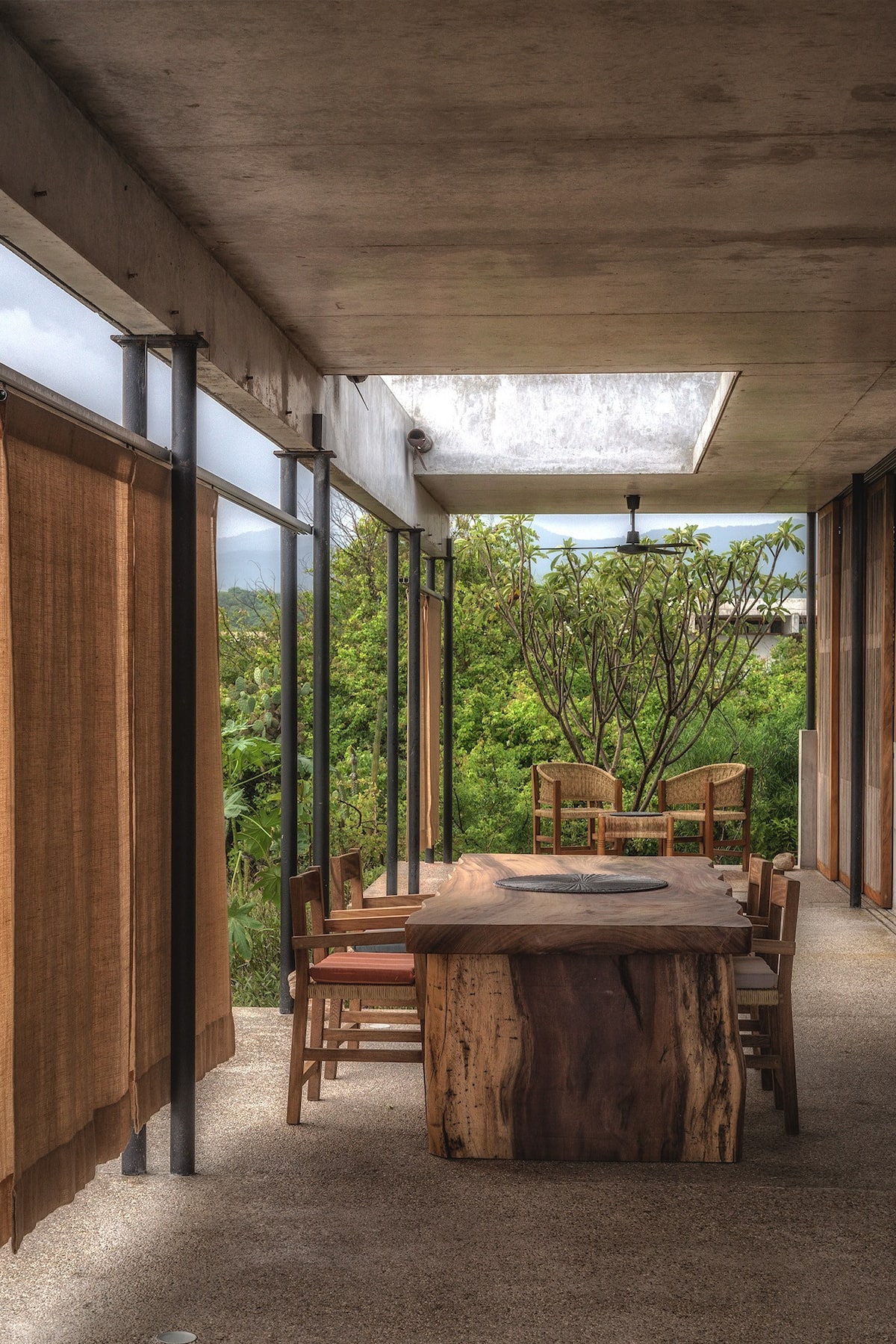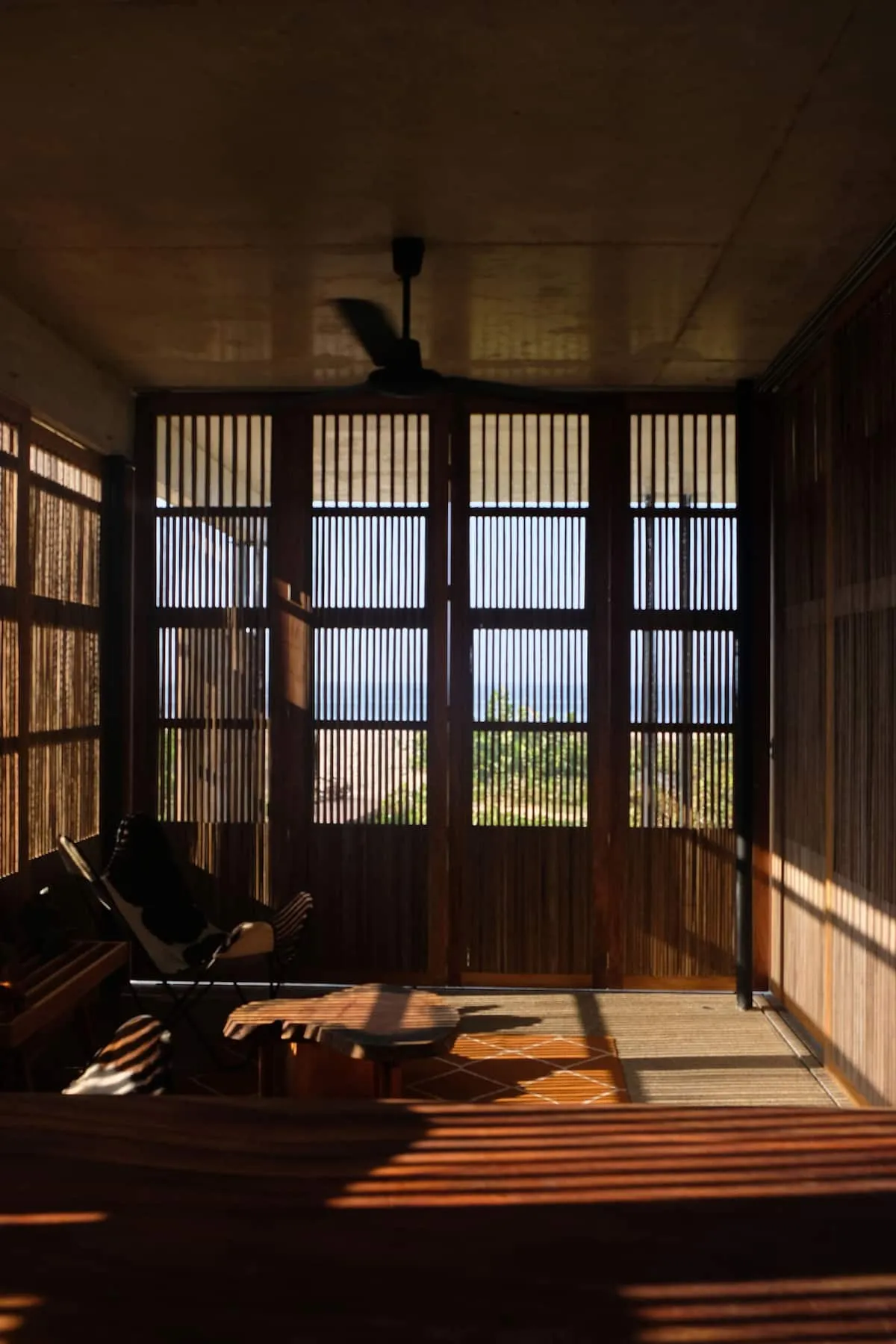 Both units are divided in two, like a yin and yang figure; half of the house is conceived as a gallery space to frame nature outside, while the other is oriented towards the intimate interior space. Sliding walls keep the interior spaces in constant flux; these handmade wooden panels allow inhabitants to control the configuration almost entirely, making each experience of the homes unique.
