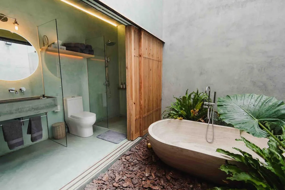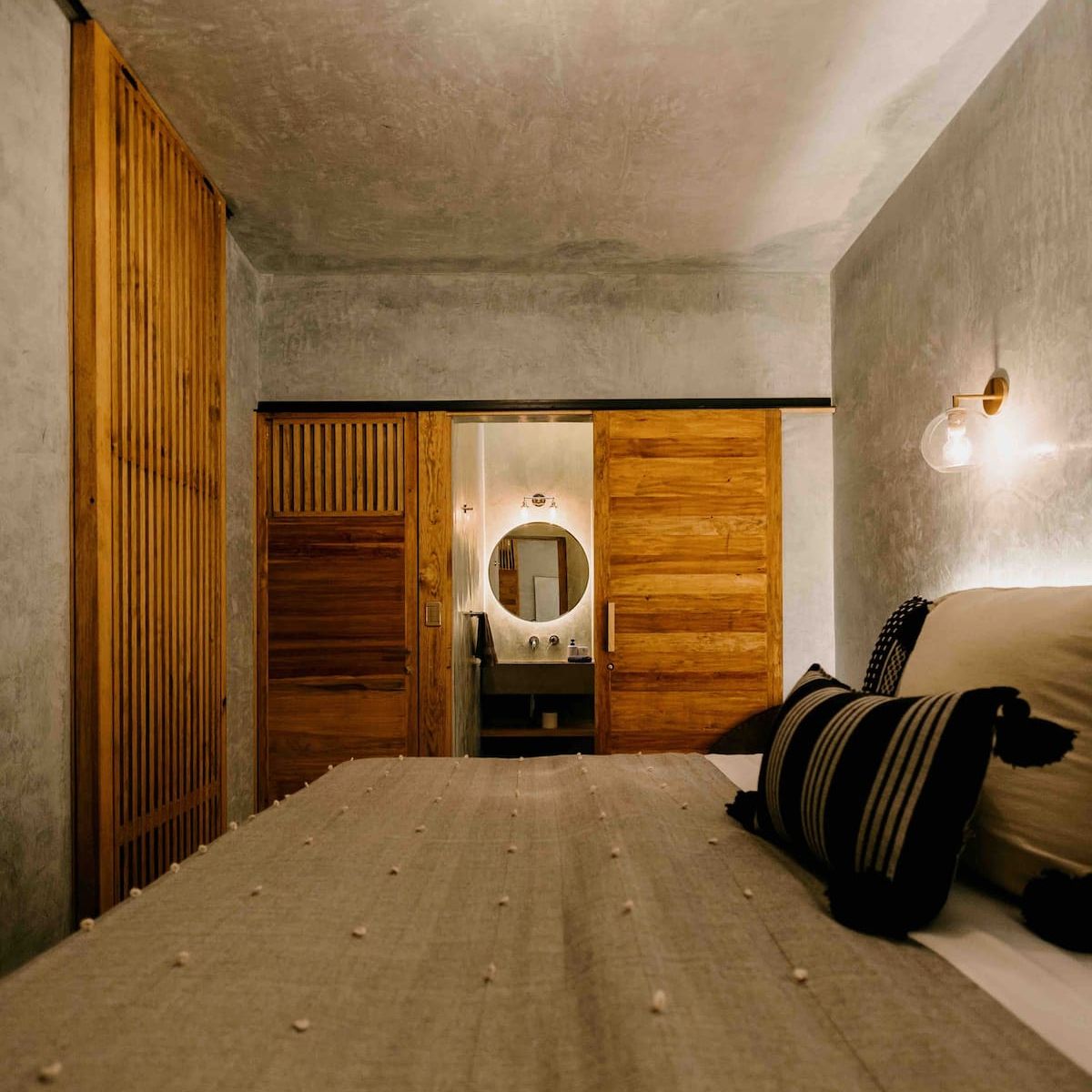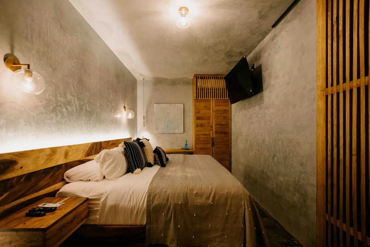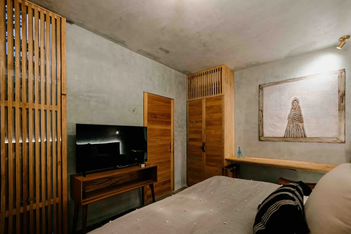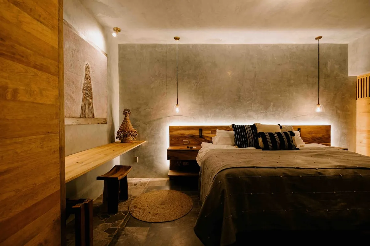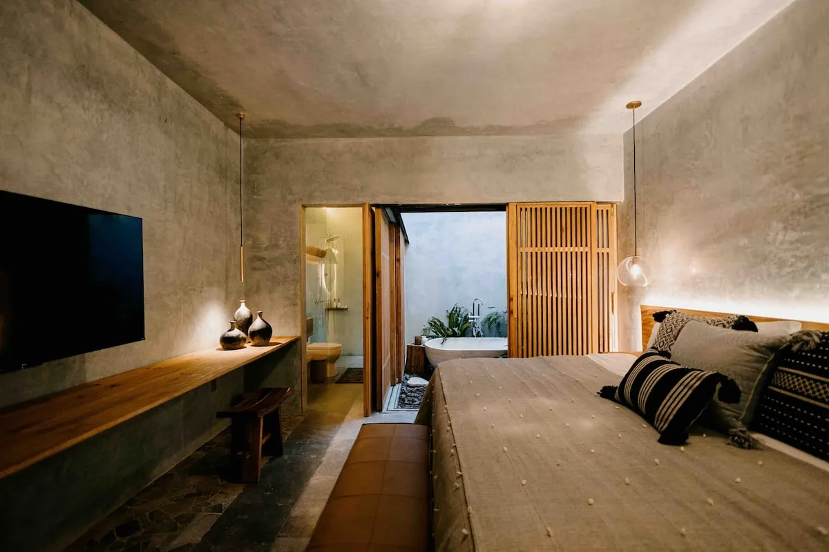 Finishes include lime-polished walls in local green tones characteristic of cantera stone, with the central courtyard highlighted in crimson. Vegetation is integrated throughout the design—patios, terraces, and walkways—to provide shade, freshness, and tranquility.