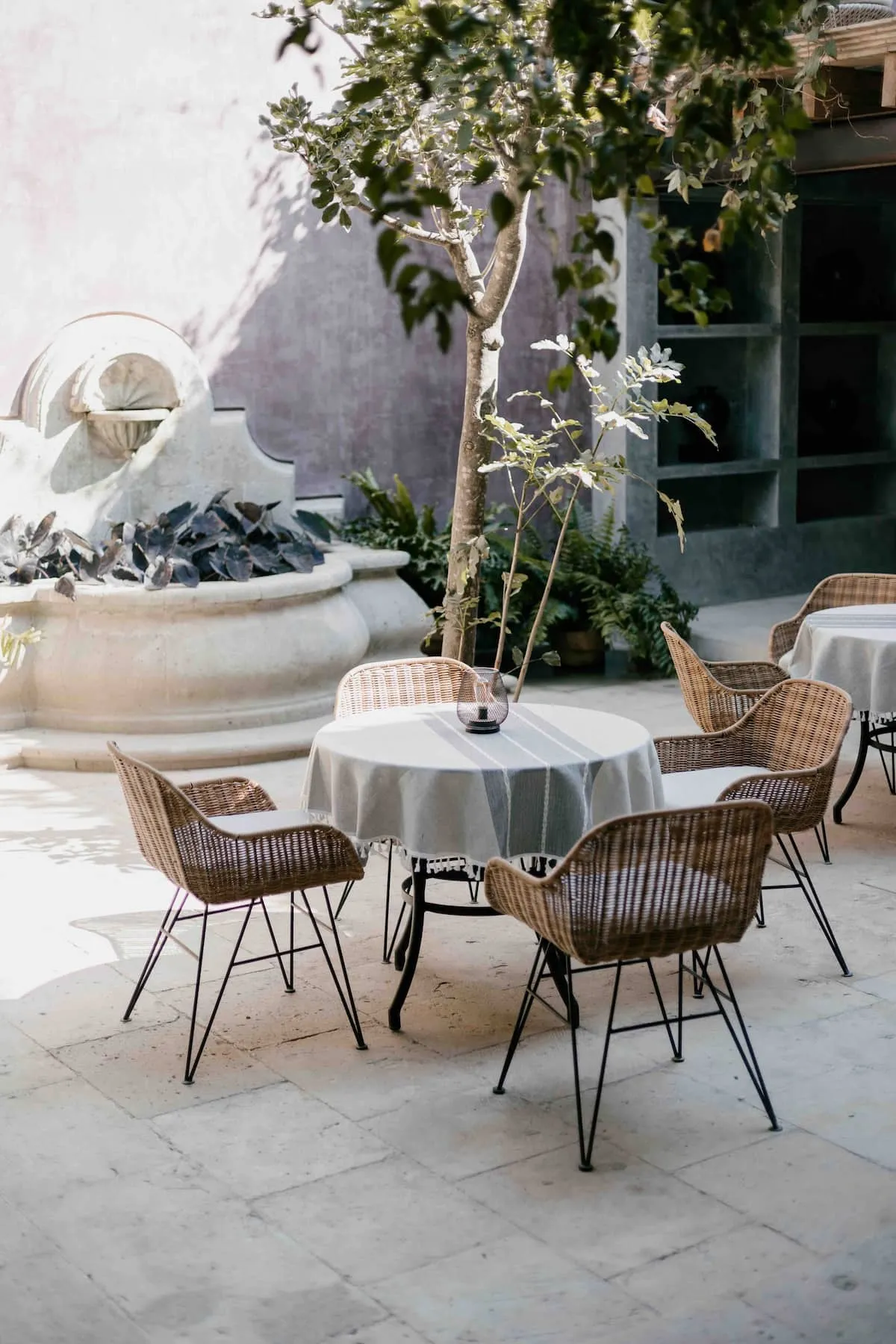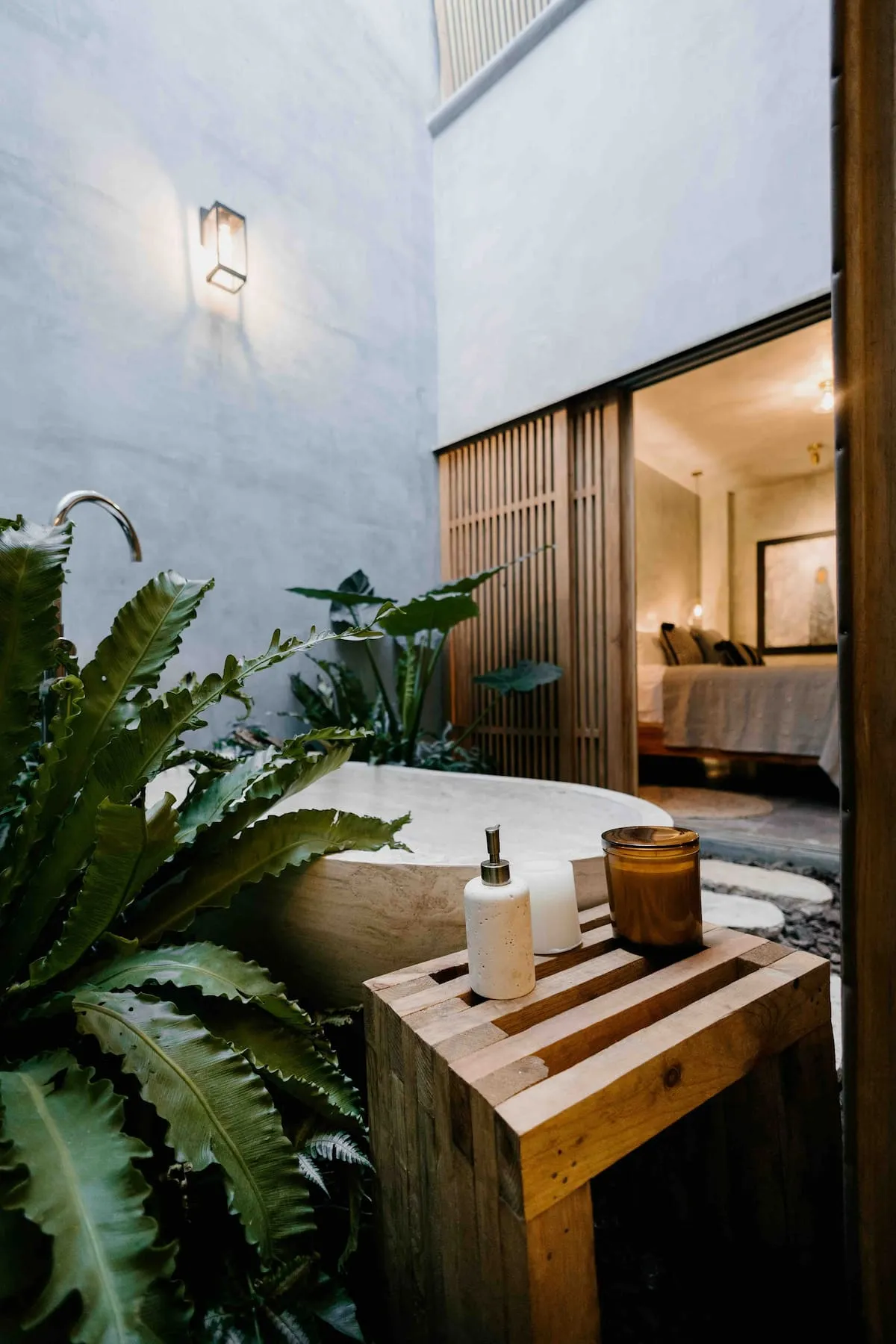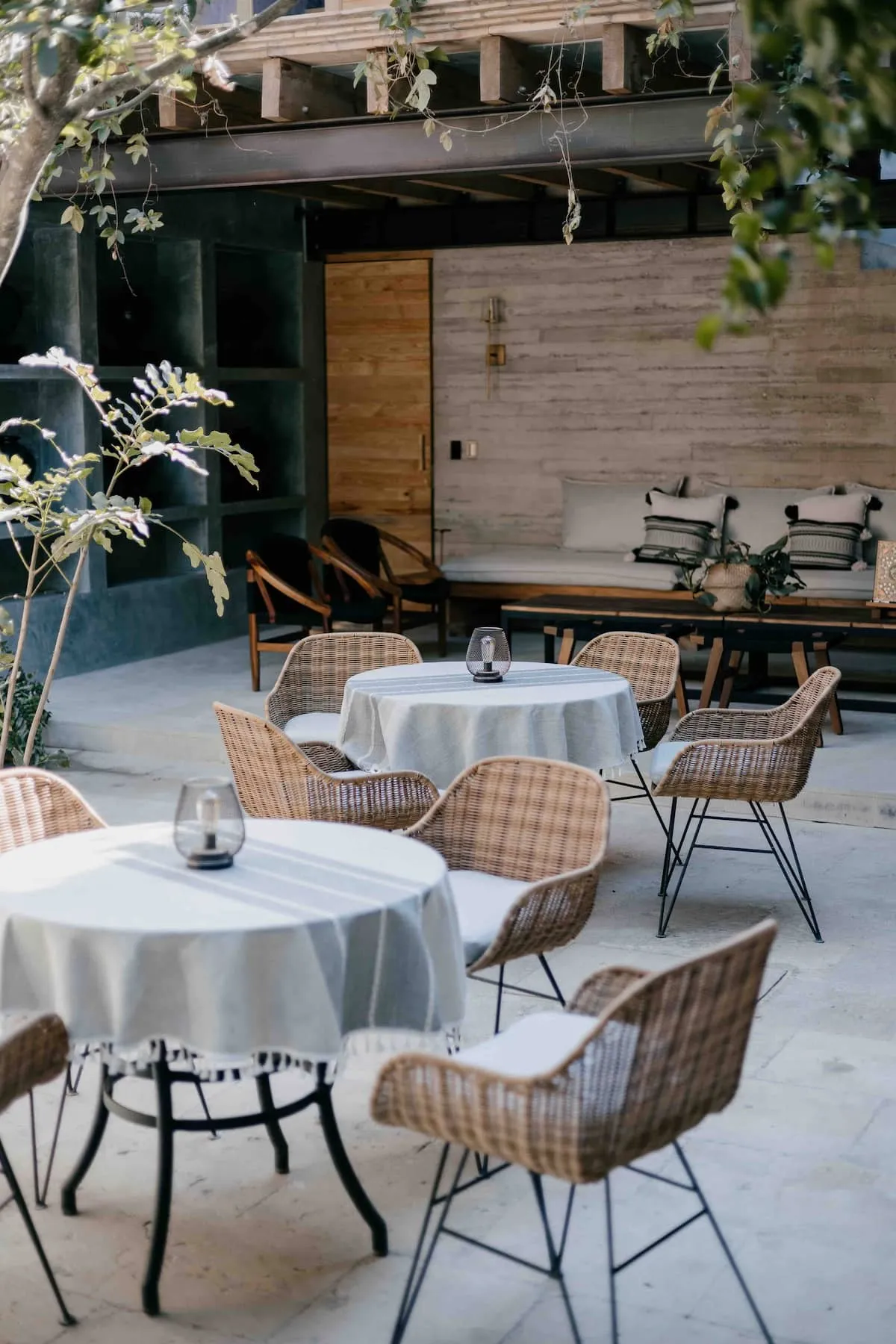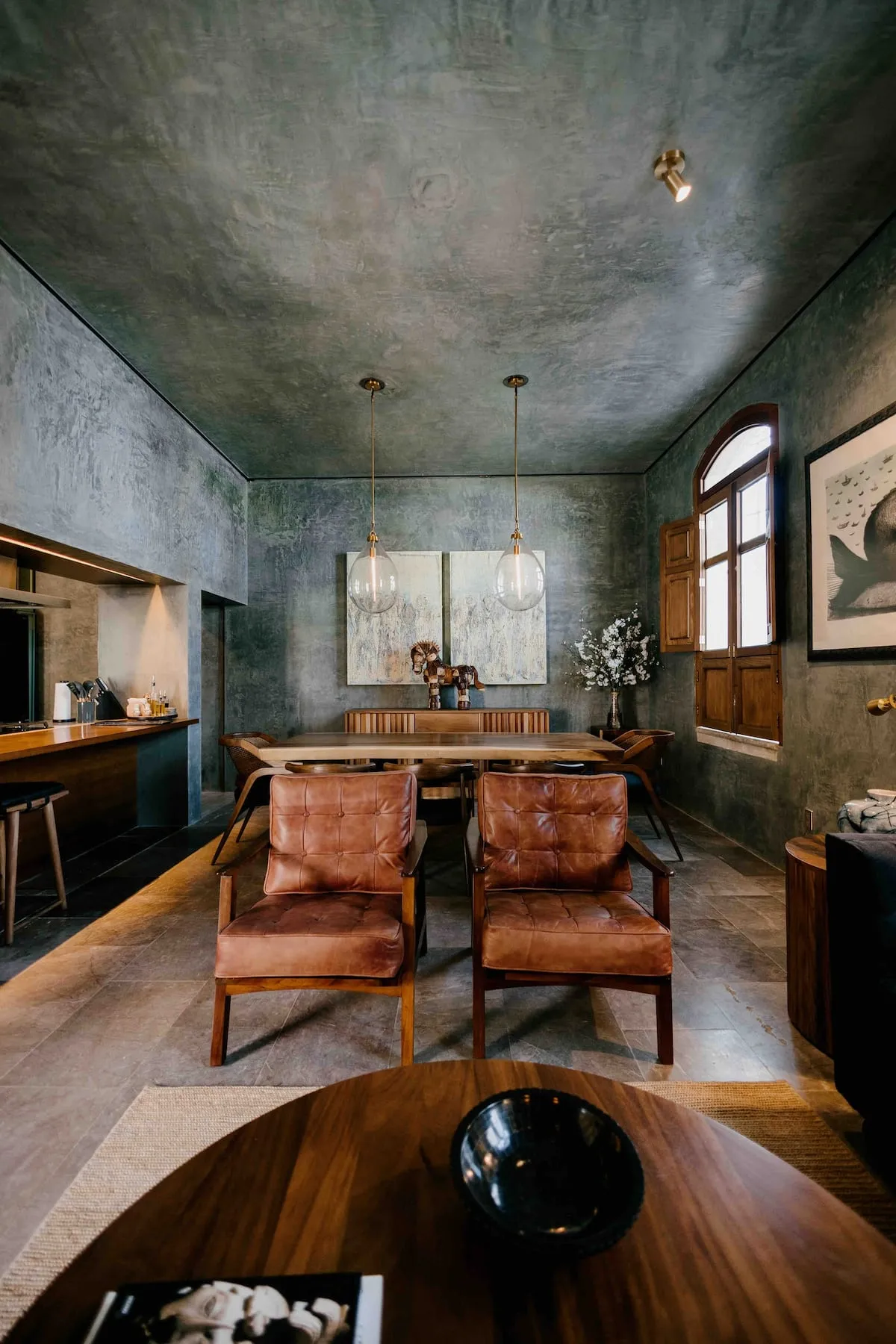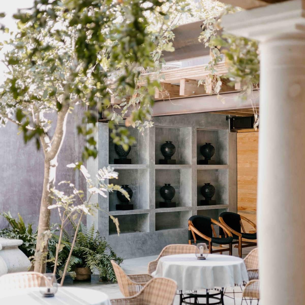 Finishes include lime-polished walls in local green tones characteristic of cantera stone, with the central courtyard highlighted in crimson. Vegetation is integrated throughout the design—patios, terraces, and walkways—to provide shade, freshness, and tranquility.
