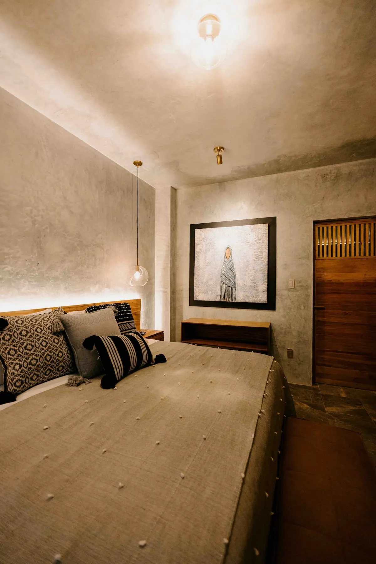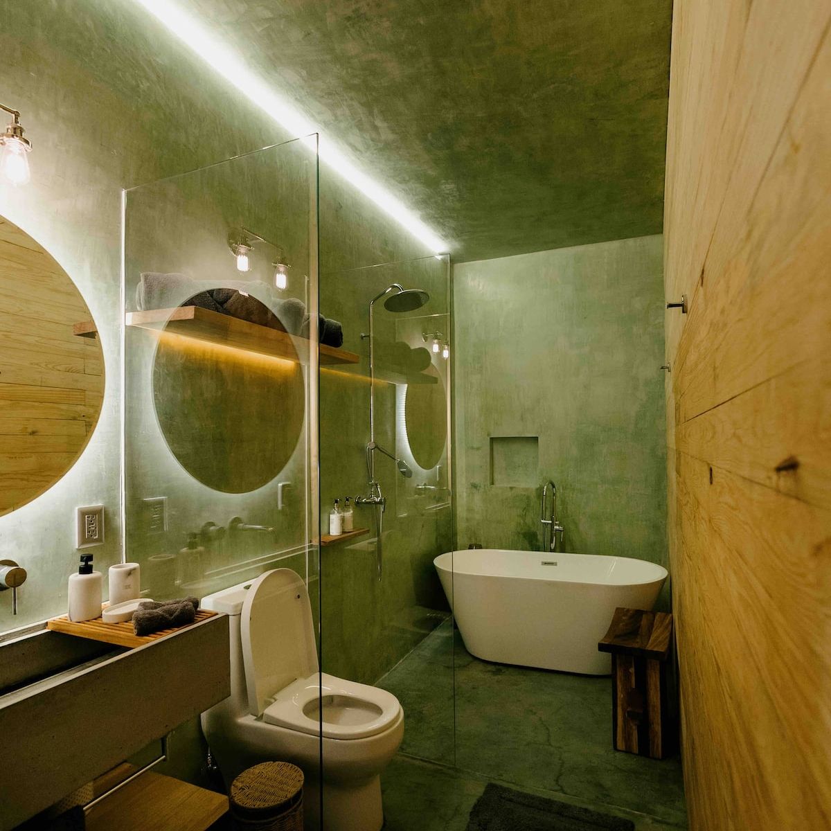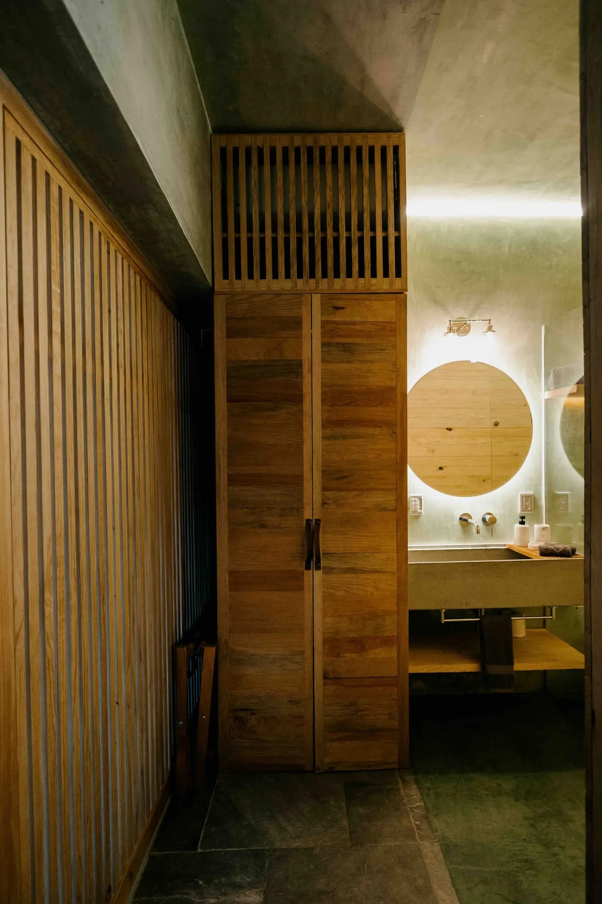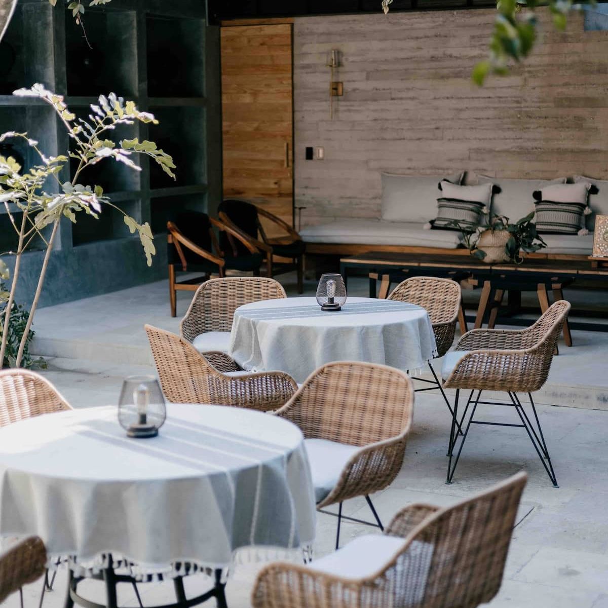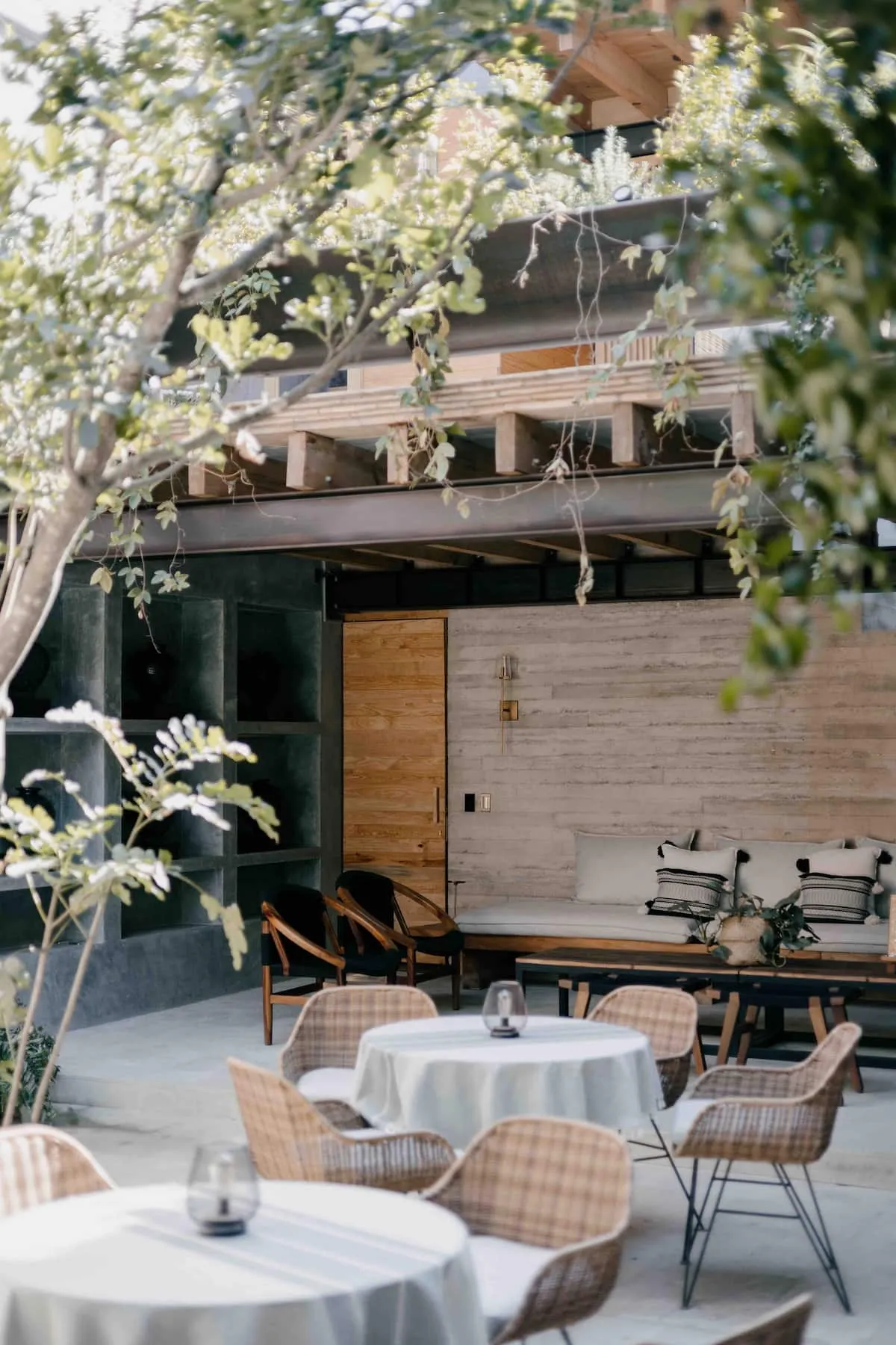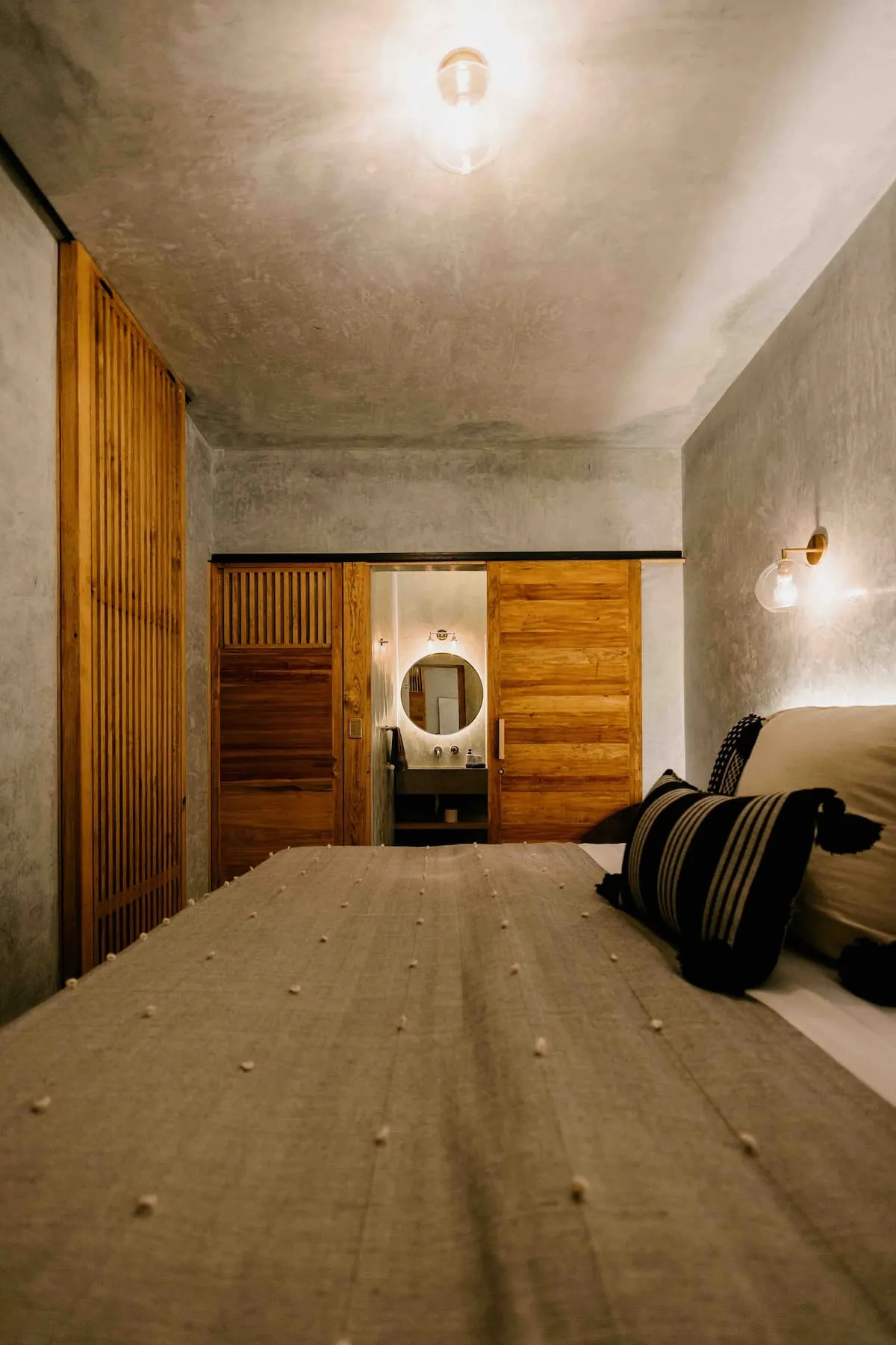 Finishes include lime-polished walls in local green tones characteristic of cantera stone, with the central courtyard highlighted in crimson. Vegetation is integrated throughout the design—patios, terraces, and walkways—to provide shade, freshness, and tranquility.