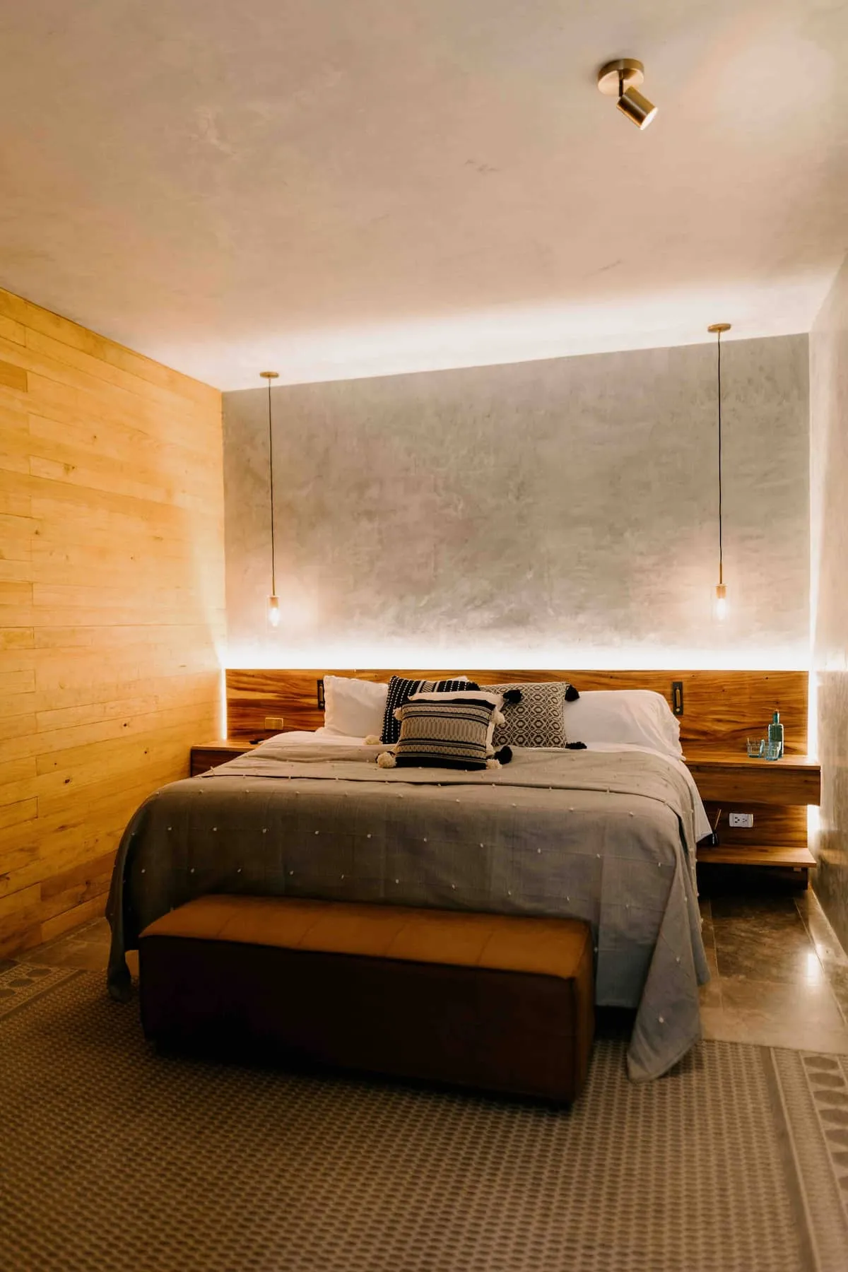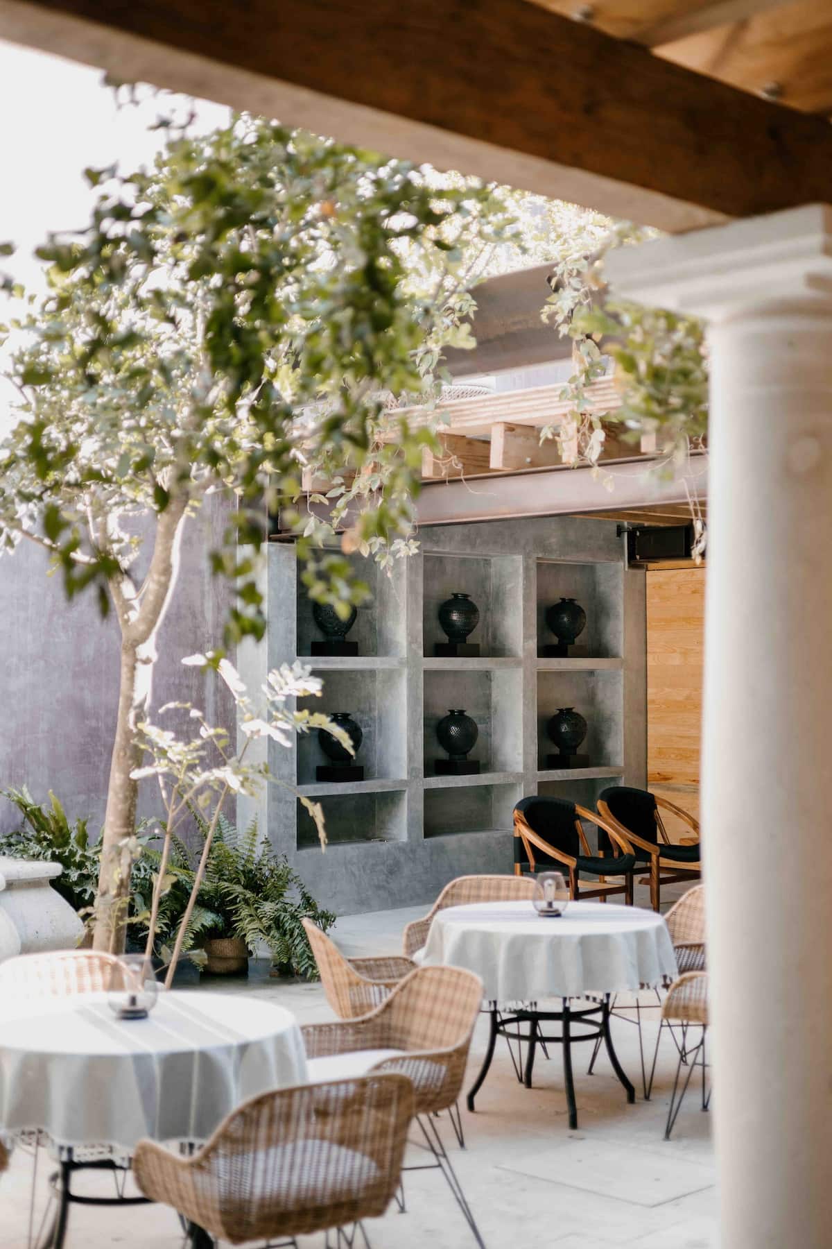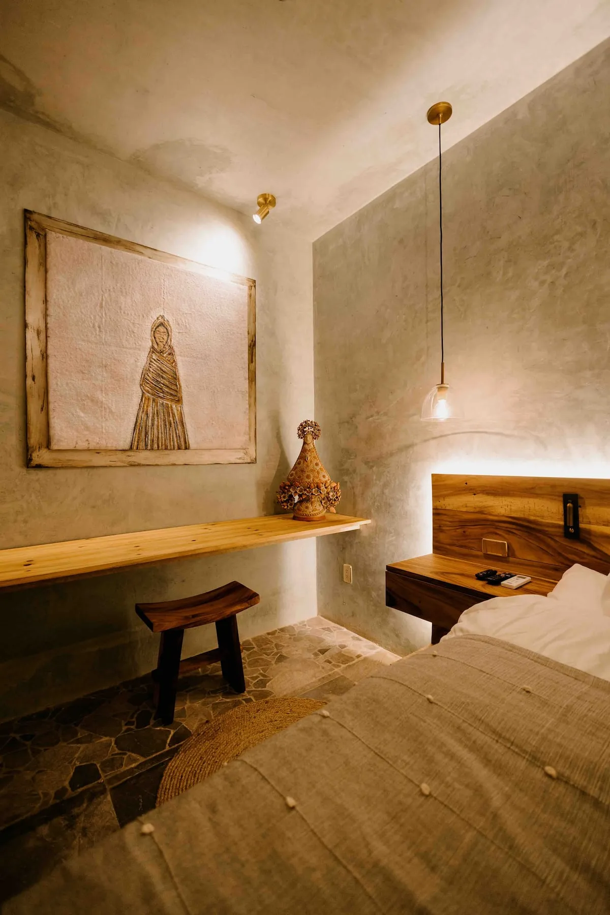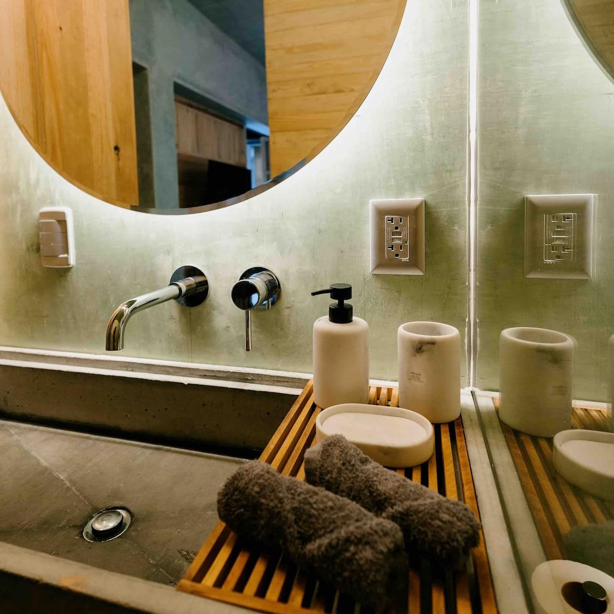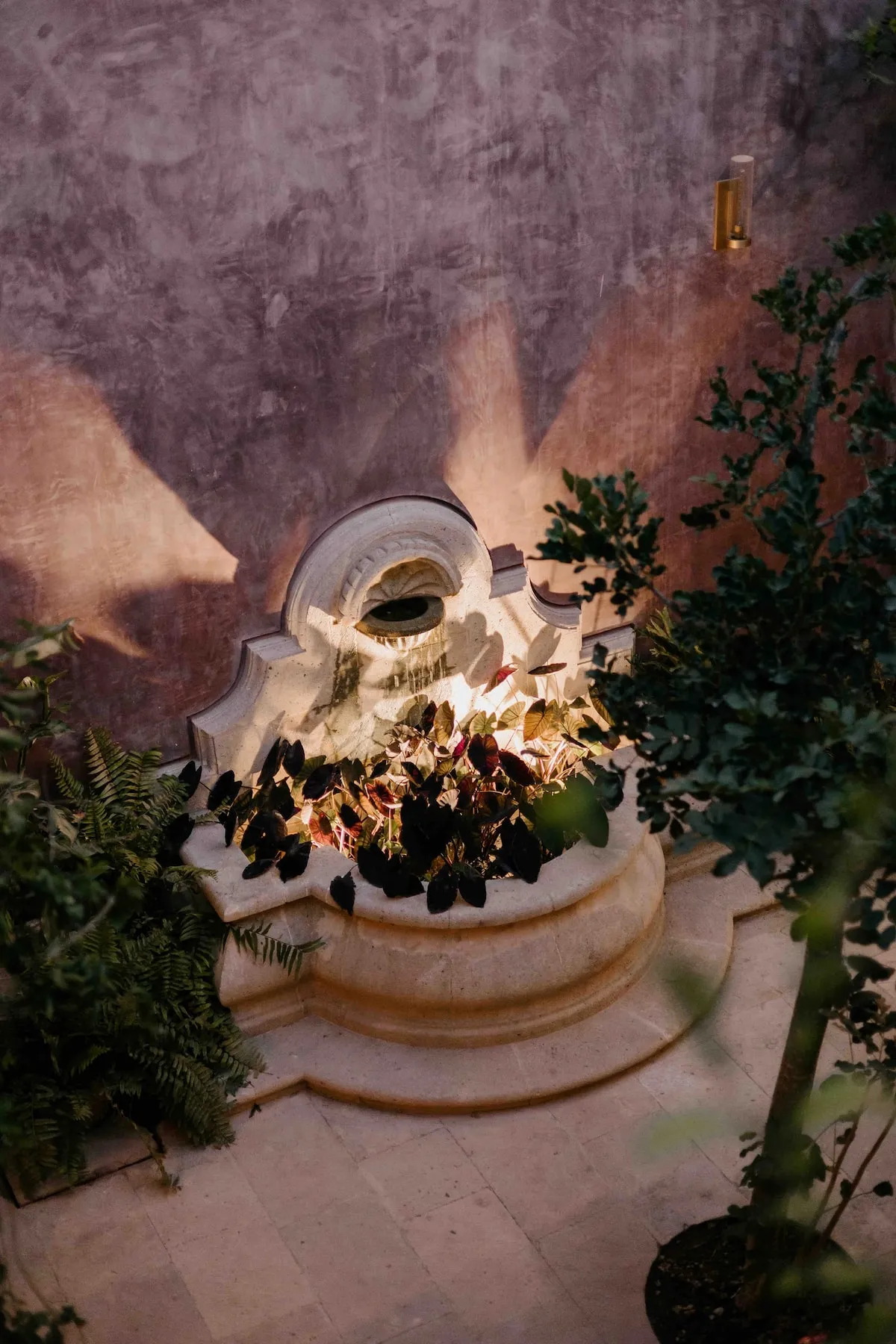 Finishes include lime-polished walls in local green tones characteristic of cantera stone, with the central courtyard highlighted in crimson. Vegetation is integrated throughout the design—patios, terraces, and walkways—to provide shade, freshness, and tranquility.