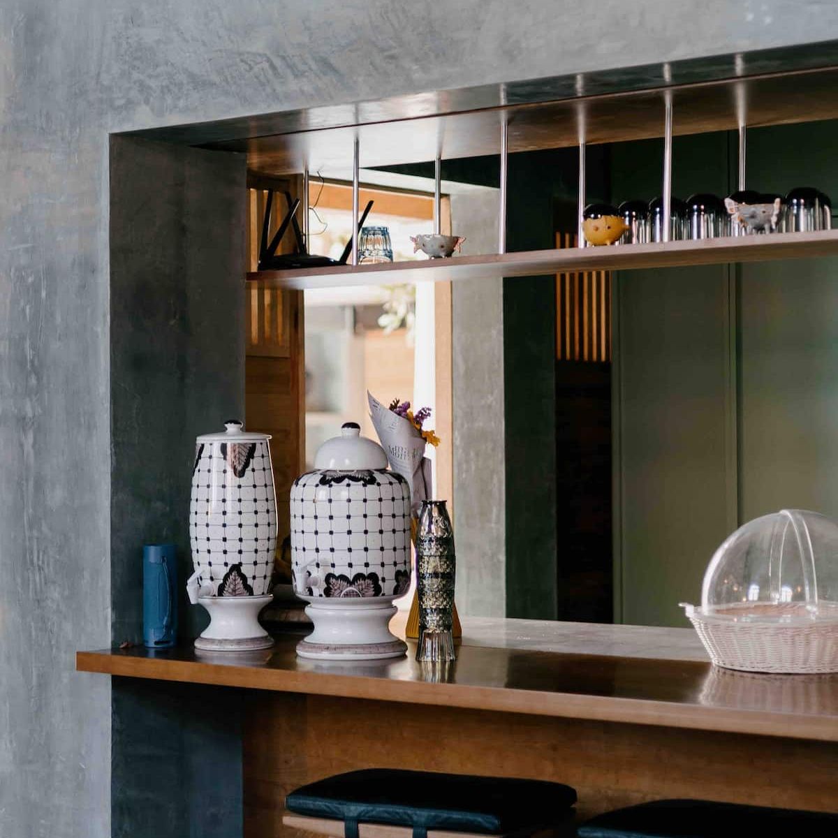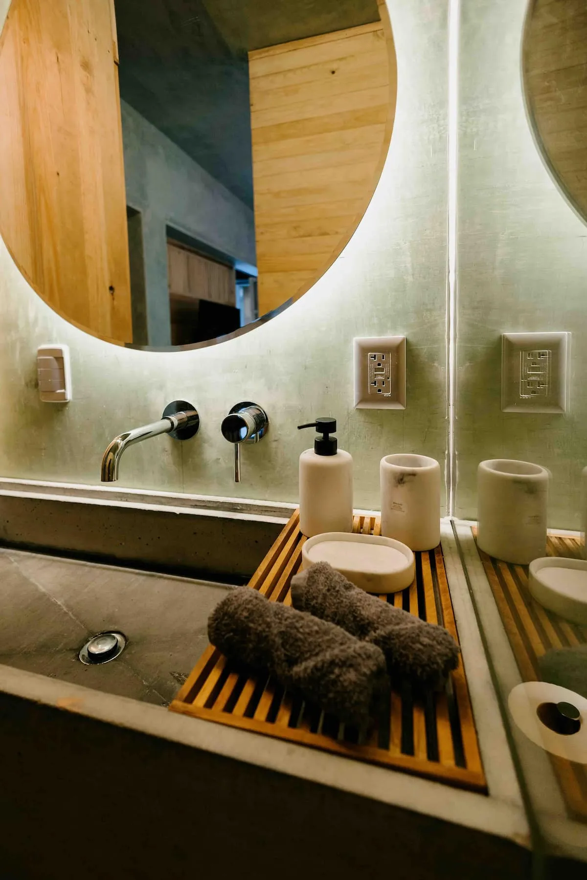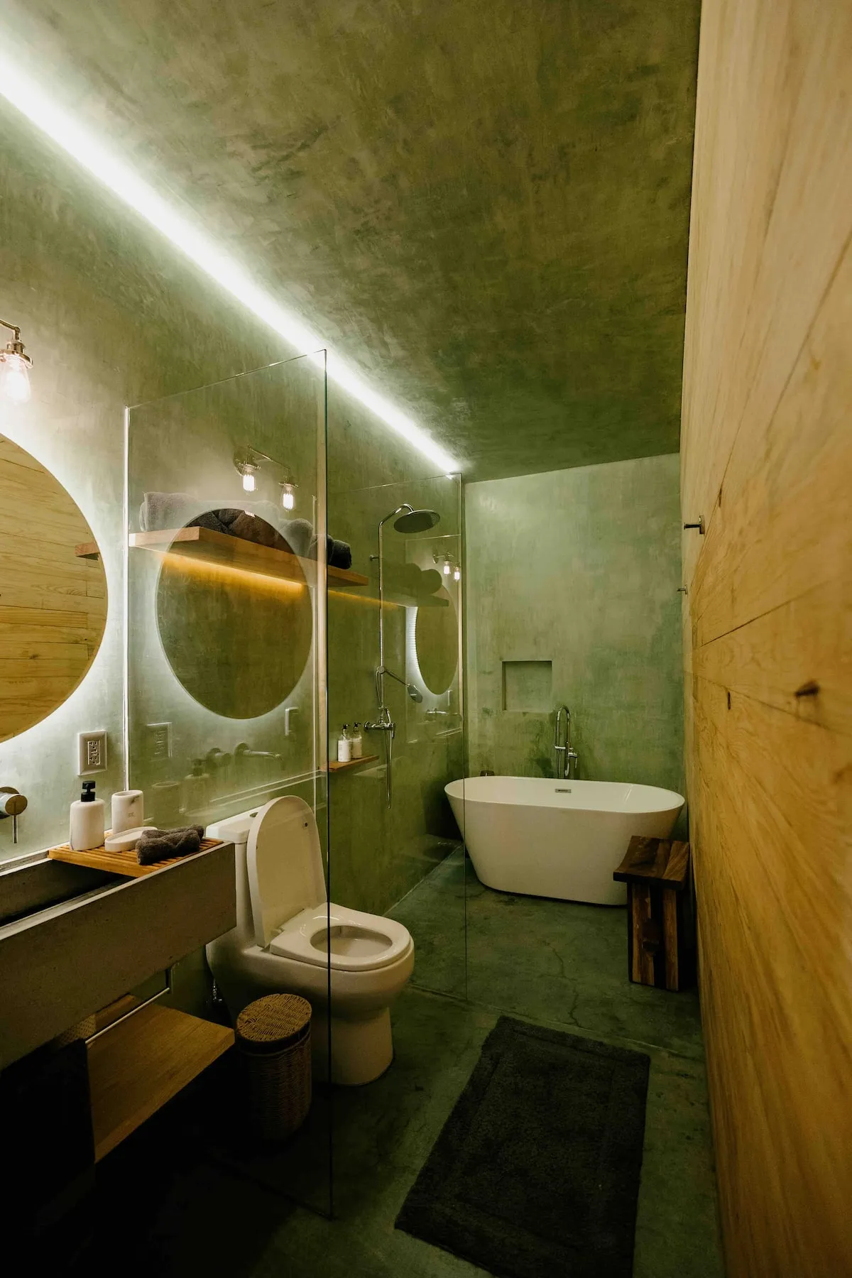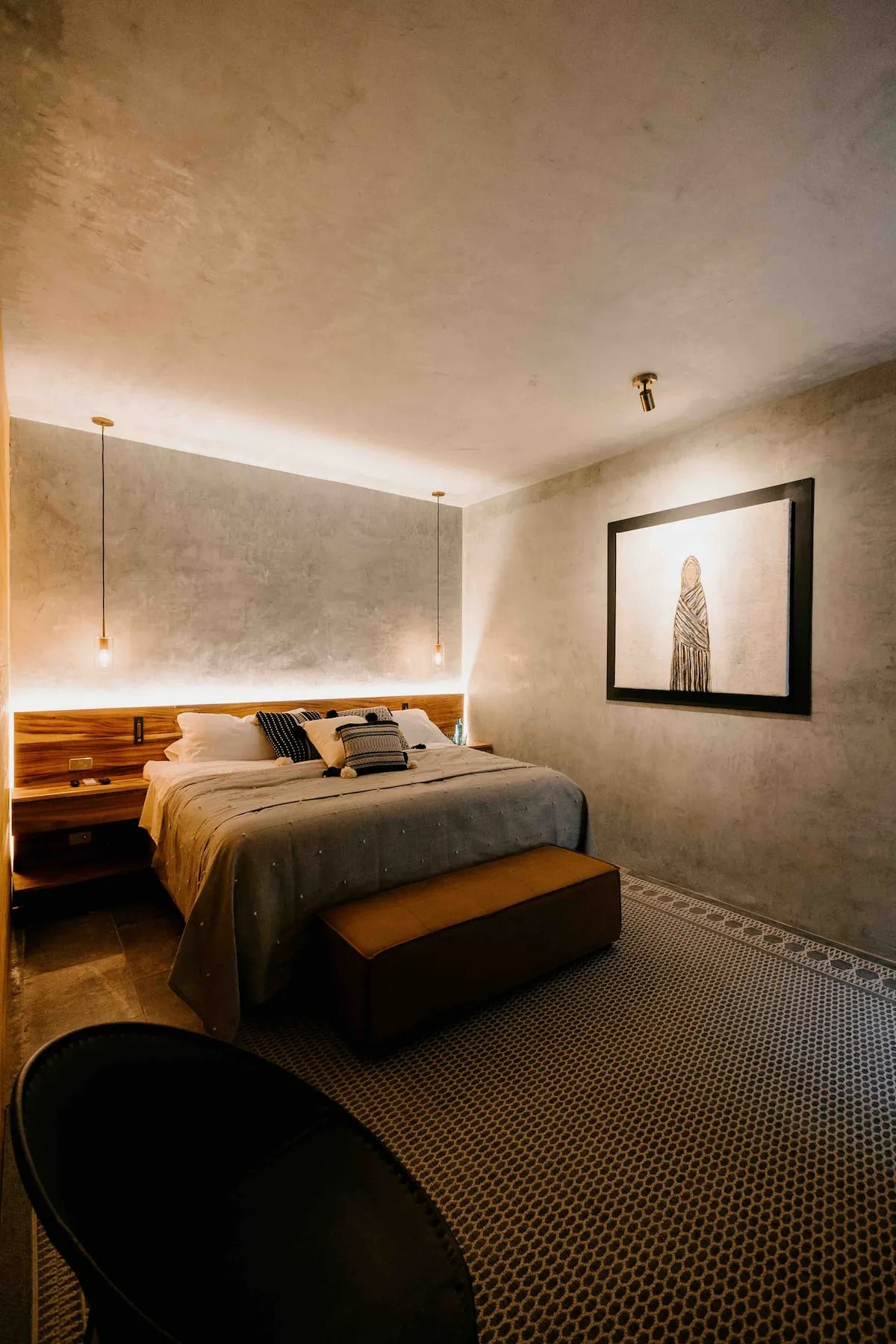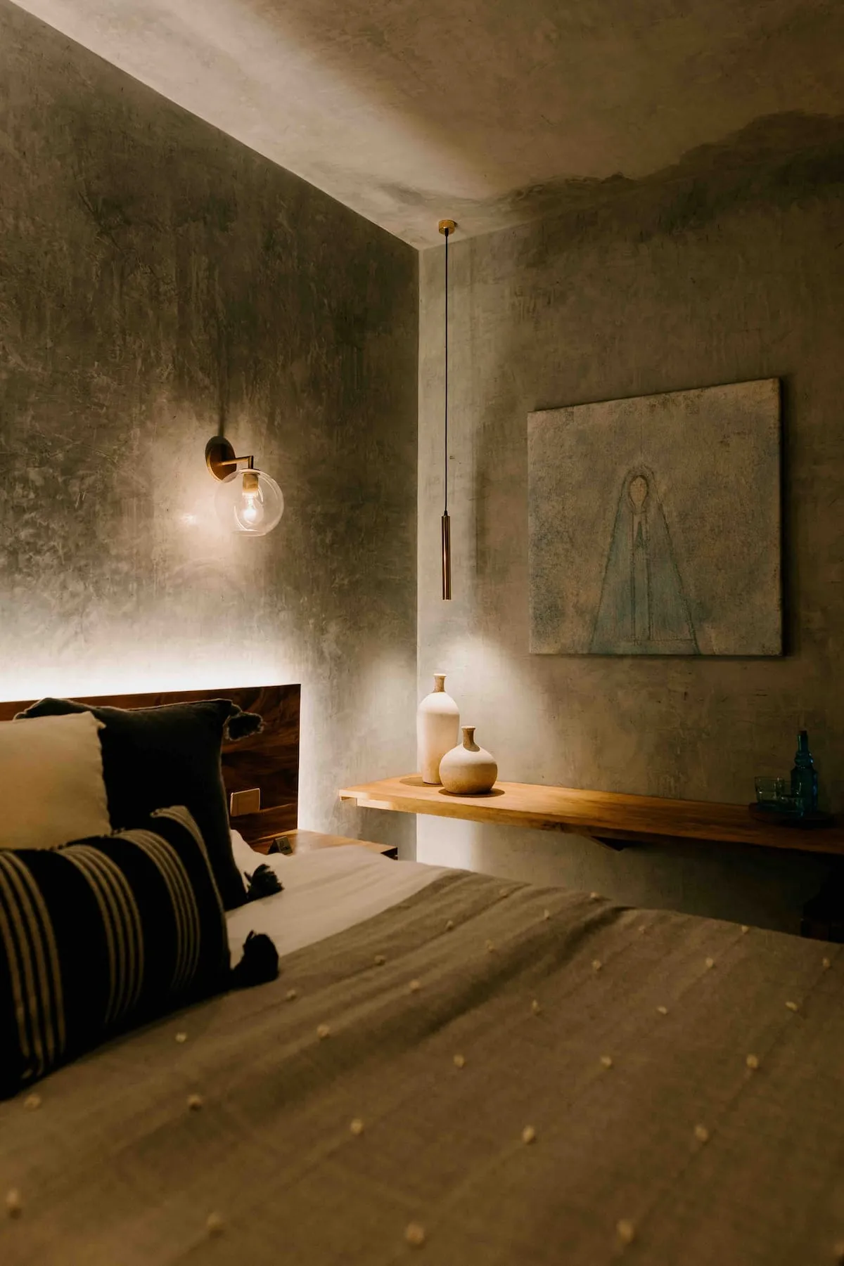 Finishes include lime-polished walls in local green tones characteristic of cantera stone, with the central courtyard highlighted in crimson. Vegetation is integrated throughout the design—patios, terraces, and walkways—to provide shade, freshness, and tranquility.