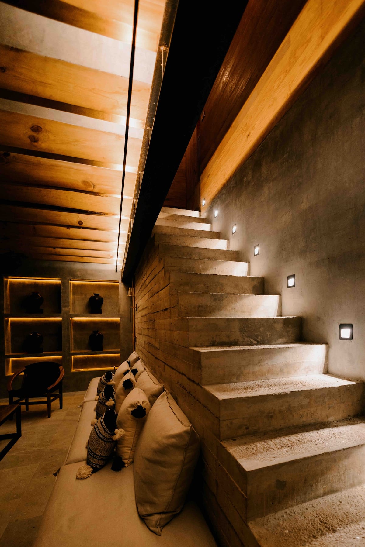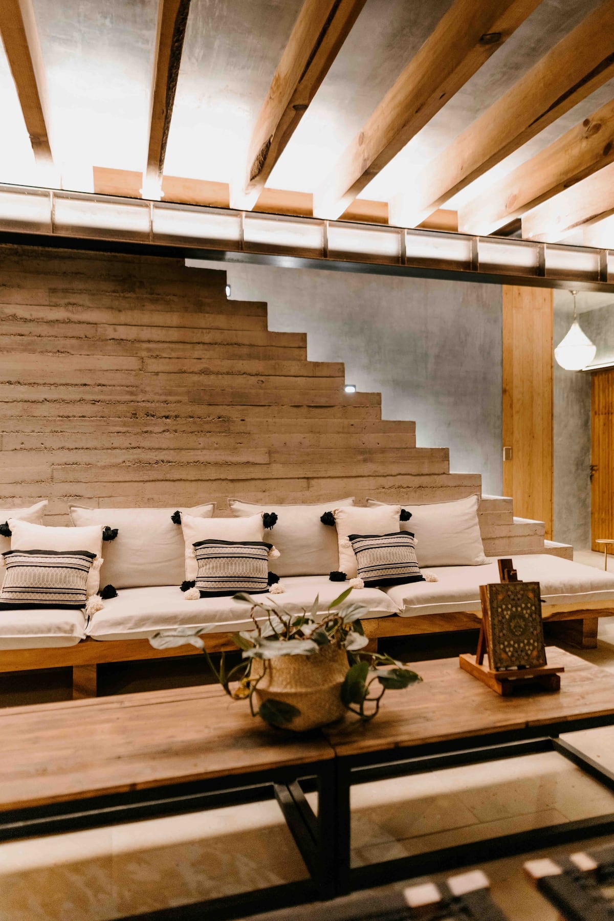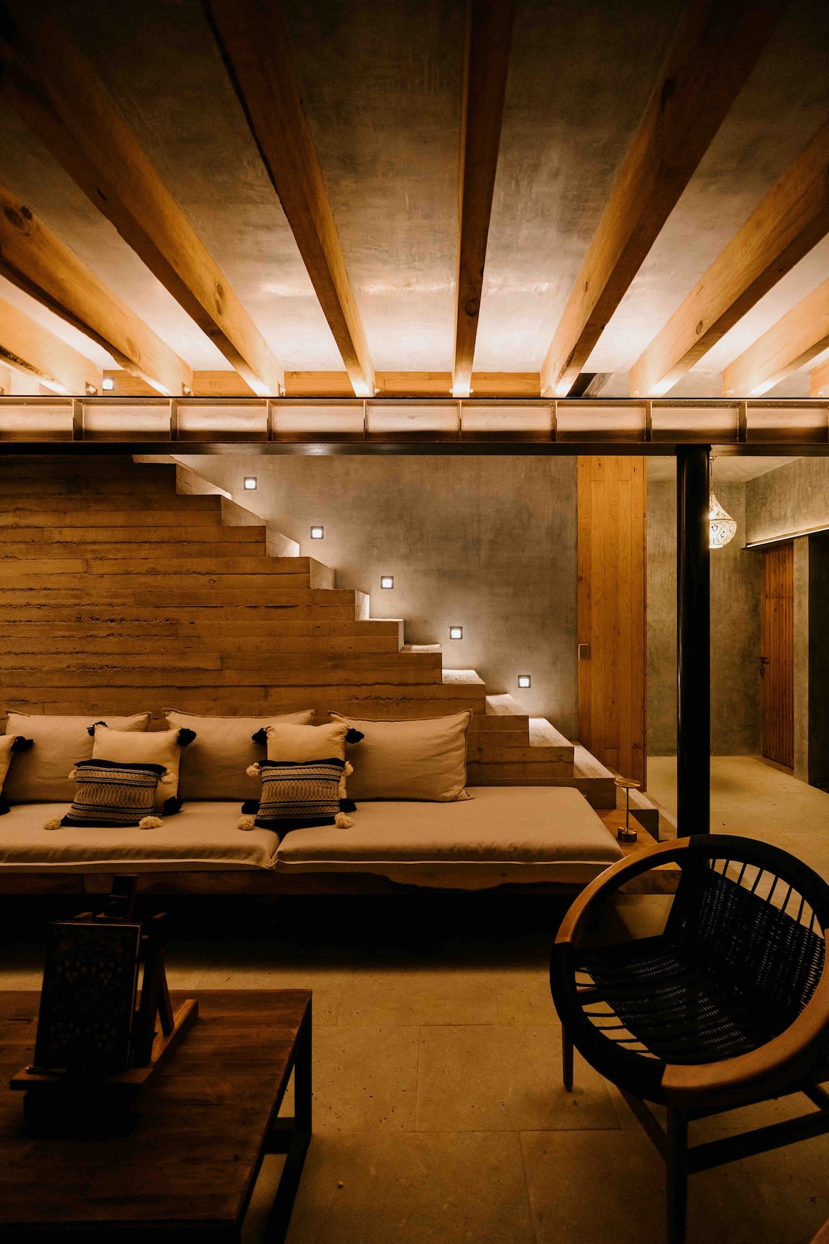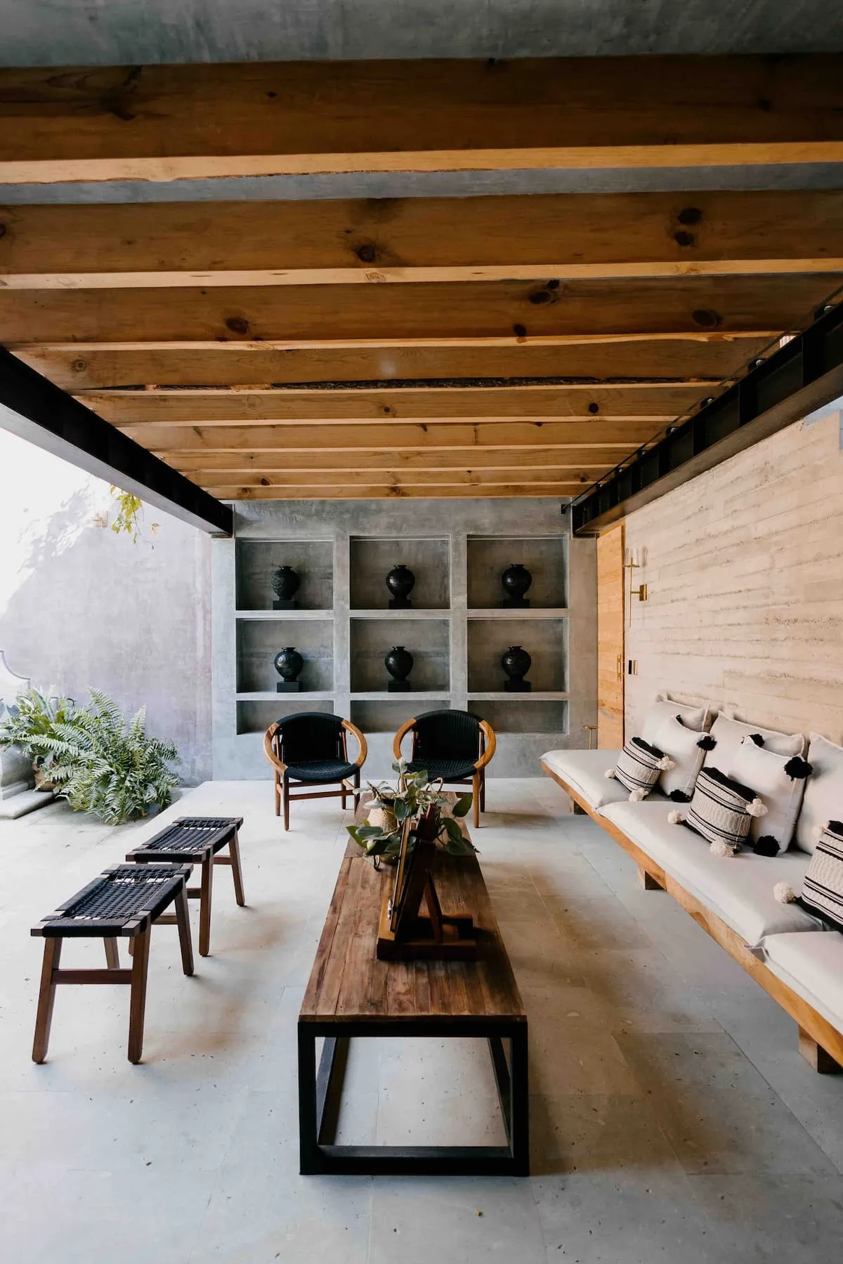The ground floor features four rooms opening onto a central courtyard, which links the living/dining area, bar, and kitchen. This area utilizes a steel structure integrating cantera stone columns with wooden beams and terracotta bricks to support planters. A concrete staircase leads to the upper floor, where two bedroom pavilions were added. The junior room is closed and introspective, while the master bedroom opens entirely to terraces with views of Santo Domingo.