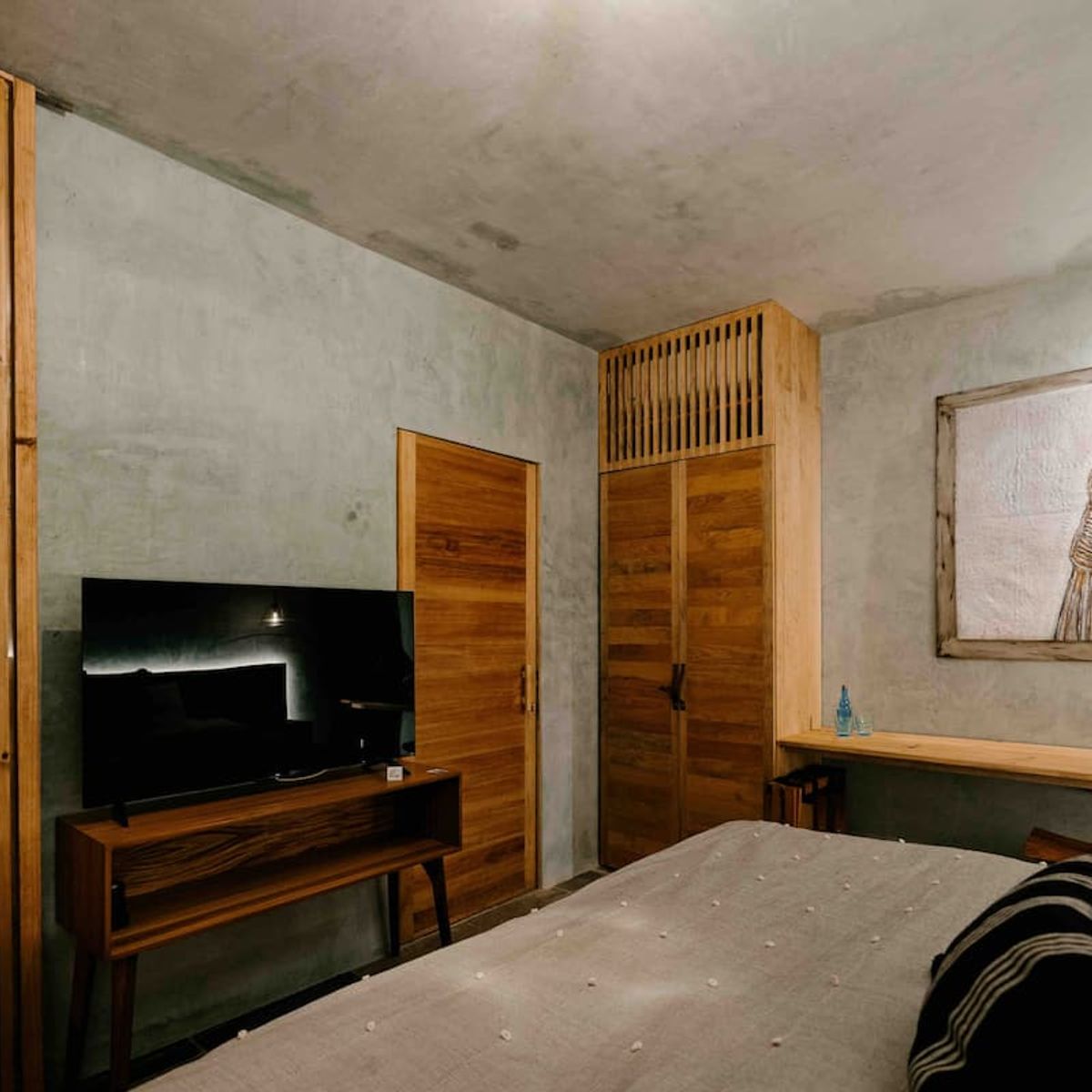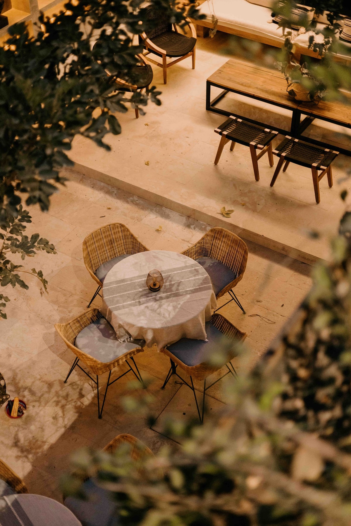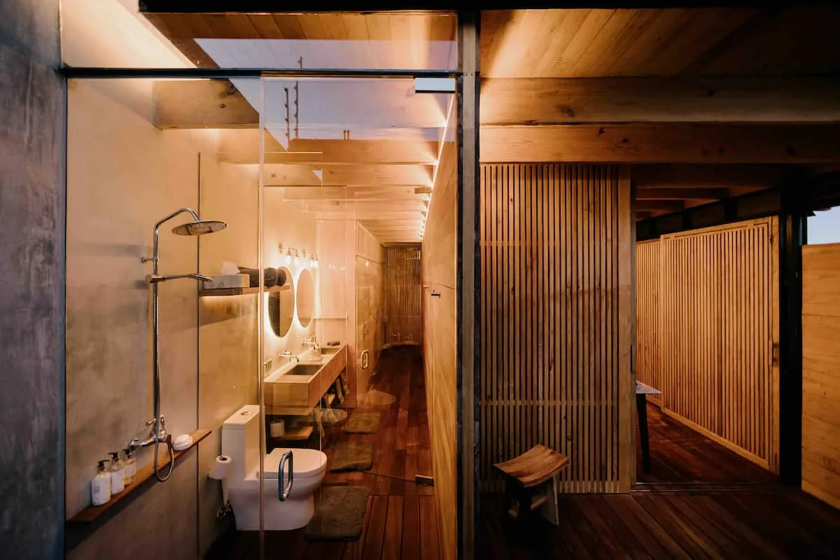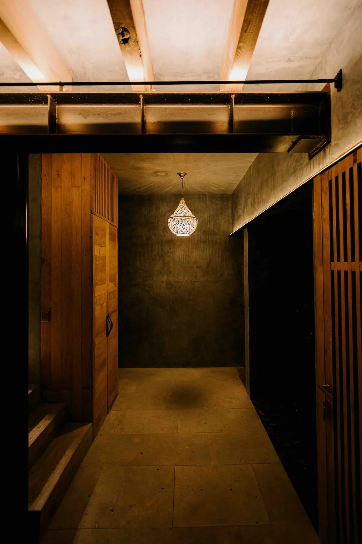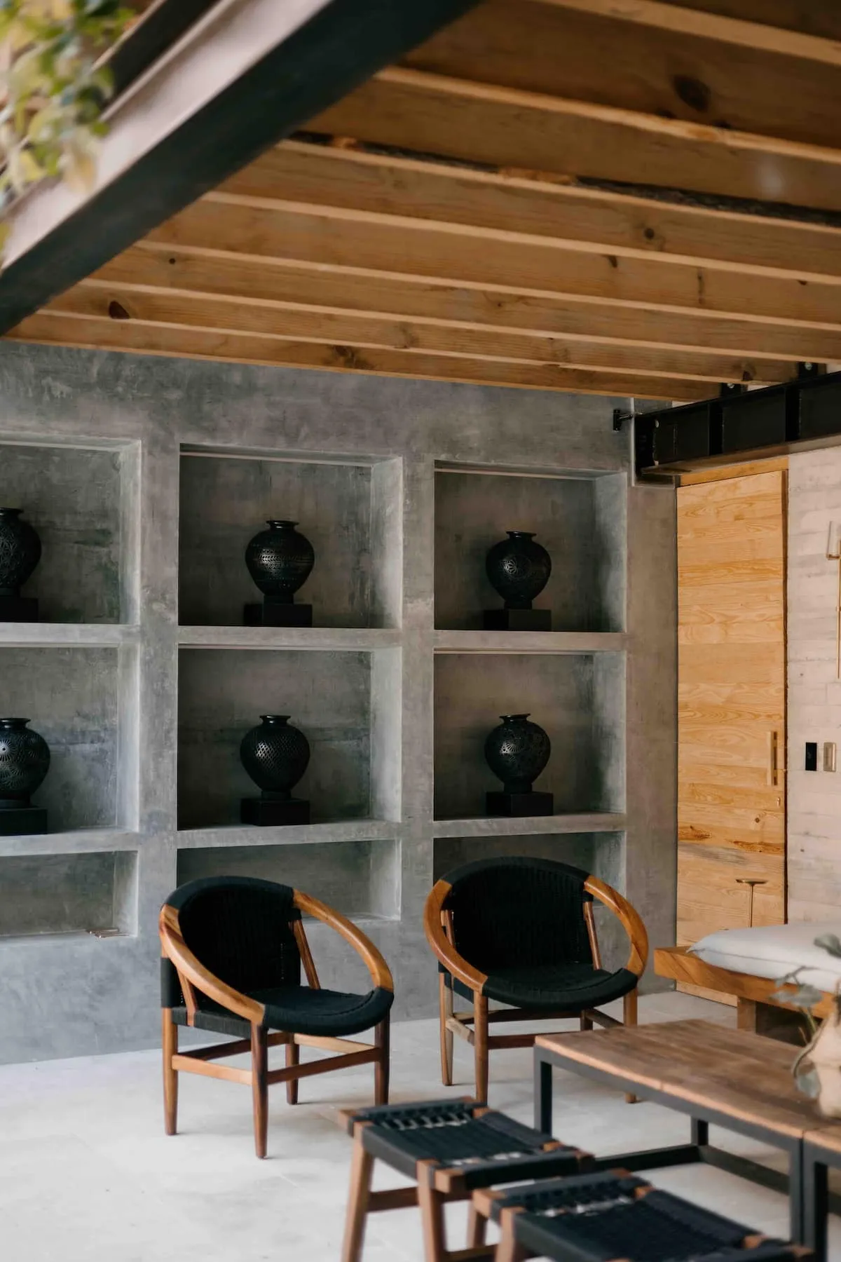 The ground floor features four rooms opening onto a central courtyard, which links the living/dining area, bar, and kitchen. This area utilizes a steel structure integrating cantera stone columns with wooden beams and terracotta bricks to support planters. A concrete staircase leads to the upper floor, where two bedroom pavilions were added. The junior room is closed and introspective, while the master bedroom opens entirely to terraces with views of Santo Domingo.