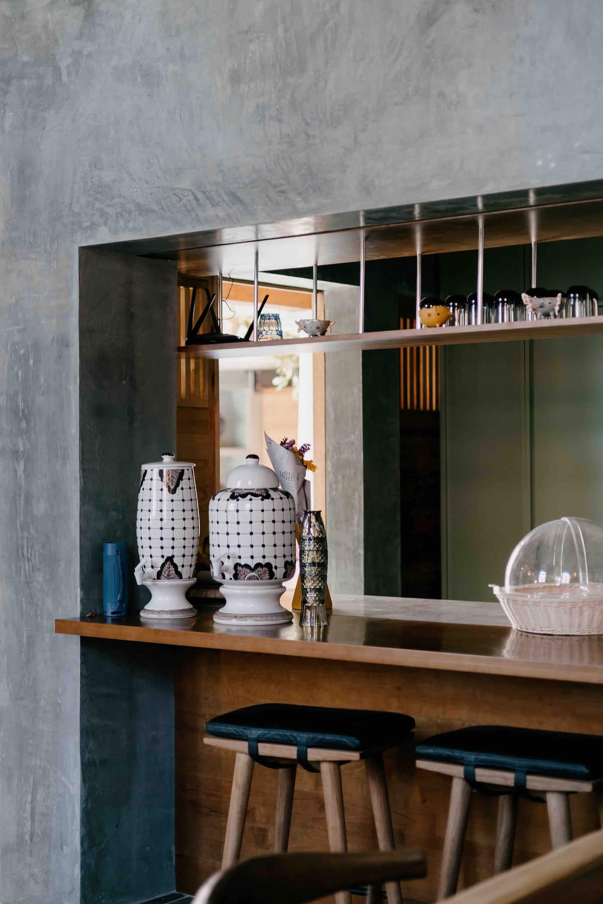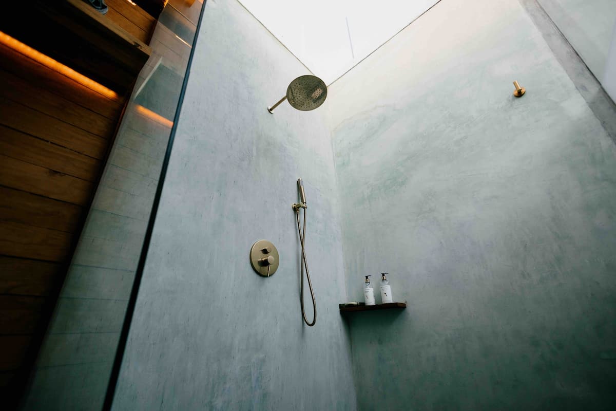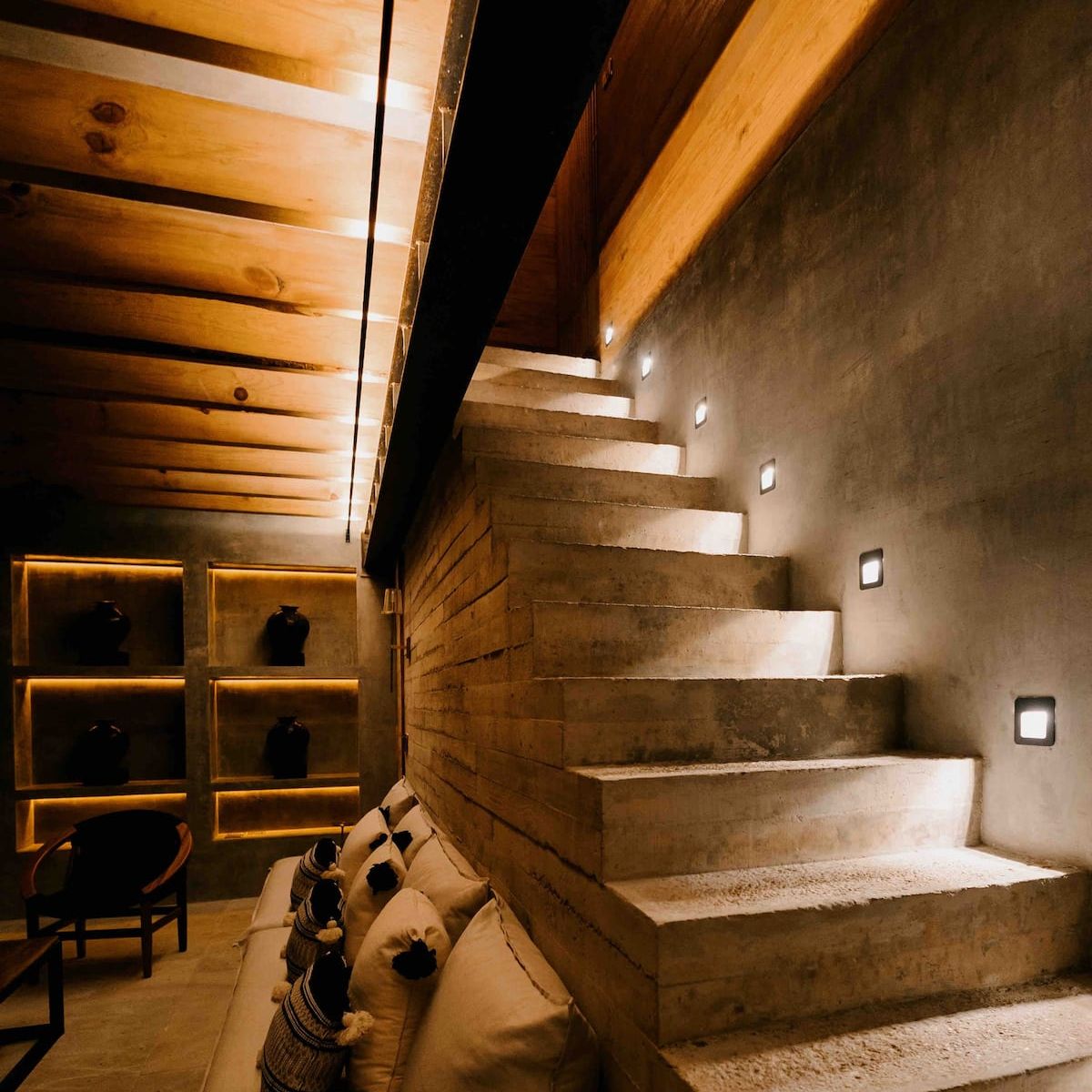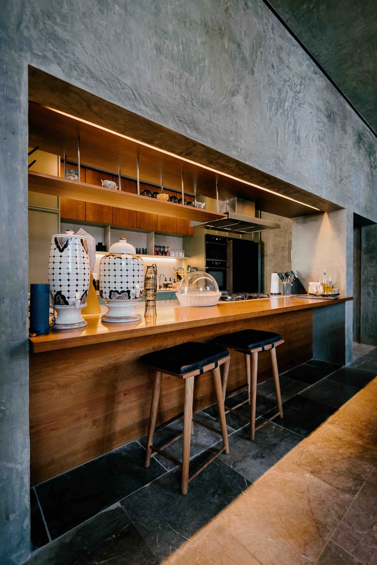 The ground floor features four rooms opening onto a central courtyard, which links the living/dining area, bar, and kitchen. This area utilizes a steel structure integrating cantera stone columns with wooden beams and terracotta bricks to support planters. A concrete staircase leads to the upper floor, where two bedroom pavilions were added. The junior room is closed and introspective, while the master bedroom opens entirely to terraces with views of Santo Domingo.