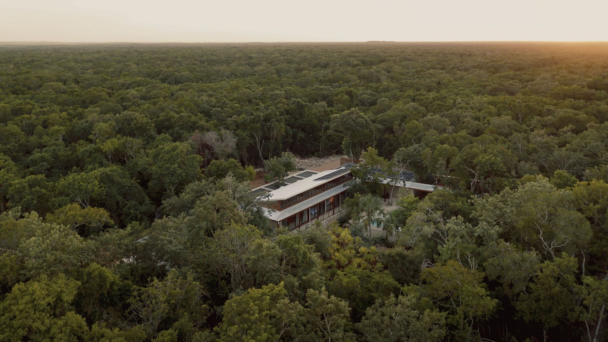 The project is entirely off-the-grid, powered by solar energy and featuring its own wastewater treatment system. It primarily uses local materials like limestone, chukum plaster, and sustainably sourced wood. This approach highlights the studio’s commitment to a low carbon footprint and a design that respects the Caribbean landscape.