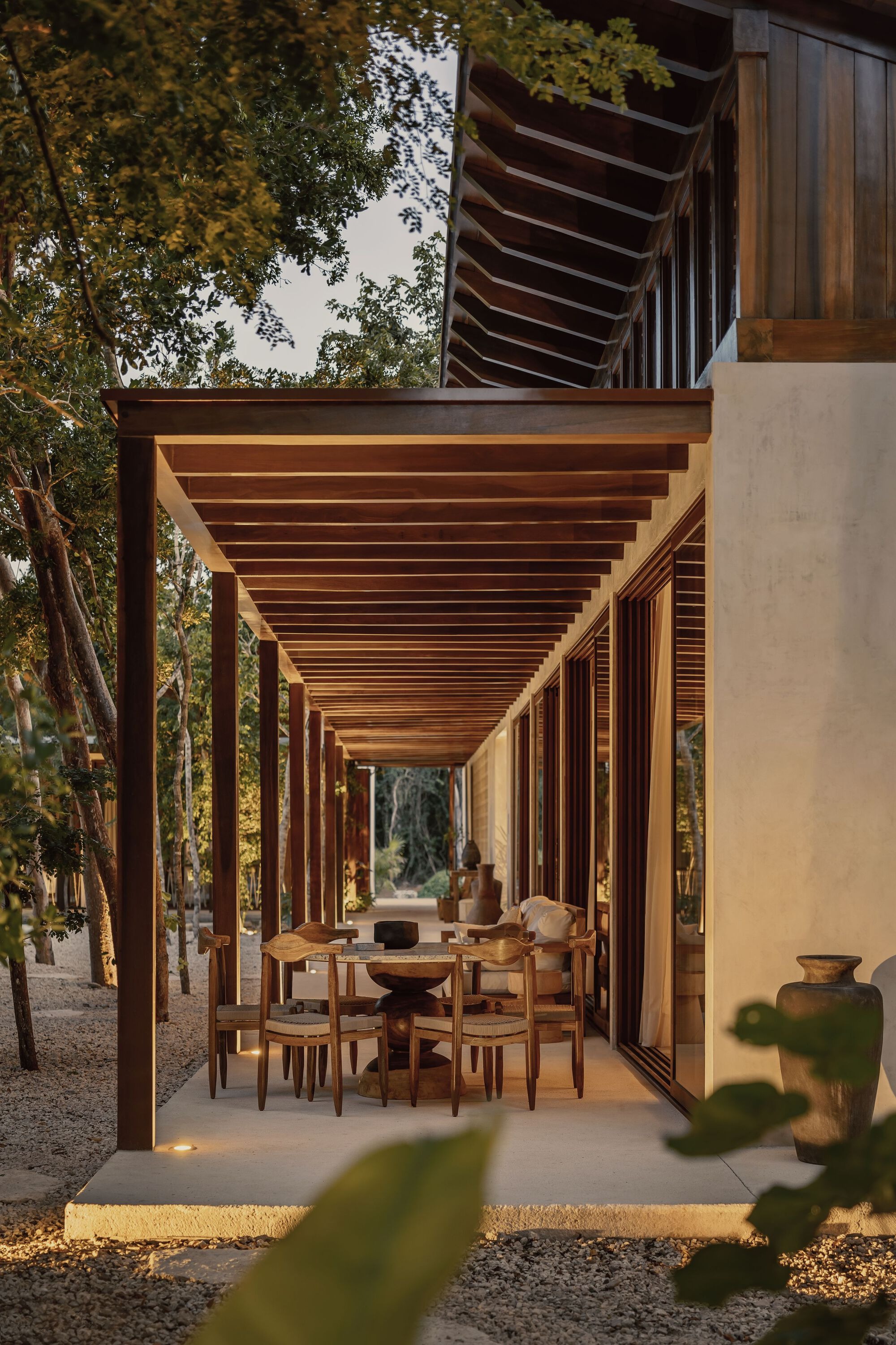 The architecture draws inspiration from traditional Mexican haciendas, using a long open-air terrace as the main hallway. This layout blurs the line between indoors and outdoors, giving each bedroom its own private patio and outdoor bath. High ceilings help keep the interior cool while providing expansive views of the surrounding tropical greenery.