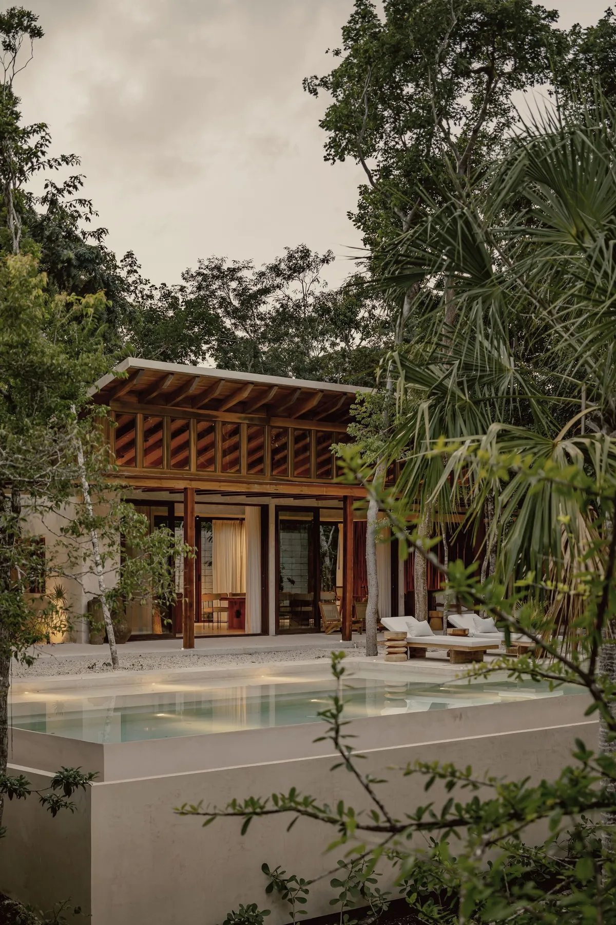 Casa Tropical, designed by Jaque Studio in Tulum, is an L-shaped residence built around a natural spring and existing jungle trees. By preserving 77% of the original vegetation, the design ensures the home remains deeply integrated with its environment. The narrow floor plan allows for constant cross-ventilation and natural light in every room.