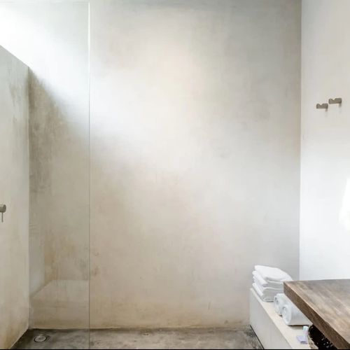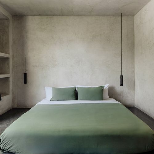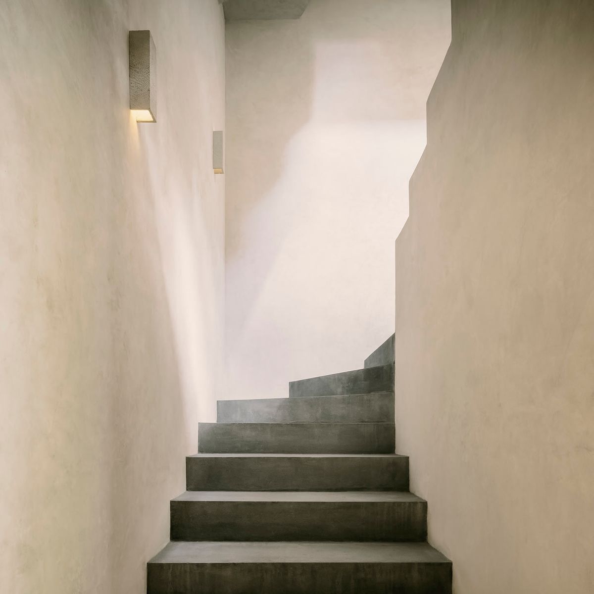 The house is oriented east-west, taking advantage of the prevailing winds and cross ventilation. North-oriented skylights fill the different spaces with indirect natural light, creating soft contrasts of light and shadow reflected through the house. Designed and built by CO-LAB, the house is surfaced with handmade finishes. The warm grey polished cement walls contrast with black terrazzo floors. Charred cedar wood carpentry complements the neutral palette.