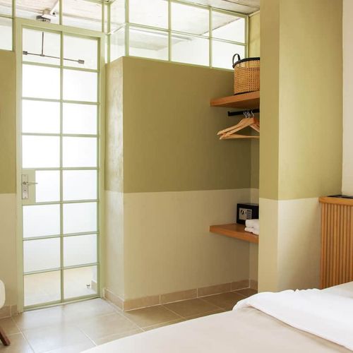 The penthouse is located in a tastefully remodeled building and boasts a practical layout designed for comfort. It features two rooms, each furnished with a queen-size bed and equipped with air conditioning for a restful night's sleep. A highlight of the apartment is its peaceful terrace, perfect for unwinding and soaking in the city views.